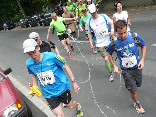 Eine eher lustige Begebenheit passiert bei einer weiteren PP-Pause. Ein Mädchen muss mal und die Meute steht mit dem Rücken zu ihr. Dann kommt von vorne Zug auf die Kette und das Mädchen wird auf die Strecke gerissen, die Laufhose gerade zur Hälfte hinten hoch gezogen. Einige weiter hinten feixen was vom Überholen mit einem nackten Hintern.