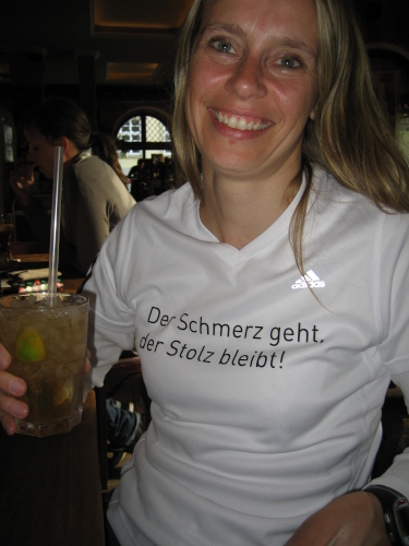 Der Blick auf meine Uhr sagte mir, dass das eine Bestzeit werden würde, an die ich vorher nicht im Traum gedacht hätte! Das Publikum stand auf den letzten Metern sehr dicht und feuerte mich an wie verrückt. Durch meinen Bauch jagten tausend Stromstöße. Vor mir das große Ziel, laute Musik. Ich riss die Arme hoch und schrie wie irre. Ich hatte es geschafft, ich war im Ziel! Und meine Uhr sagte 4:12:23 h, das hätte ich niemals gedacht! Kurz nach mir kamen Thomas und Willi und der Rest der Gruppe. Martin hatte seinen ersten Marathon in 4:13:59 h absolviert, Wahnsinn!