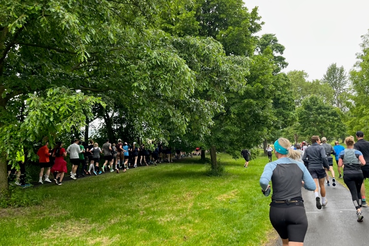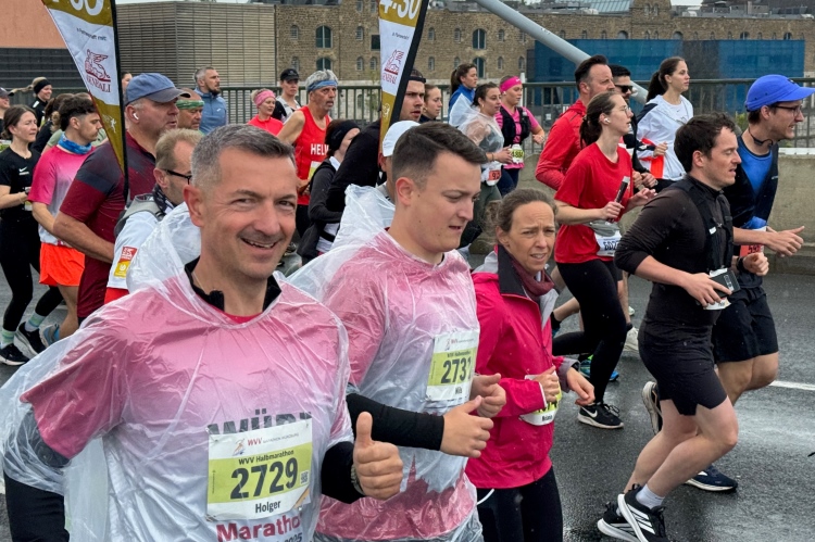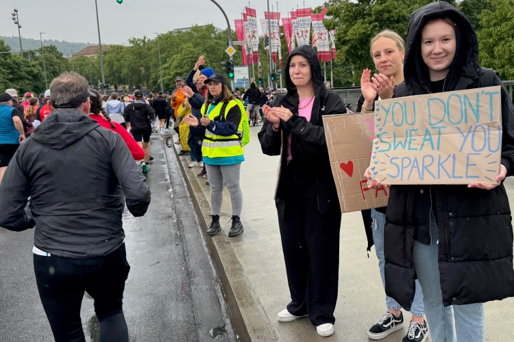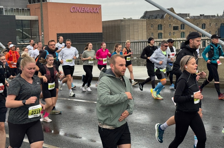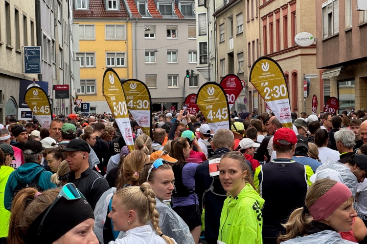 Bei der Taschenabgabe in der Halle herrscht etwas Gedränge. Kein Wunder, denn über 5000 Läuferinnen und Läufer stehen in den Meldelisten (ungefähr doppelt so viele wie im Vorjahr), was den unermüdlichen Helferinnen und Helferm einiges abverlangt. Judith und ich kommen dennoch mit Zeitpuffer im letzten Startblock an und treffen natürlich viele bekannte Marathonis.