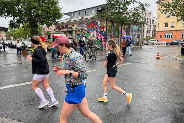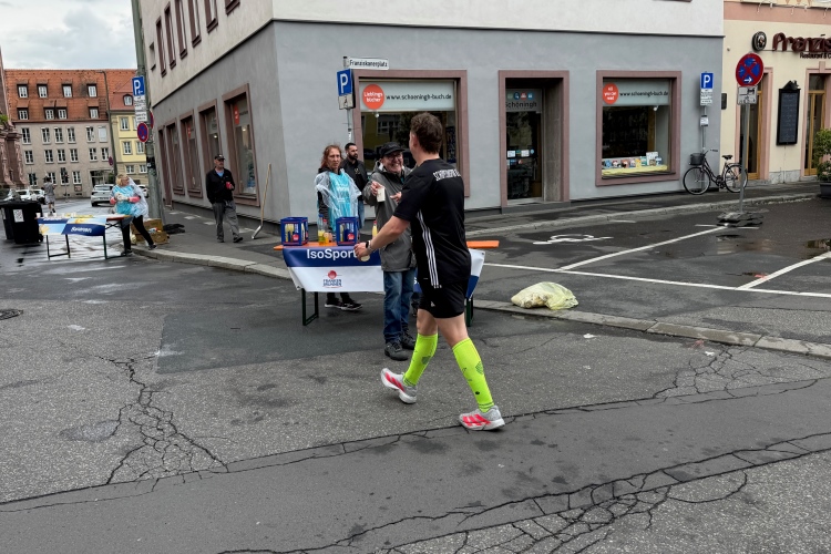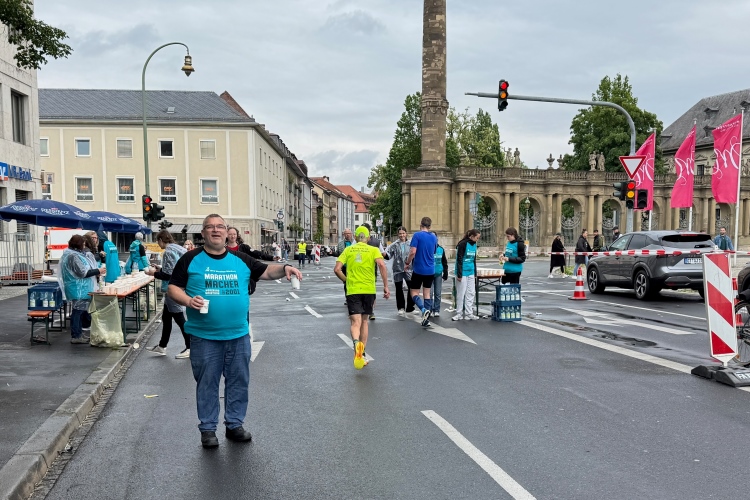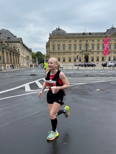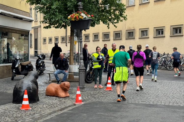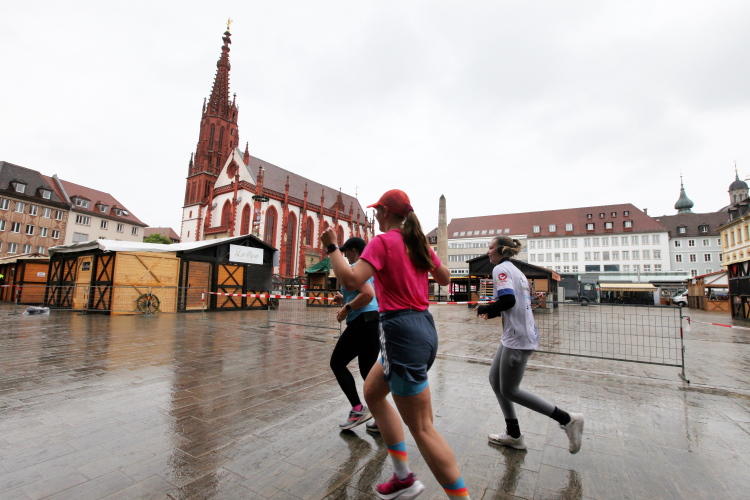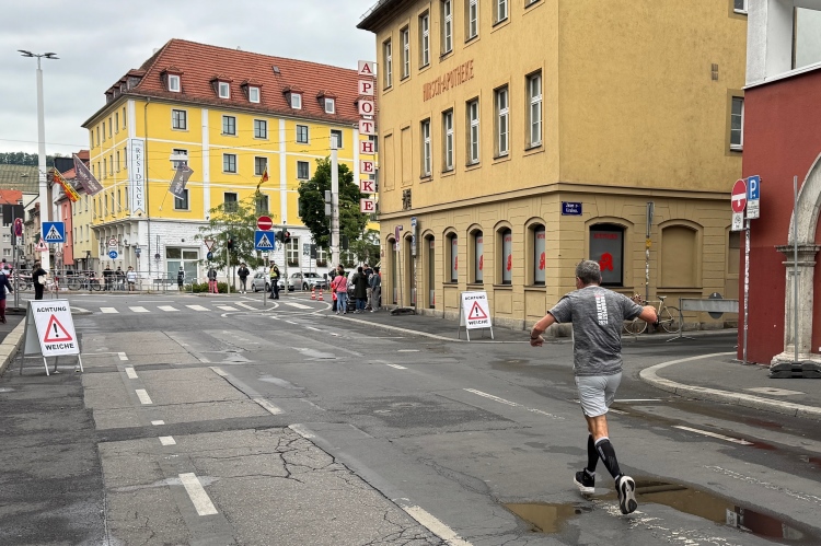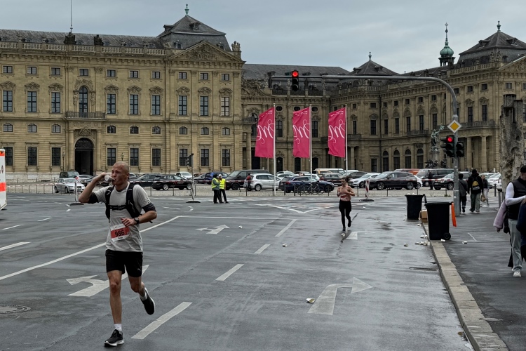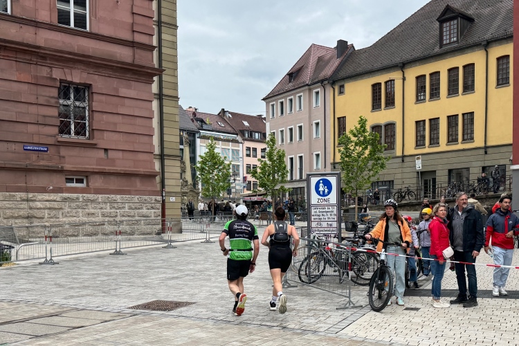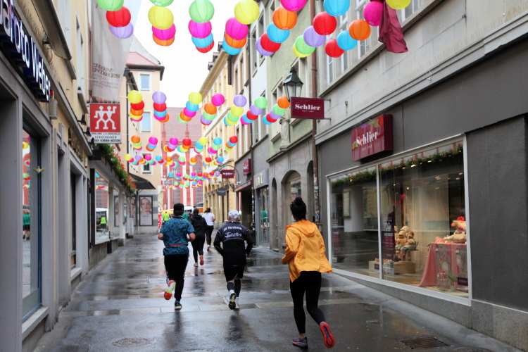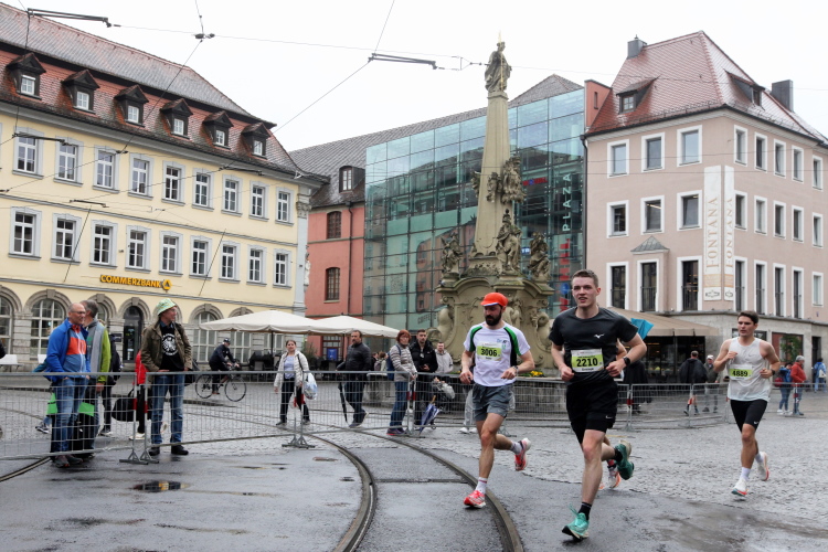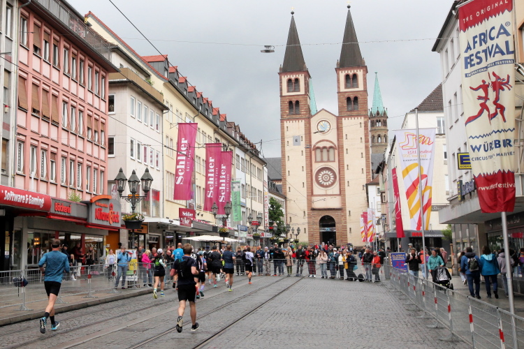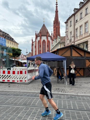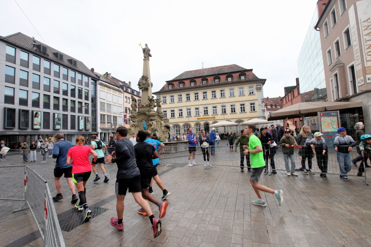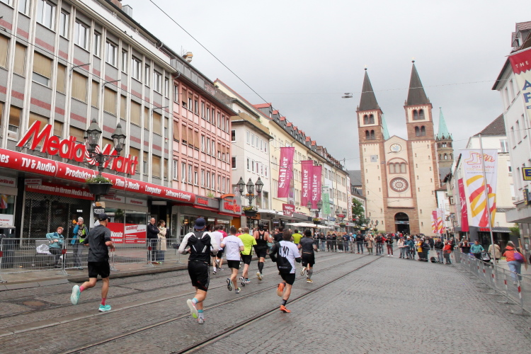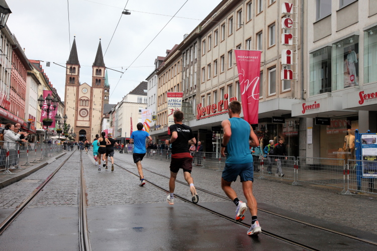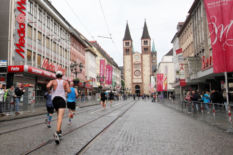 Rechts der Marktplatz, da kommen wir noch hin. Links das Neumünster und dann der Dom. Den sehen wir auch später noch mal. Der VP am Franziskanerplatz gibt noch mal Auftrieb. Generell sind die VPs gut organisiert: Wasser, Apfelschorle, Iso, Bananen und auf der zweiten Runde auch Cola-Mix. Alles gereicht von freundlichen Helferinnen und Helfern. Dazwischen auch noch Erfrischungspunkte,  die ausschließlich Wasser anbieten,  damit man auch bei Hitze immer genug Flüssigkeit bekommen würde.