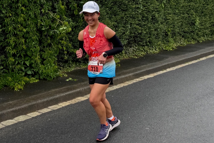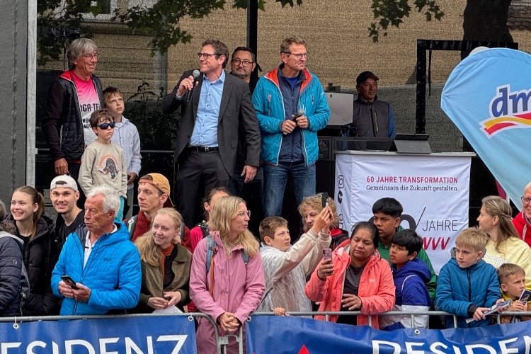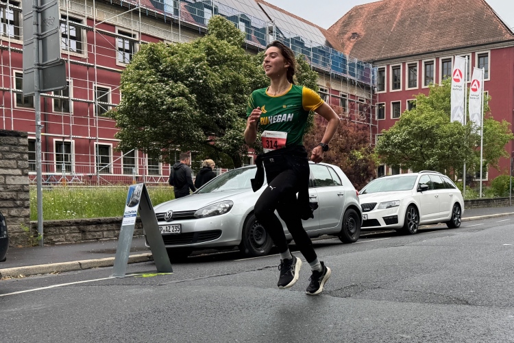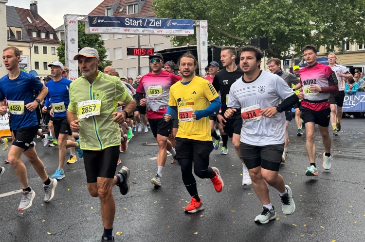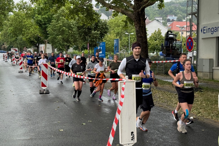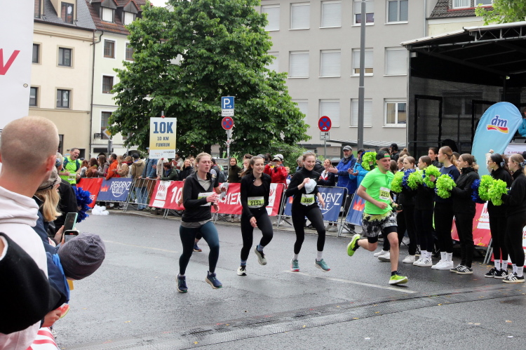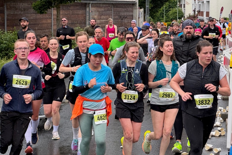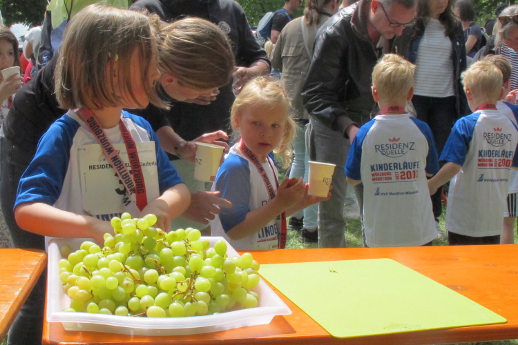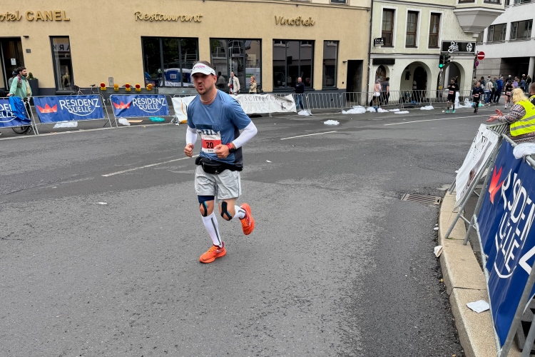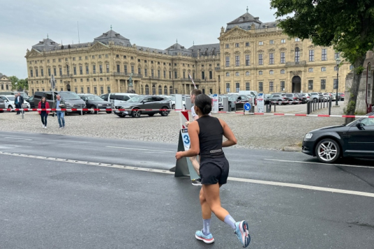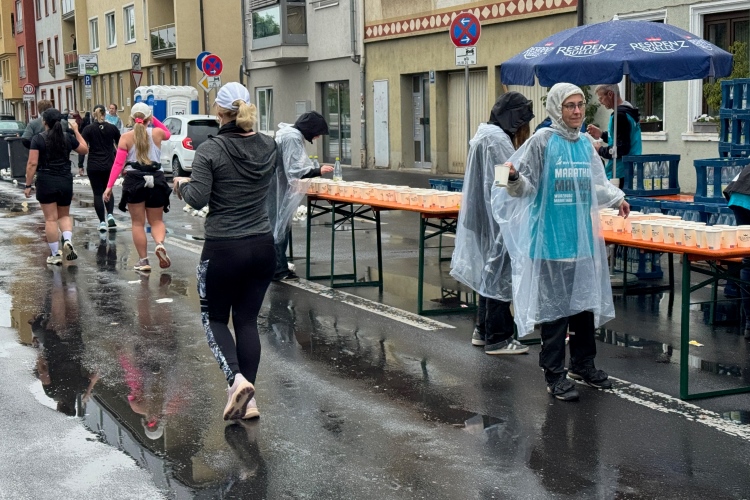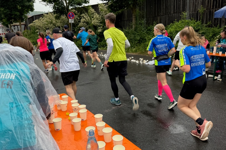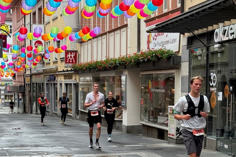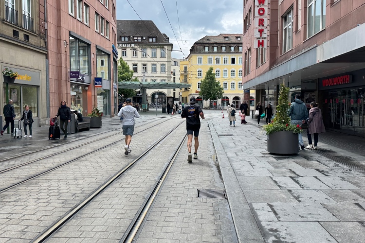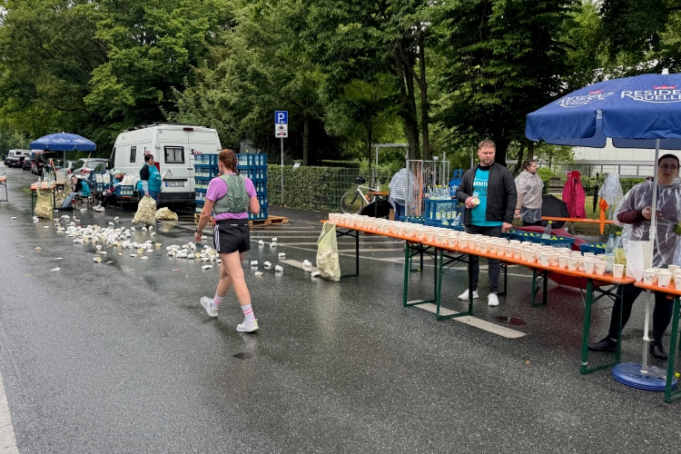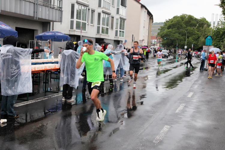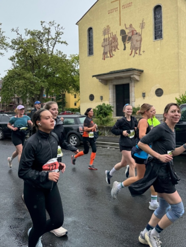 Rechts der Marktplatz, da kommen wir noch hin. Links das Neumünster und dann der Dom. Den sehen wir auch später noch mal. Der VP am Franziskanerplatz gibt noch mal Auftrieb. Generell sind die VPs gut organisiert: Wasser, Apfelschorle, Iso, Bananen und auf der zweiten Runde auch Cola-Mix. Alles gereicht von freundlichen Helferinnen und Helfern. Dazwischen auch noch Erfrischungspunkte,  die ausschließlich Wasser anbieten,  damit man auch bei Hitze immer genug Flüssigkeit bekommen würde.