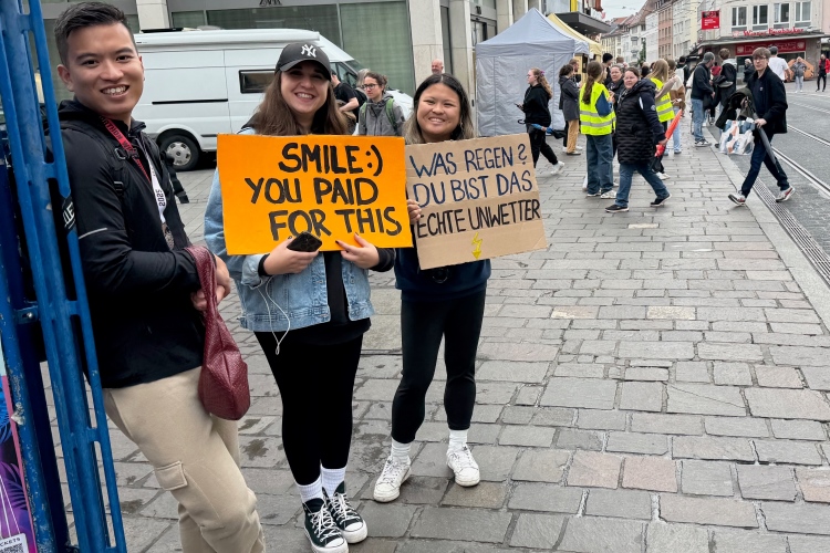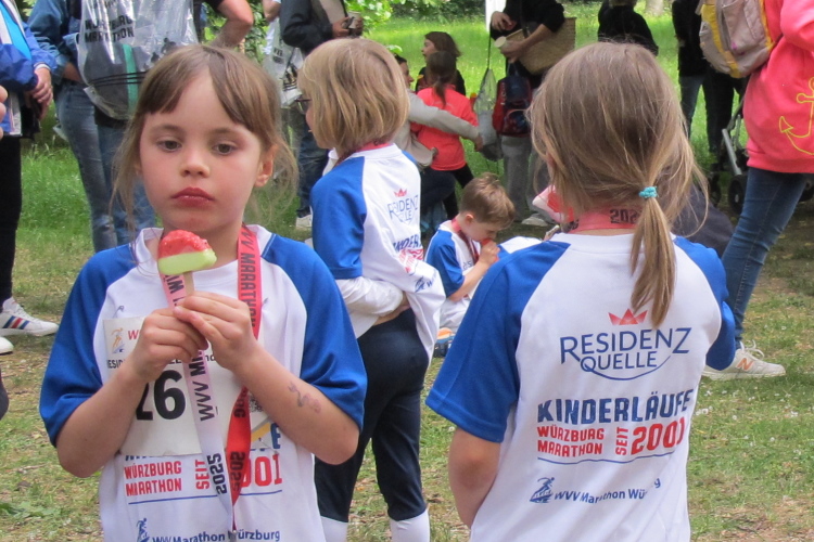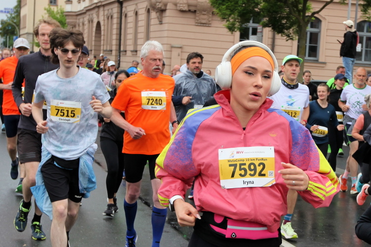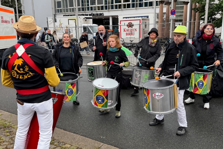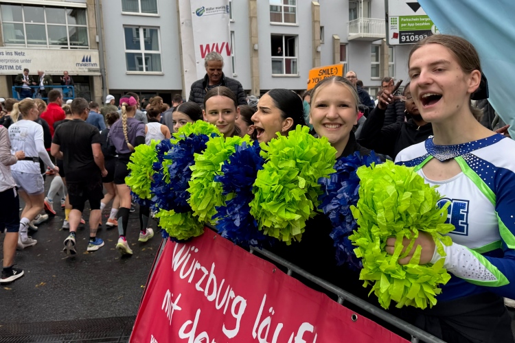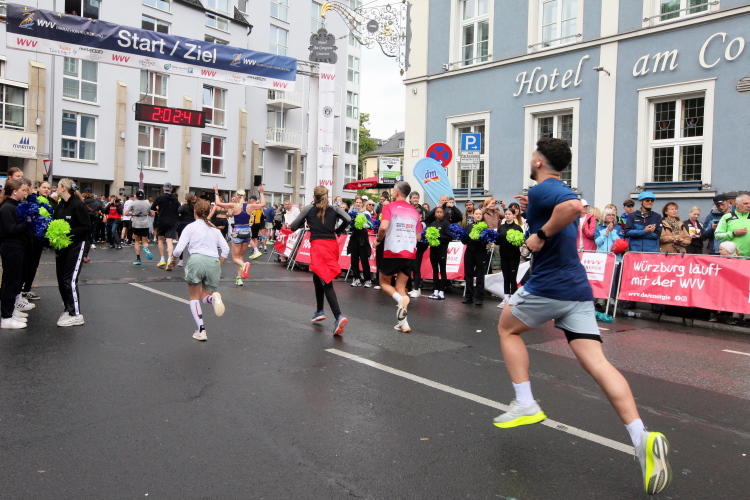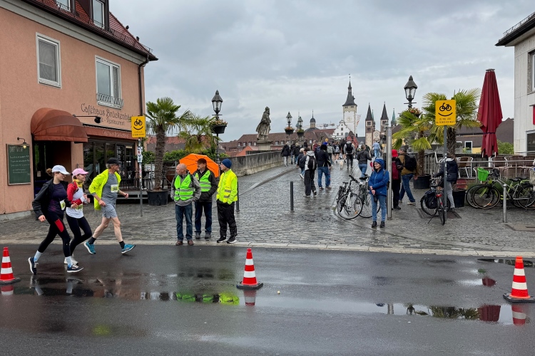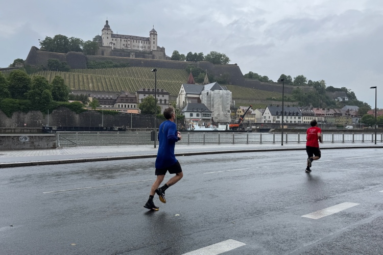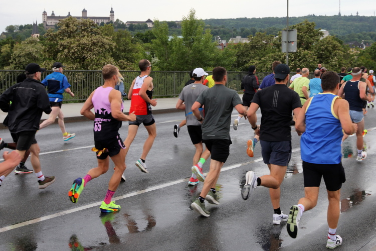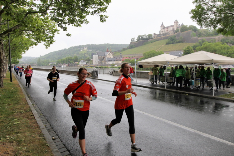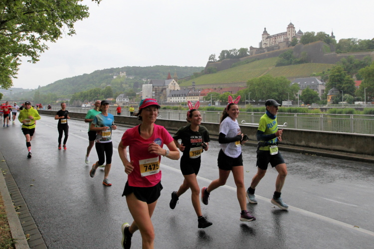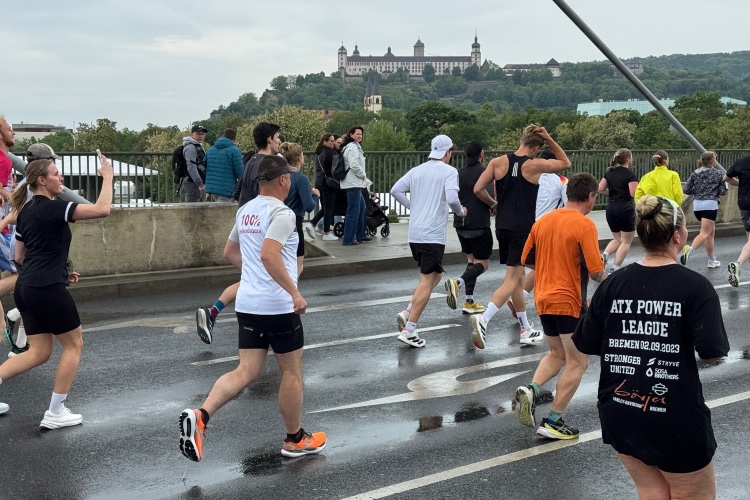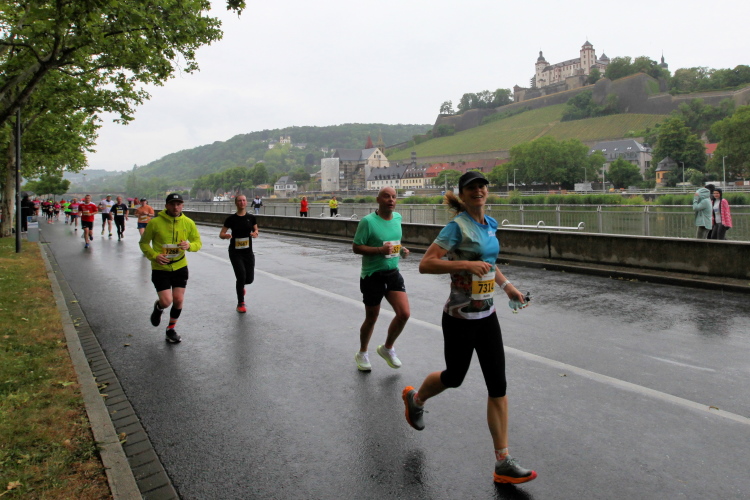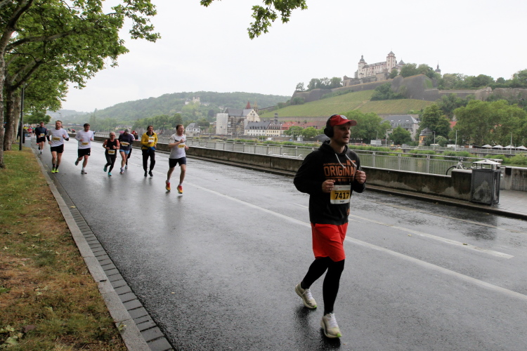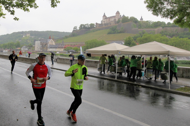 Die Seniorinnen und Senioren aus dem Caritas-Heim lassen sich heute wohl durch das regnerische Wetter abschrecken und zeigen sich nicht an der Strecke. Unter der Ludwigsbrücke eine Trommelgruppe aus „best agern“. Die Damen und Herren sind voll bei der Sache. Der Blick auf die Festung Marienberg ist sehr schön. Aktuell hat kein Kreuzfahrtschiff am Kai angelegt, nur ein chinesisches Restaurantschiff. Inzwischen haben mich als Spaziergänger die Führenden auf der zweiten Runde eingeholt.
