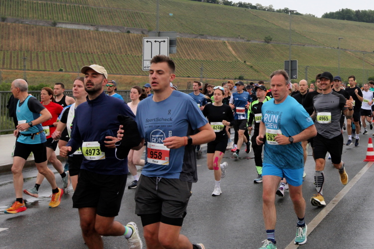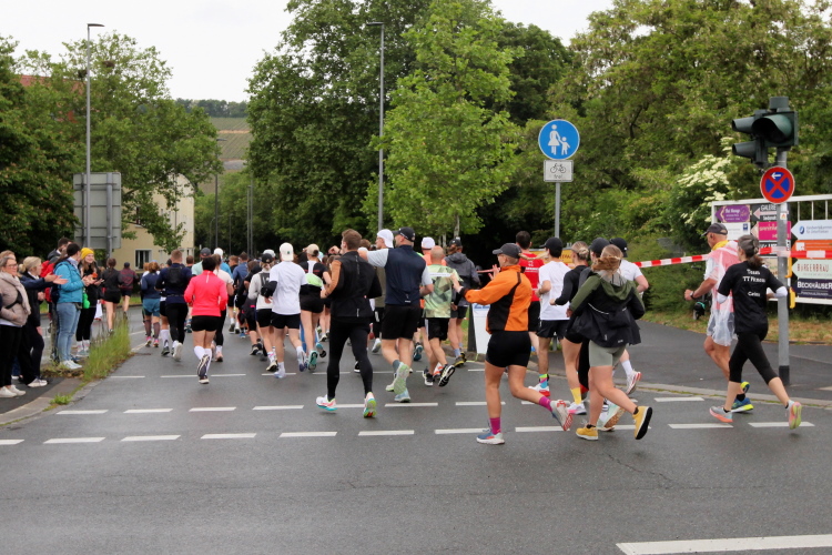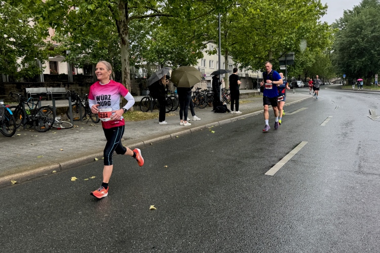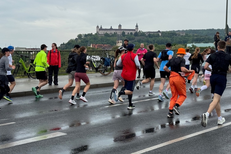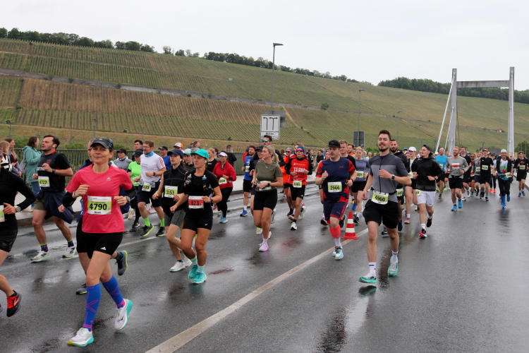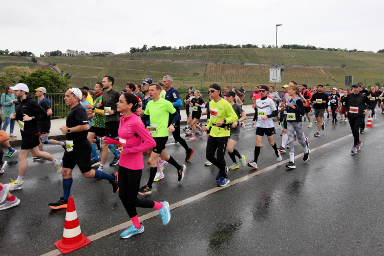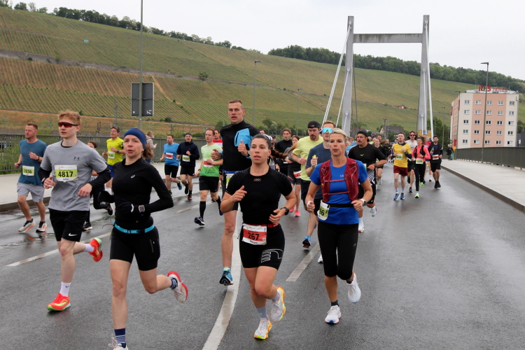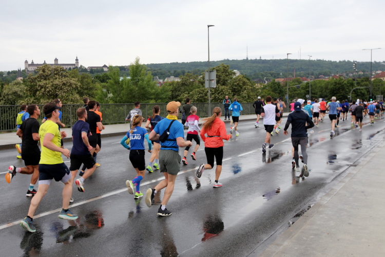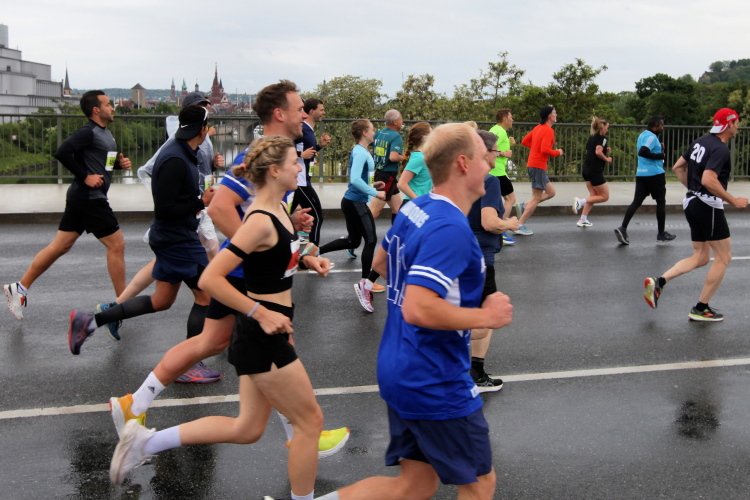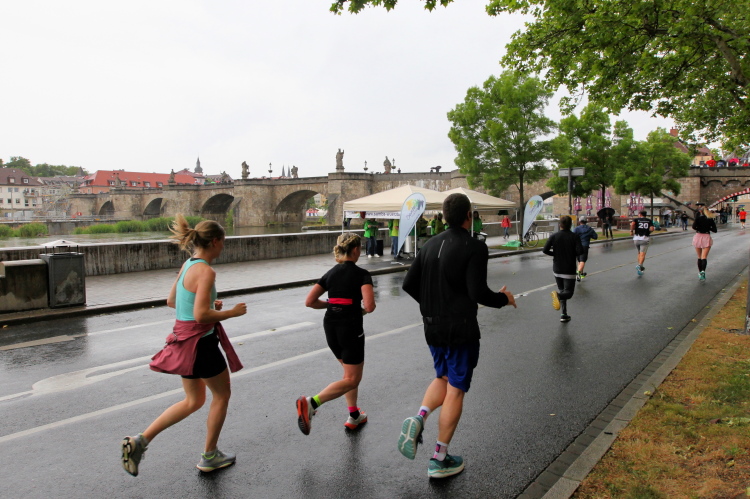 Erstes Highlight ist die „Brücke der deutschen Einheit“. Eine moderne Schrägseilbrücke, von der man links die Skyline von Würzburg mit der imposanten Festung Marienberg erblicken sollte. Aber wer denkt jetzt schon daran. Dafür bleibt auf der zweiten Runde immer noch Zeit. Erst mal nach Zellerau, diesmal mit einer kleinen Streckenoptimierung: Schon vor km 2 geht es auf einen Radweg am Main und dort flussabwärts. Nein, nicht bis zur fränkischen Faschingshochburg Veitshöchheim. Es geht durch viel Grün und noch sind dank der Halbmarathonis so viele LäuferInnen unterwegs, dass das Feld sich auf einen oberen und einen unteren Weg verteilt. Trommelgruppe und Verpflegungspunkt, später ein Stück Begegnungsstrecke und schon nach 3,6 Kilometern kommt die Wendestelle.