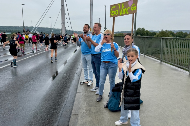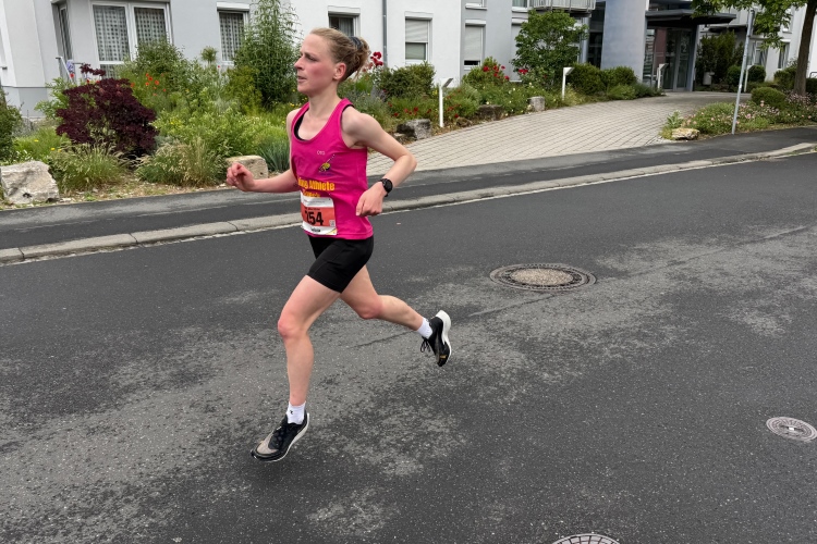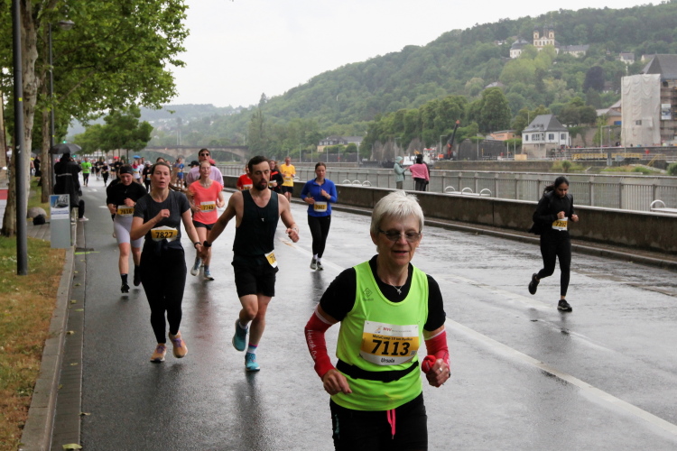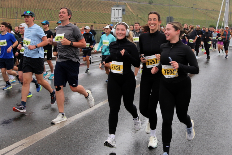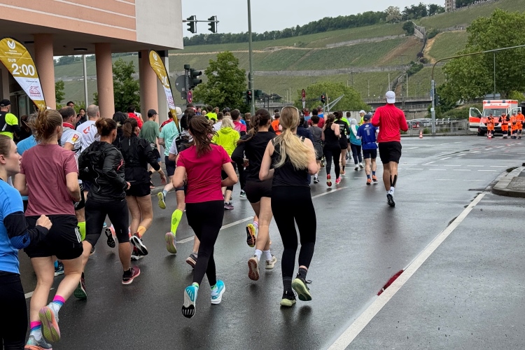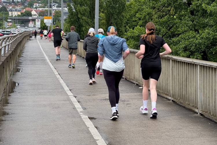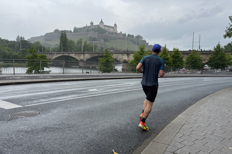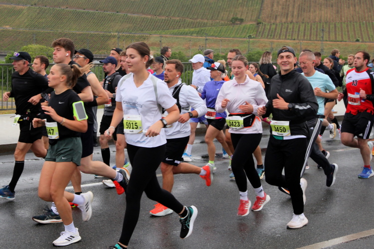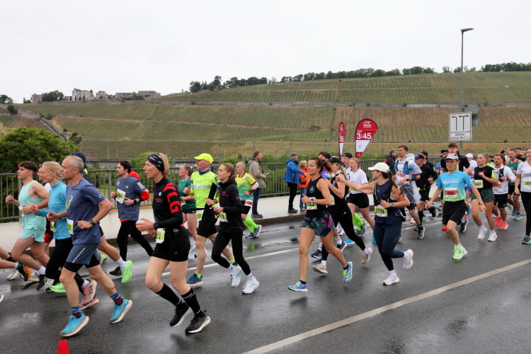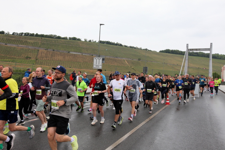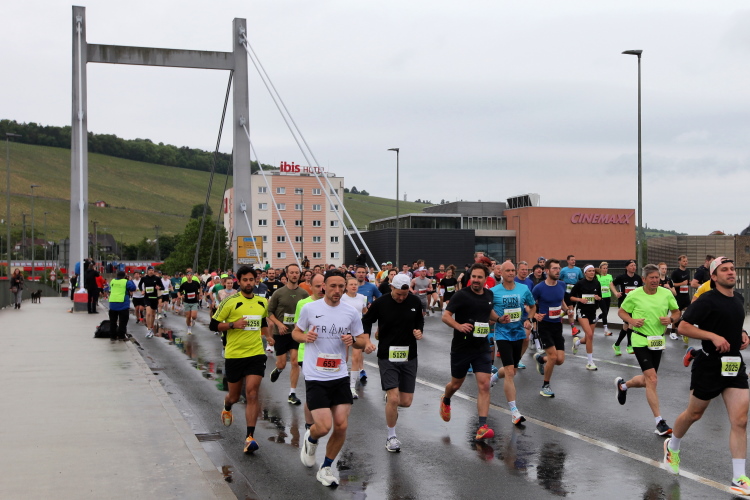 Erstes Highlight ist die „Brücke der deutschen Einheit“. Eine moderne Schrägseilbrücke, von der man links die Skyline von Würzburg mit der imposanten Festung Marienberg erblicken sollte. Aber wer denkt jetzt schon daran. Dafür bleibt auf der zweiten Runde immer noch Zeit. Erst mal nach Zellerau, diesmal mit einer kleinen Streckenoptimierung: Schon vor km 2 geht es auf einen Radweg am Main und dort flussabwärts. Nein, nicht bis zur fränkischen Faschingshochburg Veitshöchheim. Es geht durch viel Grün und noch sind dank der Halbmarathonis so viele LäuferInnen unterwegs, dass das Feld sich auf einen oberen und einen unteren Weg verteilt. Trommelgruppe und Verpflegungspunkt, später ein Stück Begegnungsstrecke und schon nach 3,6 Kilometern kommt die Wendestelle.