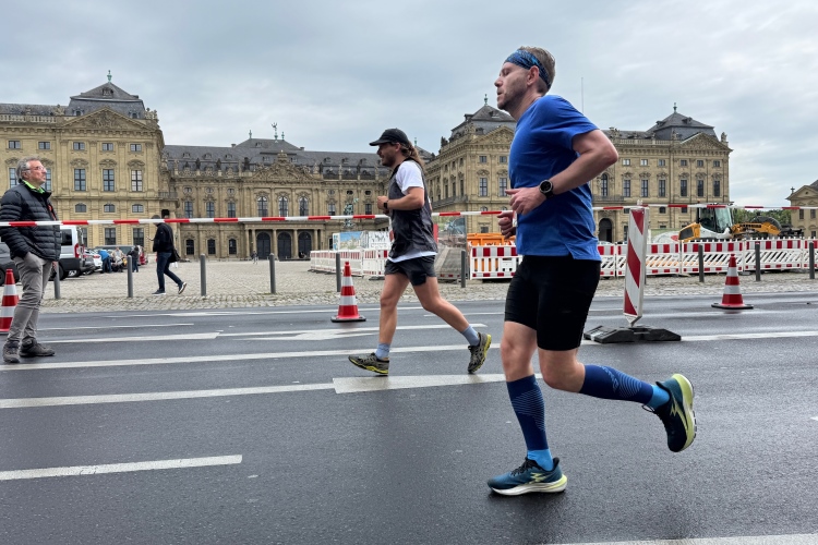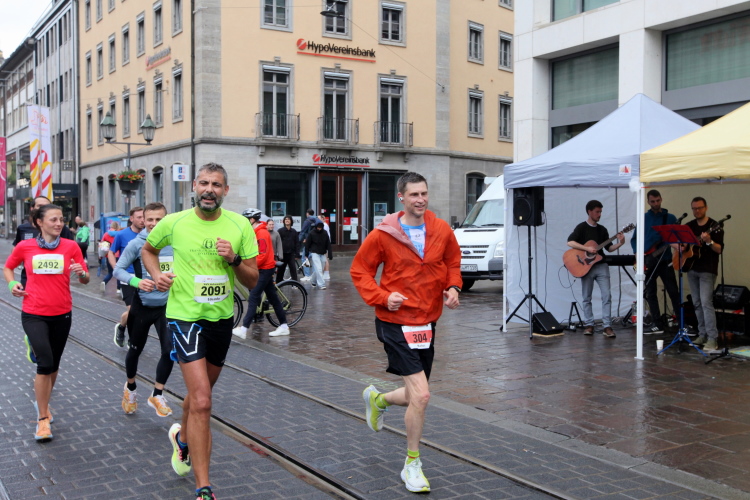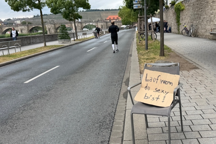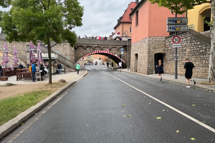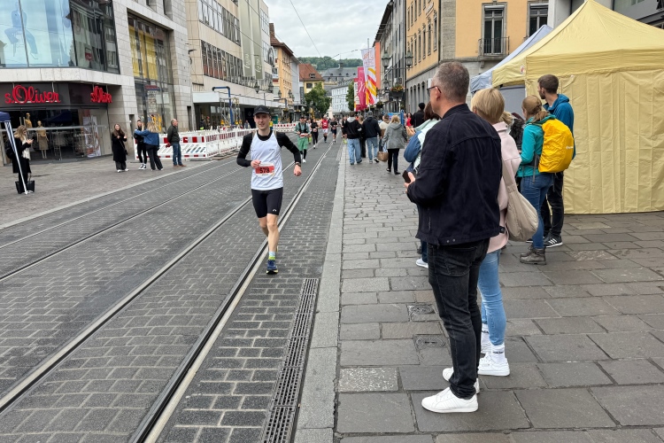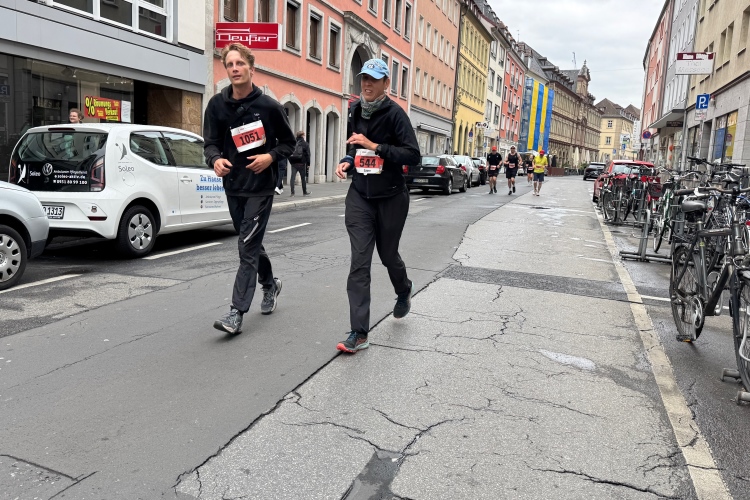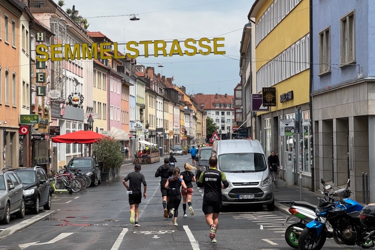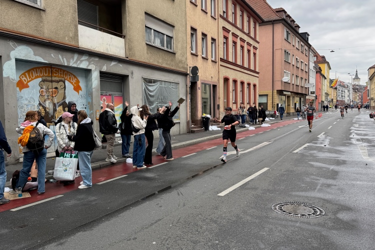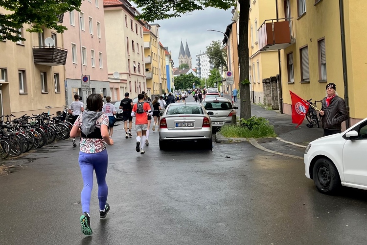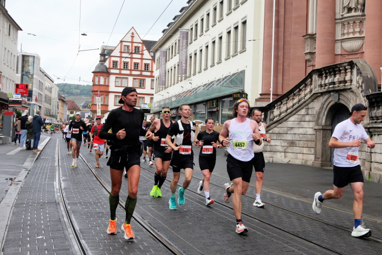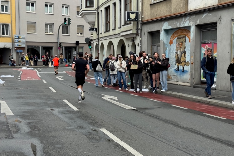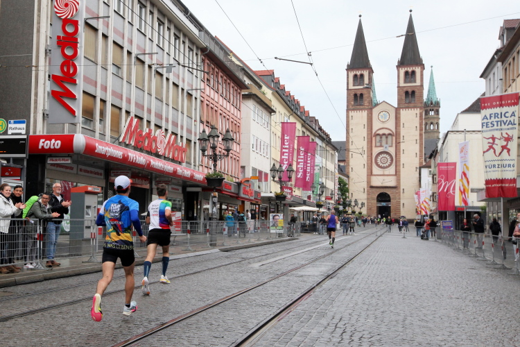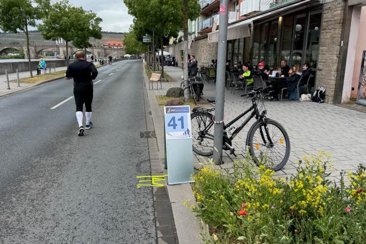 Die Konrad-Adenauer-Brücke über uns beeindruckt durch viel Beton. Wir unten durch um eine Trambahnschleife herum. Unter der namenlosen Eisenbahnbrücke hindurch. Nun in großer Schleife unter einiger Anfeuerung hinauf zur Straßenbrücke. Wir haben den Fuß-/Radweg neben der Straße ganz für uns. Oben belohnt uns ein schöner Blick auf den Main. In einem Kreisel geht es zügig hinunter und kurz danach sind wir auf dem Theodor-Heuss-Damm am Fluss entlang. Zurück Richtung Zentrum, unterbrochen durch einen Schlenker in Sanderau. Am Abzweig ein fetziges Team mit Akkordeons und Gitarre. Man hat sich auf deutsche bzw. bayerische Schlager spezialisiert und manche Texte dem Thema „Laufen“ angepasst. Hier stehen wieder etliche Bewohner an der Laufstrecke und oft kommt auch Anfeuerung von oben, also aus den Fenstern. Besonders der kleine Platz an der Uhlandstraße ist ein Hotspot. Da kommt man gerne vorbei.