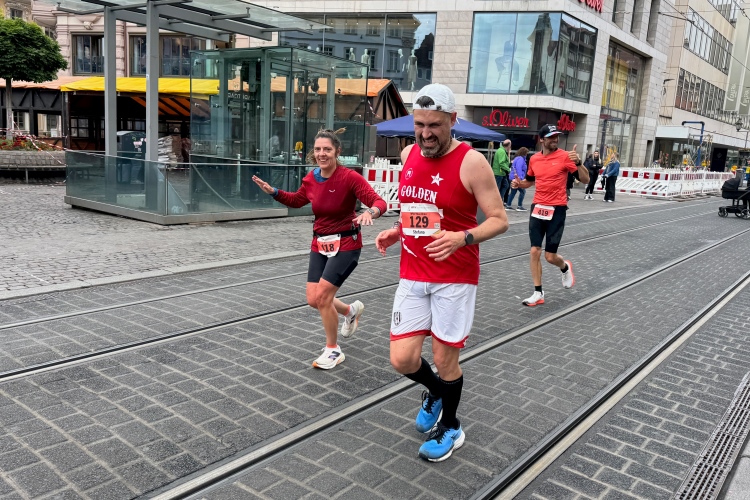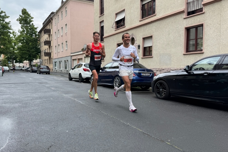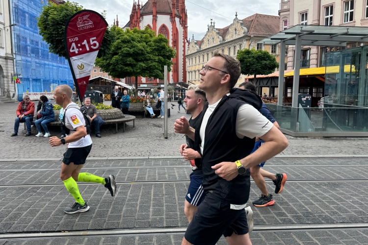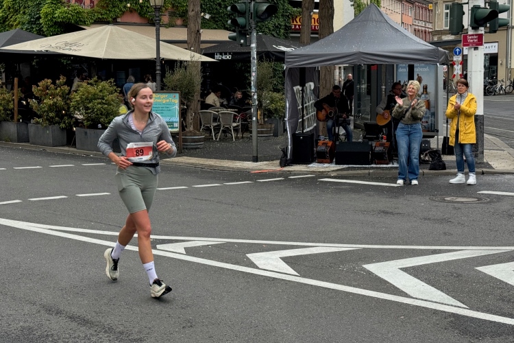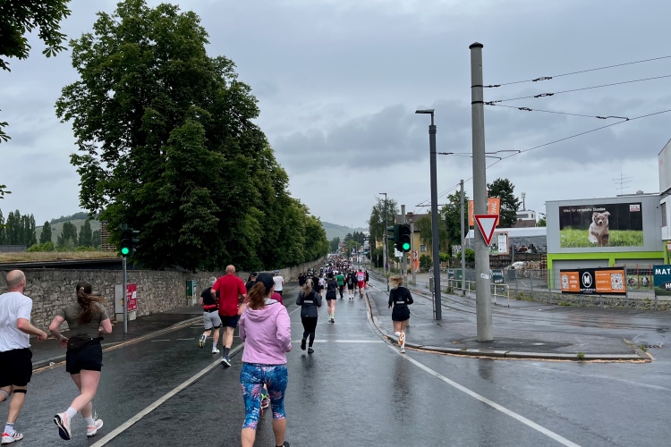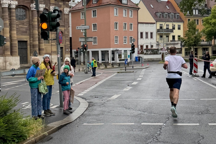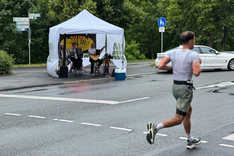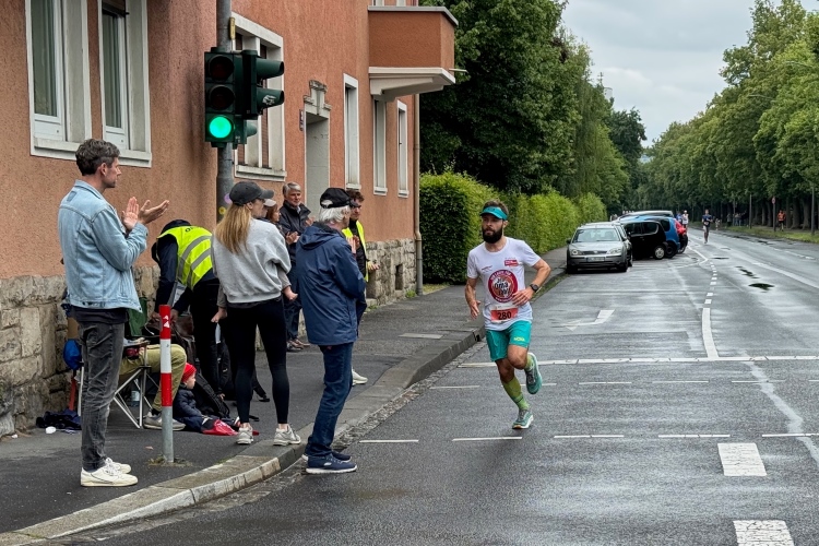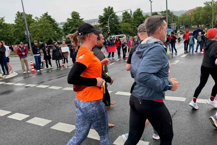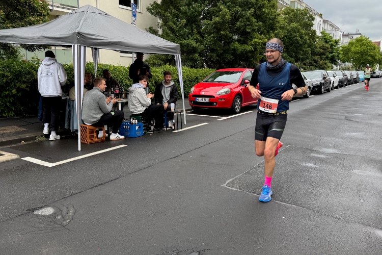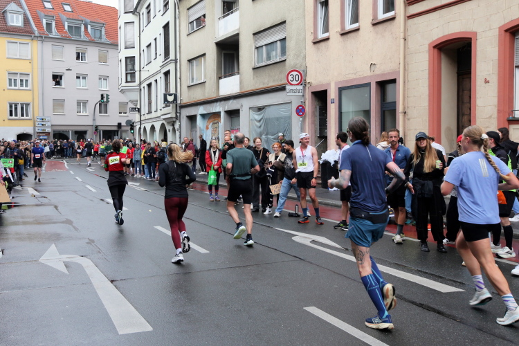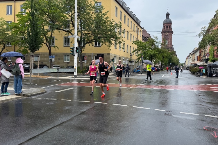 Die Konrad-Adenauer-Brücke über uns beeindruckt durch viel Beton. Wir unten durch um eine Trambahnschleife herum. Unter der namenlosen Eisenbahnbrücke hindurch. Nun in großer Schleife unter einiger Anfeuerung hinauf zur Straßenbrücke. Wir haben den Fuß-/Radweg neben der Straße ganz für uns. Oben belohnt uns ein schöner Blick auf den Main. In einem Kreisel geht es zügig hinunter und kurz danach sind wir auf dem Theodor-Heuss-Damm am Fluss entlang. Zurück Richtung Zentrum, unterbrochen durch einen Schlenker in Sanderau. Am Abzweig ein fetziges Team mit Akkordeons und Gitarre. Man hat sich auf deutsche bzw. bayerische Schlager spezialisiert und manche Texte dem Thema „Laufen“ angepasst. Hier stehen wieder etliche Bewohner an der Laufstrecke und oft kommt auch Anfeuerung von oben, also aus den Fenstern. Besonders der kleine Platz an der Uhlandstraße ist ein Hotspot. Da kommt man gerne vorbei.