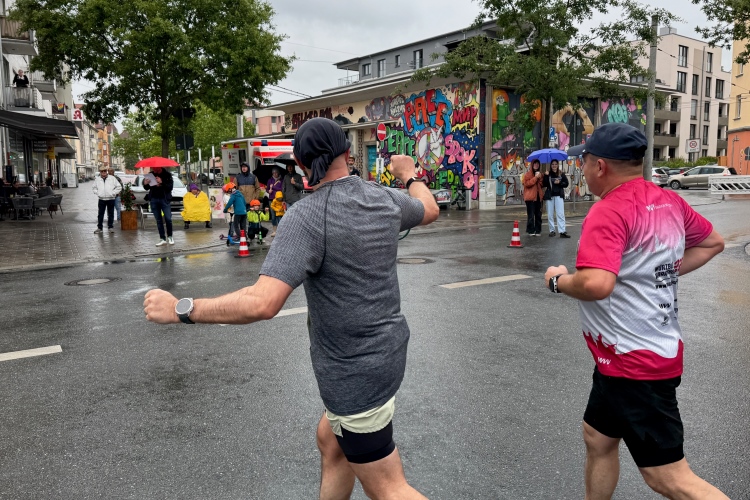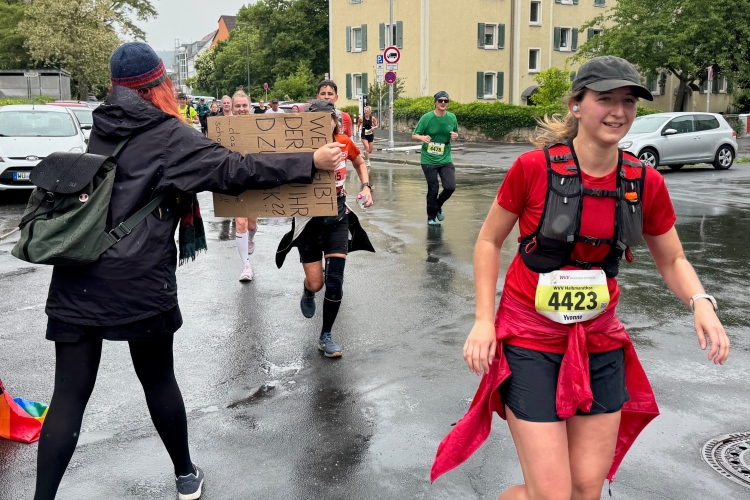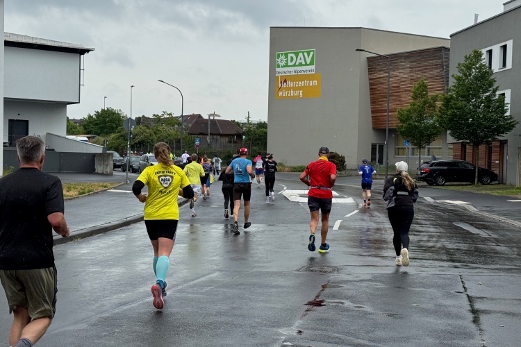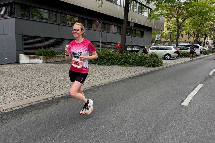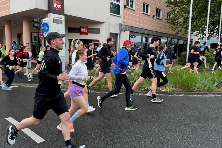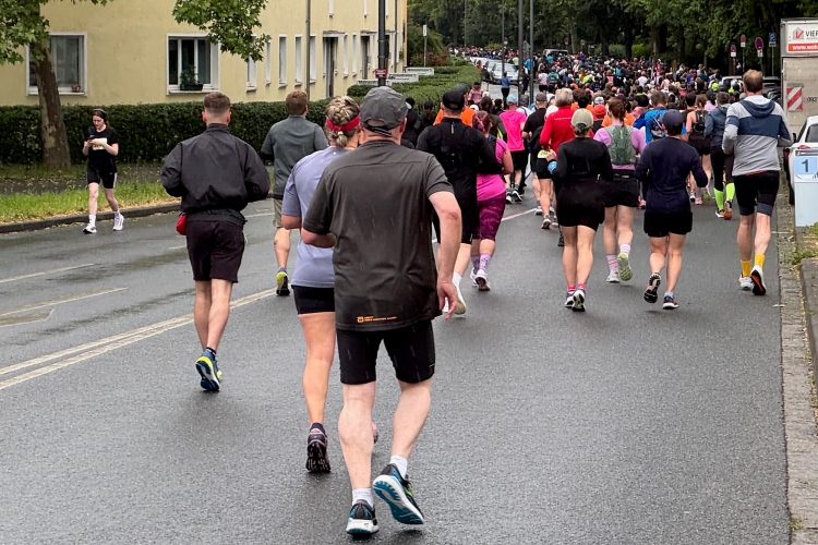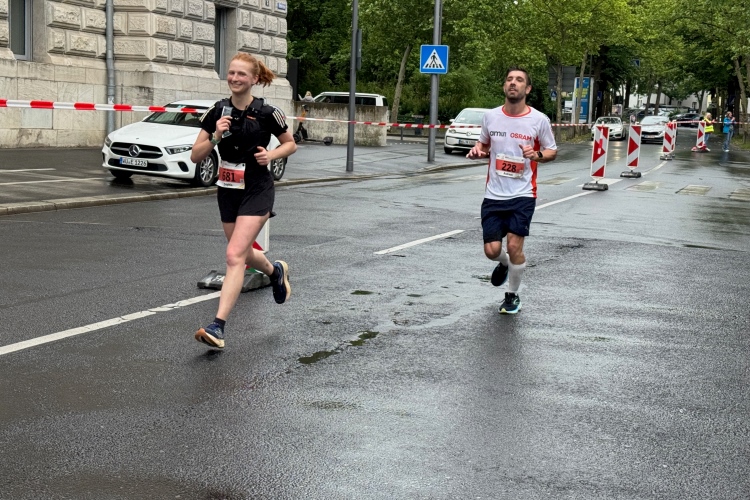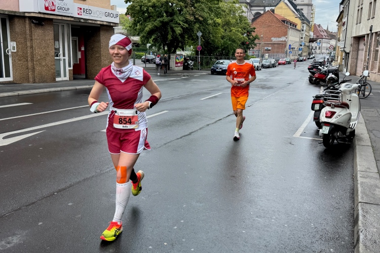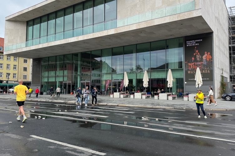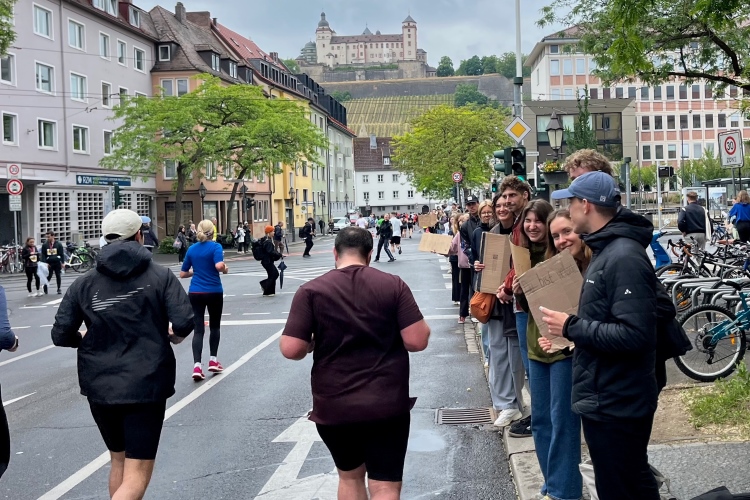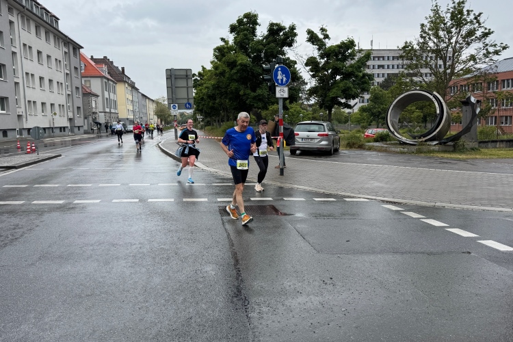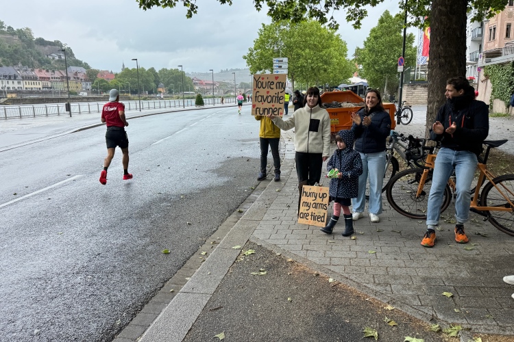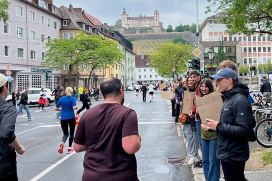 Die Konrad-Adenauer-Brücke über uns beeindruckt durch viel Beton. Wir unten durch um eine Trambahnschleife herum. Unter der namenlosen Eisenbahnbrücke hindurch. Nun in großer Schleife unter einiger Anfeuerung hinauf zur Straßenbrücke. Wir haben den Fuß-/Radweg neben der Straße ganz für uns. Oben belohnt uns ein schöner Blick auf den Main. In einem Kreisel geht es zügig hinunter und kurz danach sind wir auf dem Theodor-Heuss-Damm am Fluss entlang. Zurück Richtung Zentrum, unterbrochen durch einen Schlenker in Sanderau. Am Abzweig ein fetziges Team mit Akkordeons und Gitarre. Man hat sich auf deutsche bzw. bayerische Schlager spezialisiert und manche Texte dem Thema „Laufen“ angepasst. Hier stehen wieder etliche Bewohner an der Laufstrecke und oft kommt auch Anfeuerung von oben, also aus den Fenstern. Besonders der kleine Platz an der Uhlandstraße ist ein Hotspot. Da kommt man gerne vorbei.