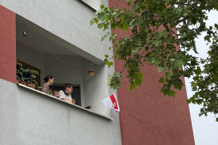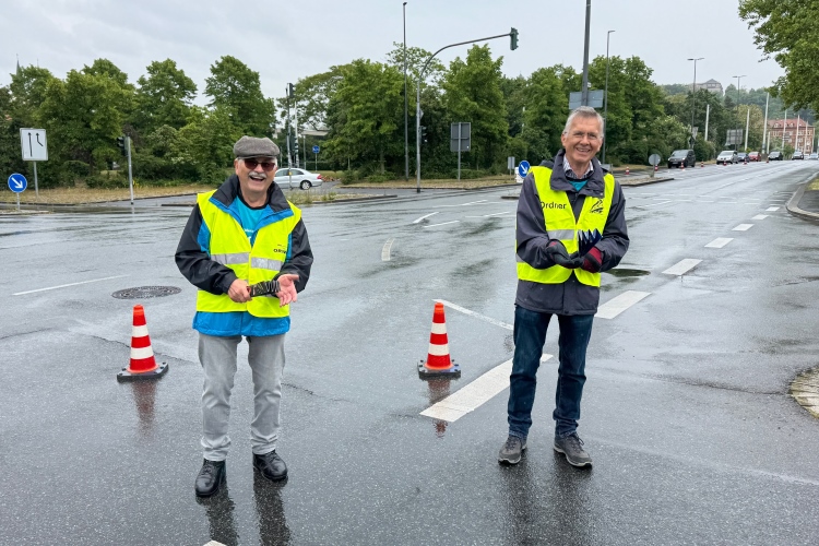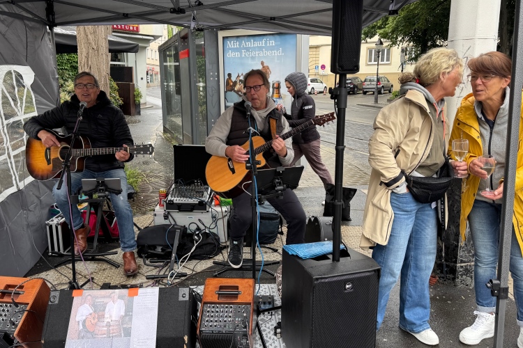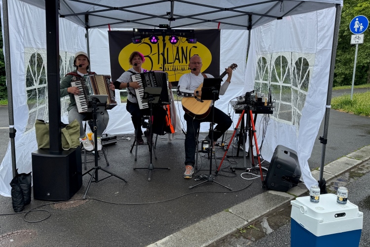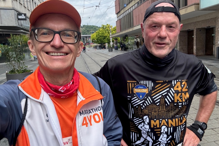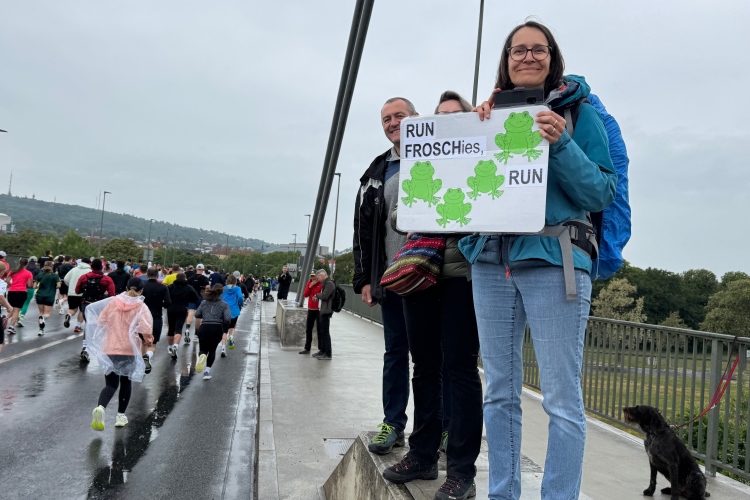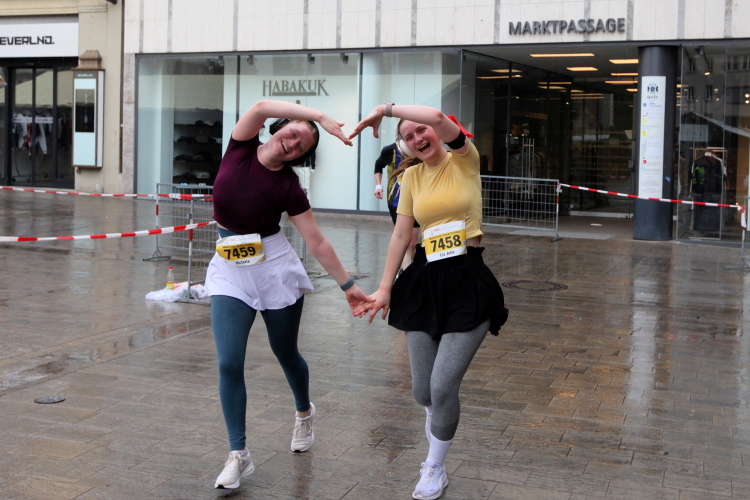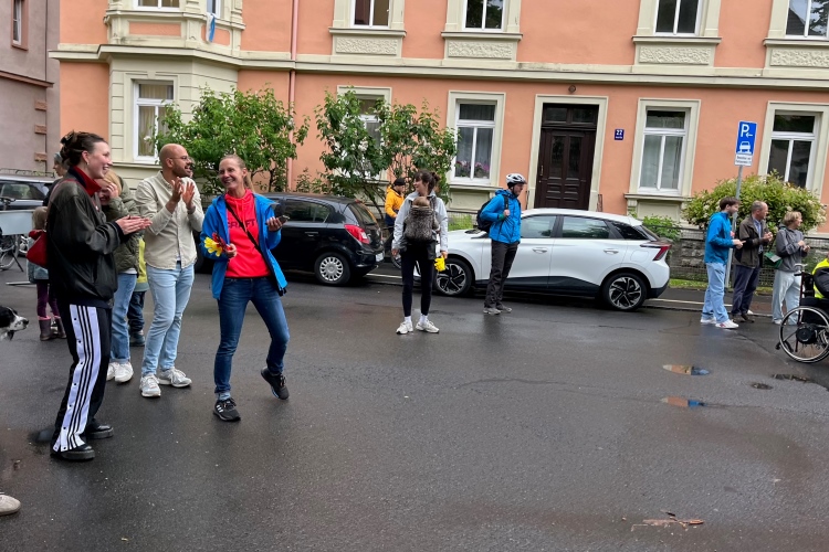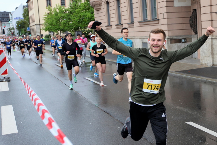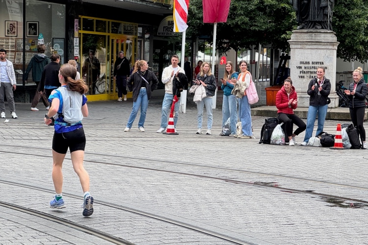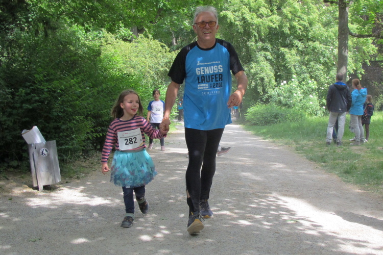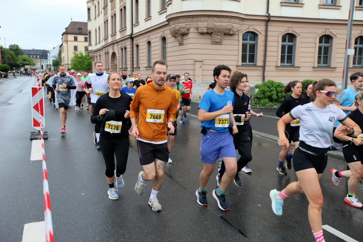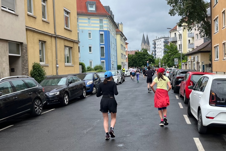 Die Konrad-Adenauer-Brücke über uns beeindruckt durch viel Beton. Wir unten durch um eine Trambahnschleife herum. Unter der namenlosen Eisenbahnbrücke hindurch. Nun in großer Schleife unter einiger Anfeuerung hinauf zur Straßenbrücke. Wir haben den Fuß-/Radweg neben der Straße ganz für uns. Oben belohnt uns ein schöner Blick auf den Main. In einem Kreisel geht es zügig hinunter und kurz danach sind wir auf dem Theodor-Heuss-Damm am Fluss entlang. Zurück Richtung Zentrum, unterbrochen durch einen Schlenker in Sanderau. Am Abzweig ein fetziges Team mit Akkordeons und Gitarre. Man hat sich auf deutsche bzw. bayerische Schlager spezialisiert und manche Texte dem Thema „Laufen“ angepasst. Hier stehen wieder etliche Bewohner an der Laufstrecke und oft kommt auch Anfeuerung von oben, also aus den Fenstern. Besonders der kleine Platz an der Uhlandstraße ist ein Hotspot. Da kommt man gerne vorbei.