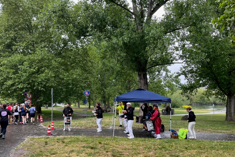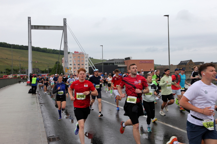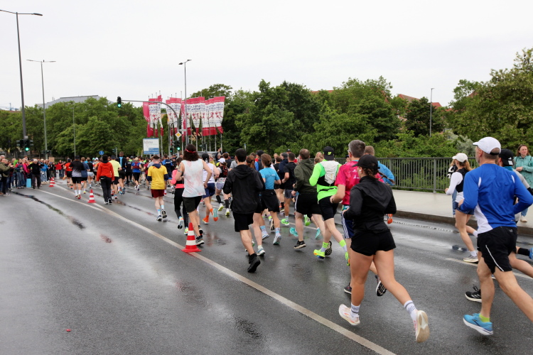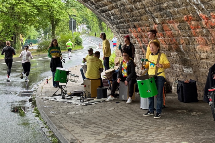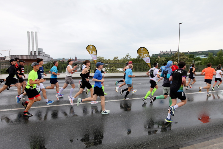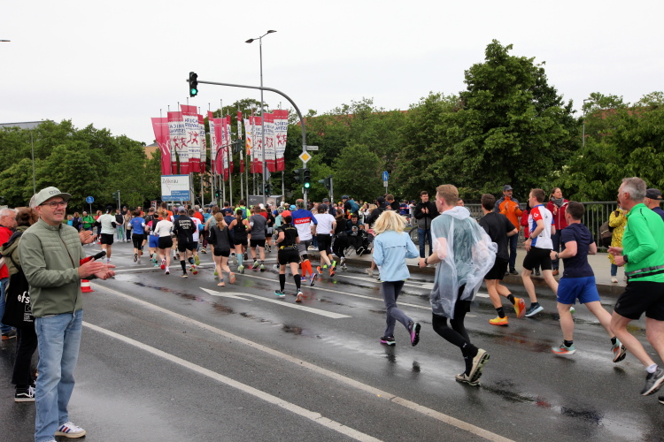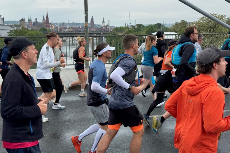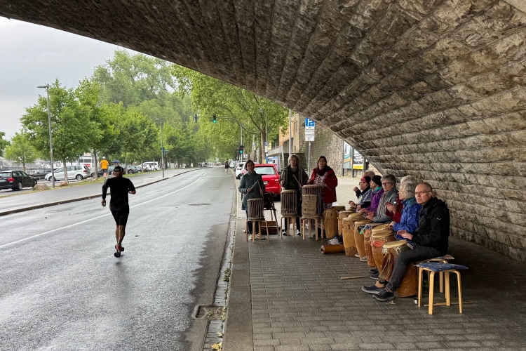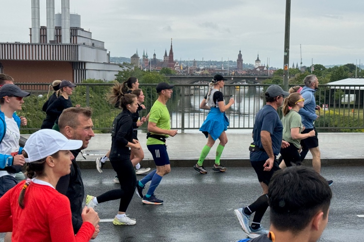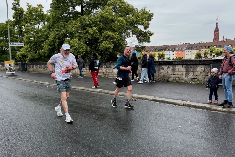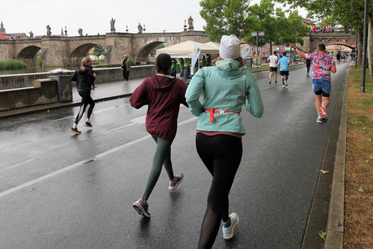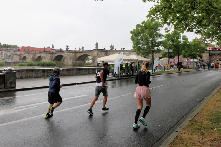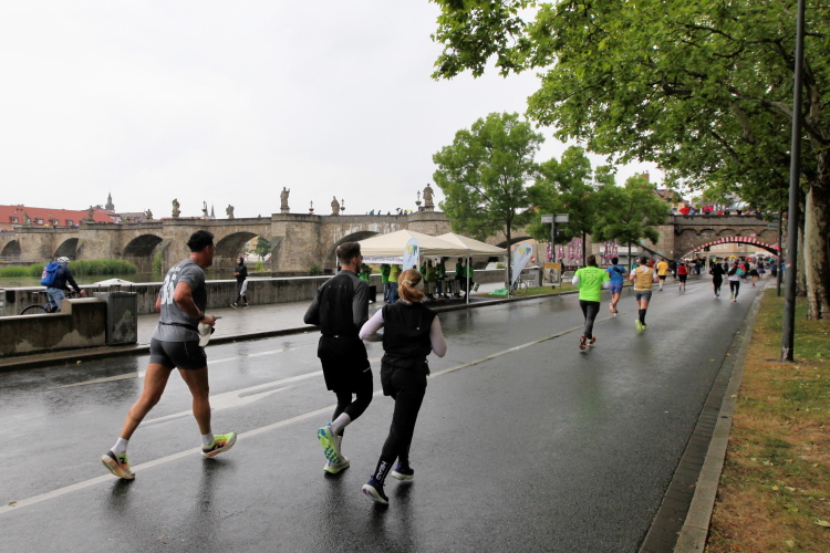 Bei Km 7,5 sind wir wieder am Main, unter der Friedensbrücke hindurch. Hier steht traditionell eine größere Trommlergruppe. Insgesamt sollen uns auf den 21 km 25 Musikdarbietungen erwarten. Oft unter Brücken oder regengeschützt unter Zelten. Heute herrscht perfektes Laufwetter: nicht zu warm, kaum Sonne und kaum Wind. Leider wird es im Laufe des Wettkampfs dann doch ein bisschen Nieselregen geben, aber alles wesentlich harmloser als vorhergesagt. Im Mai ist vieles möglich, wie die letzten Veranstaltungen zeigten: Von Wolkenbrüchen bis zu brütender Hitze war alles dabei. Heute haben wir also Glück.