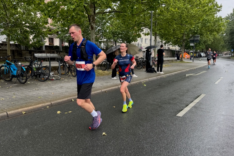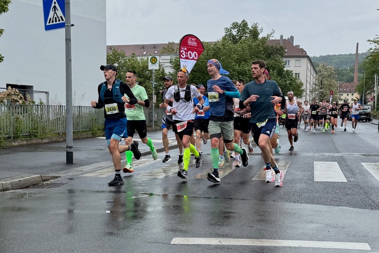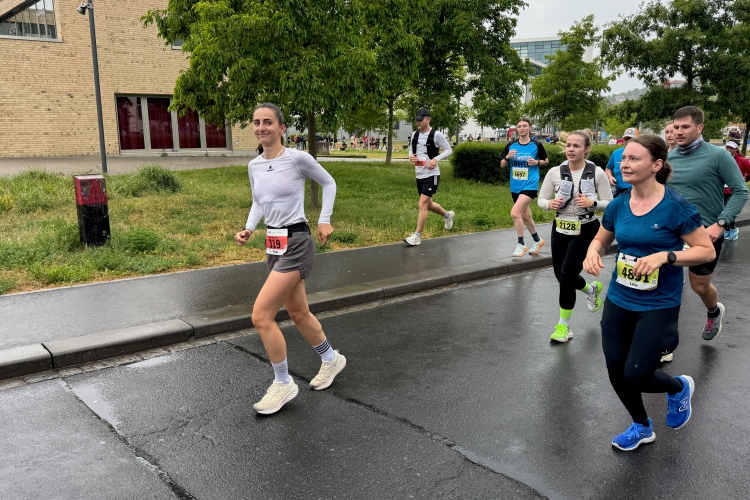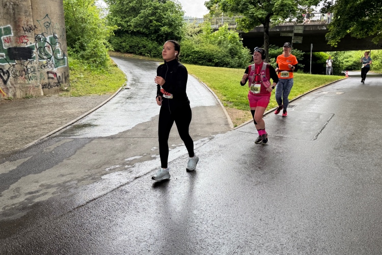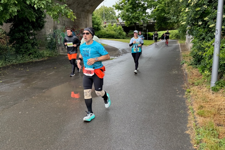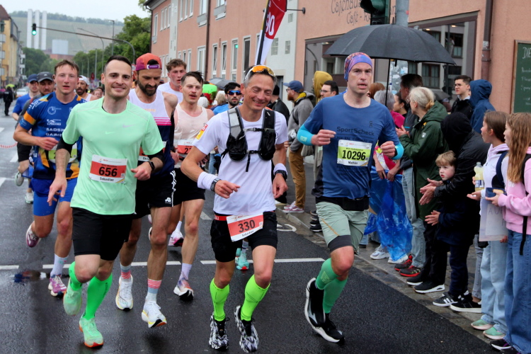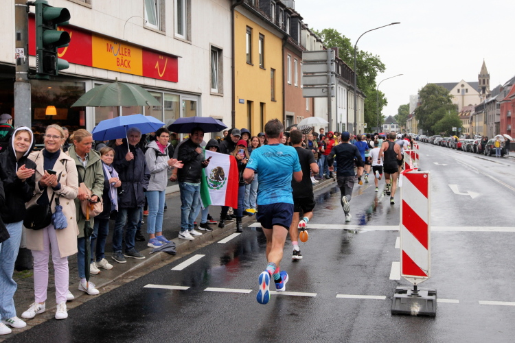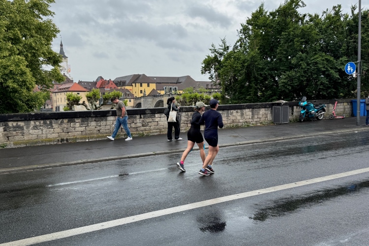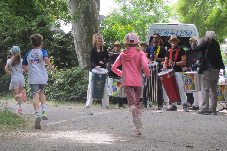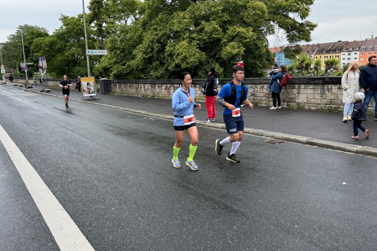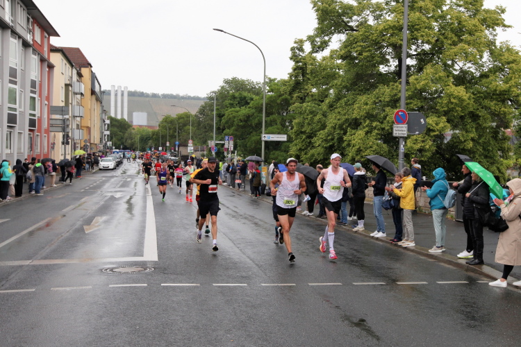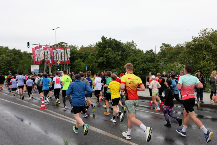 Bei Km 7,5 sind wir wieder am Main, unter der Friedensbrücke hindurch. Hier steht traditionell eine größere Trommlergruppe. Insgesamt sollen uns auf den 21 km 25 Musikdarbietungen erwarten. Oft unter Brücken oder regengeschützt unter Zelten. Heute herrscht perfektes Laufwetter: nicht zu warm, kaum Sonne und kaum Wind. Leider wird es im Laufe des Wettkampfs dann doch ein bisschen Nieselregen geben, aber alles wesentlich harmloser als vorhergesagt. Im Mai ist vieles möglich, wie die letzten Veranstaltungen zeigten: Von Wolkenbrüchen bis zu brütender Hitze war alles dabei. Heute haben wir also Glück.