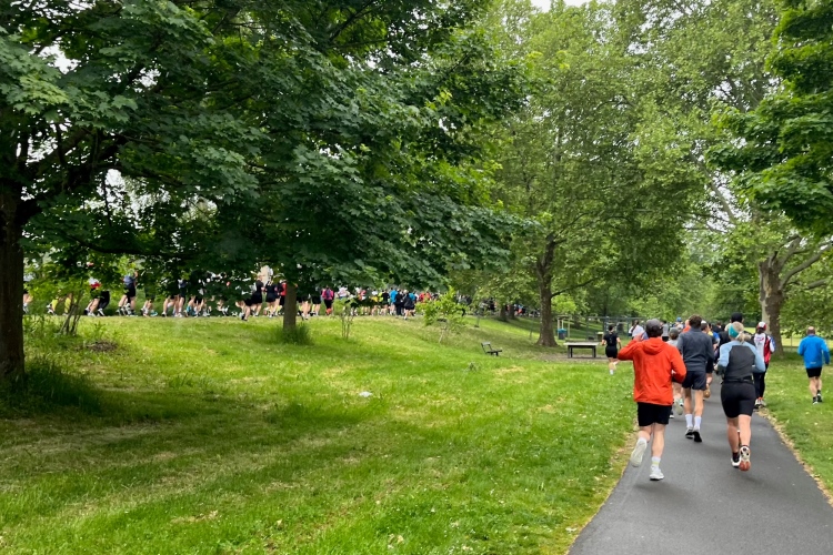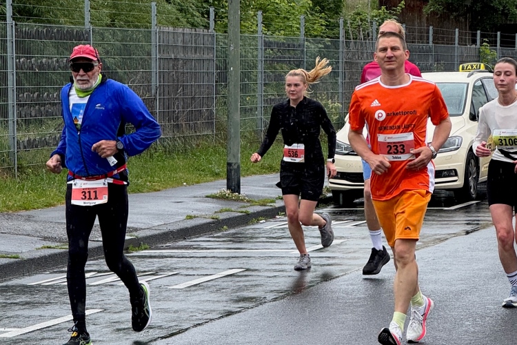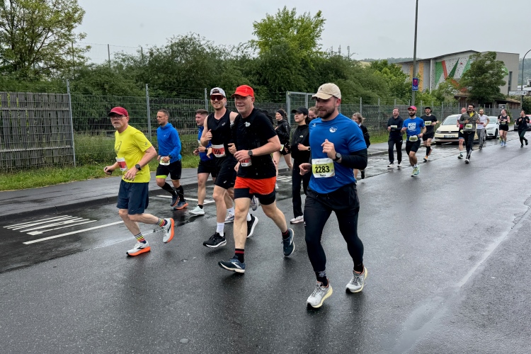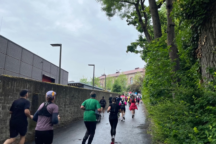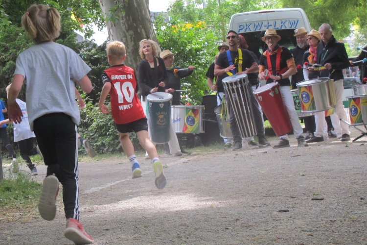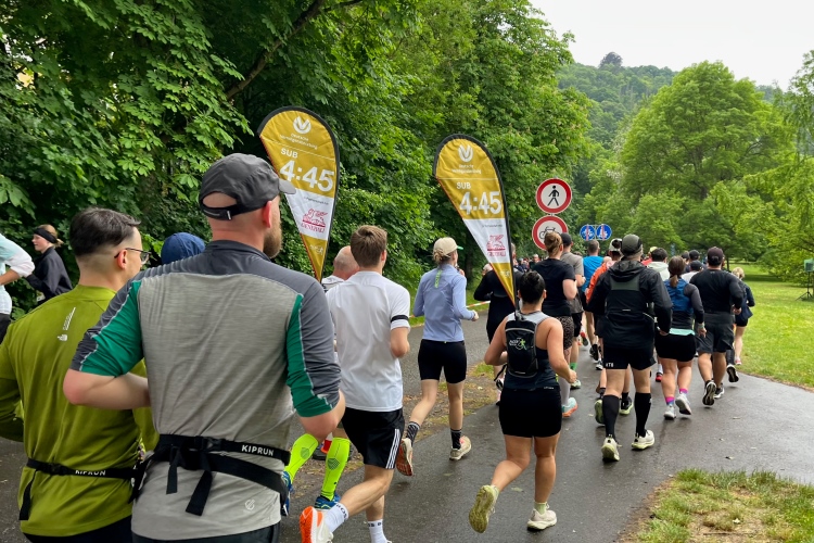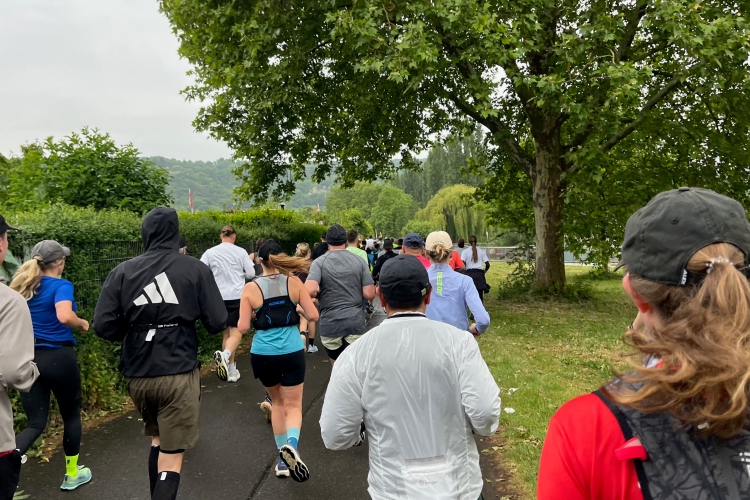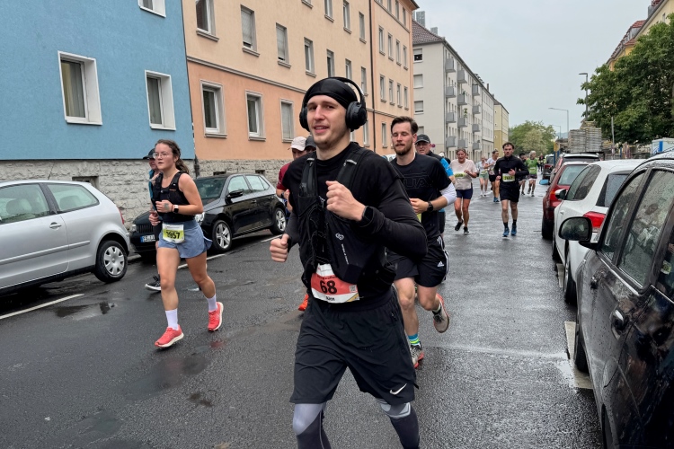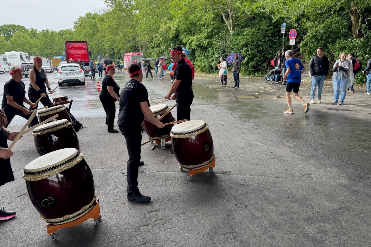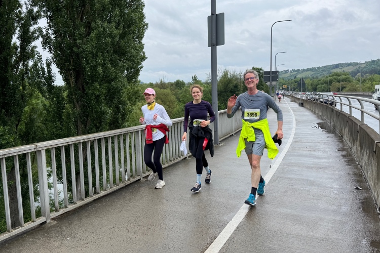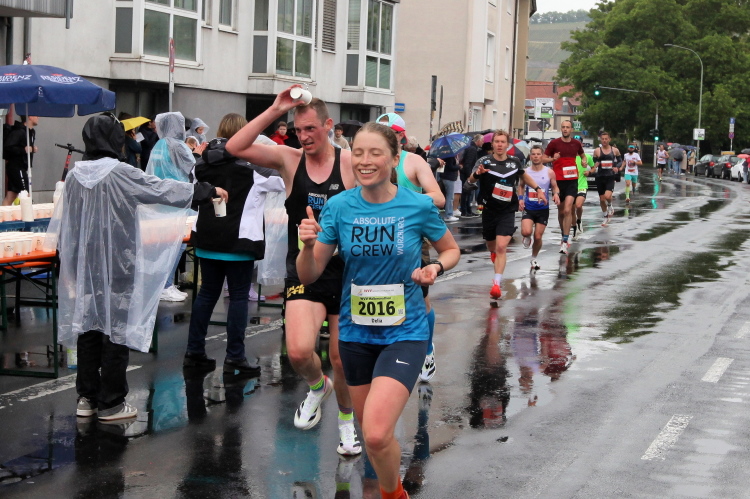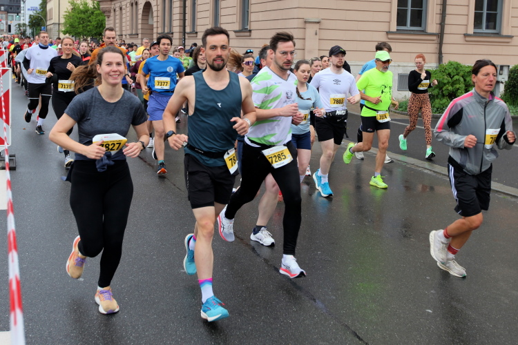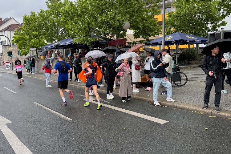 Bei Km 7,5 sind wir wieder am Main, unter der Friedensbrücke hindurch. Hier steht traditionell eine größere Trommlergruppe. Insgesamt sollen uns auf den 21 km 25 Musikdarbietungen erwarten. Oft unter Brücken oder regengeschützt unter Zelten. Heute herrscht perfektes Laufwetter: nicht zu warm, kaum Sonne und kaum Wind. Leider wird es im Laufe des Wettkampfs dann doch ein bisschen Nieselregen geben, aber alles wesentlich harmloser als vorhergesagt. Im Mai ist vieles möglich, wie die letzten Veranstaltungen zeigten: Von Wolkenbrüchen bis zu brütender Hitze war alles dabei. Heute haben wir also Glück.