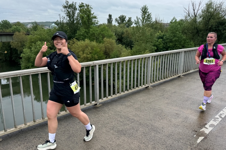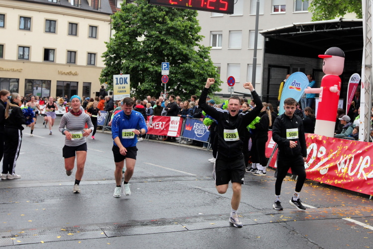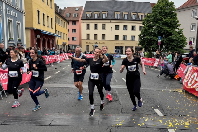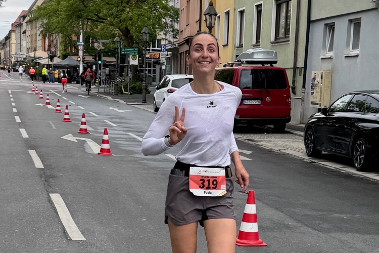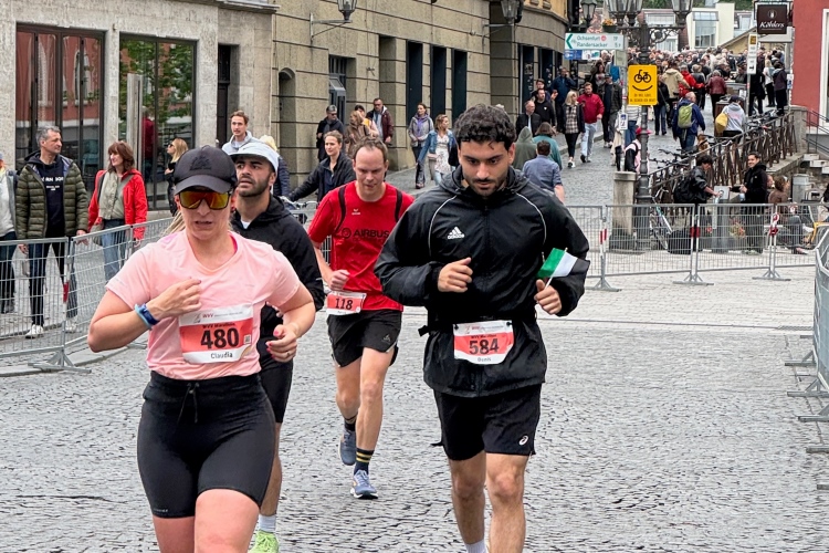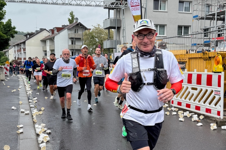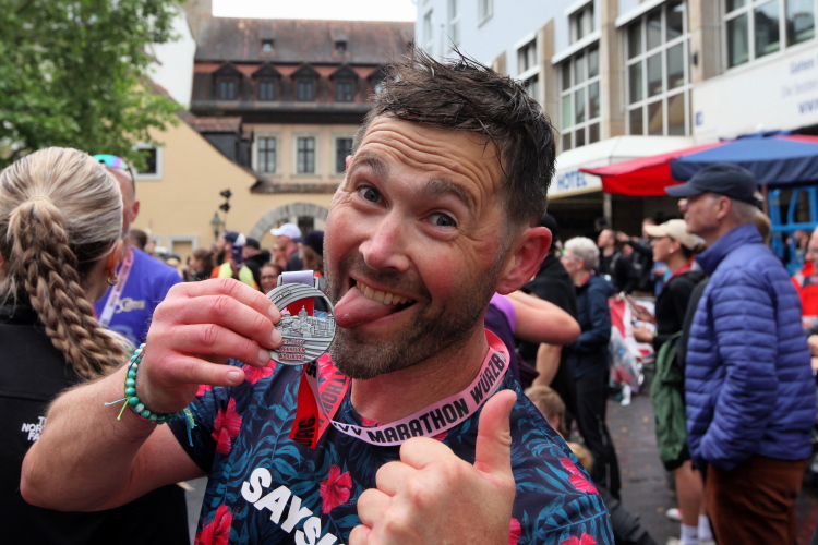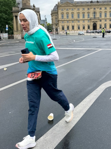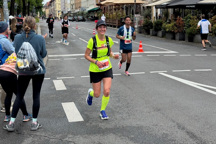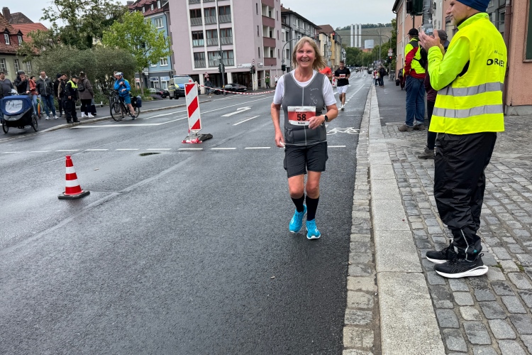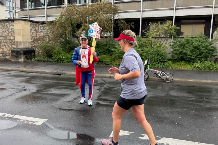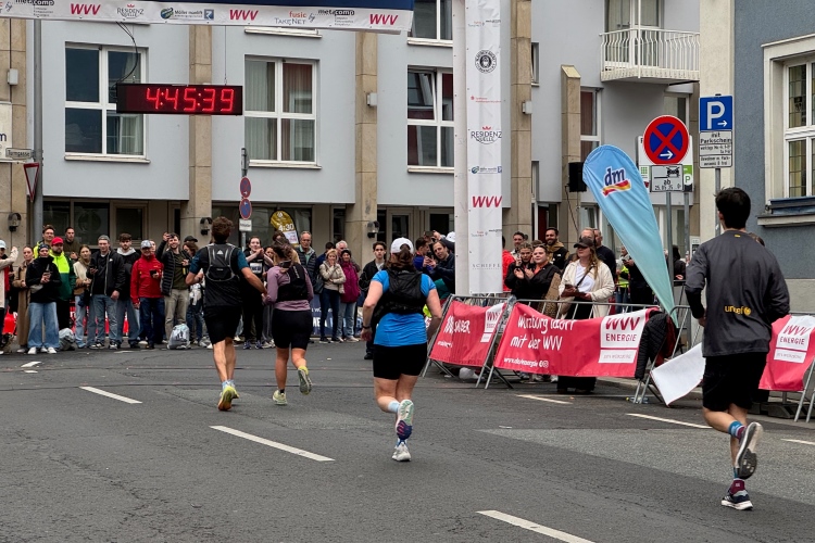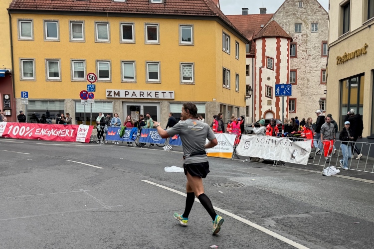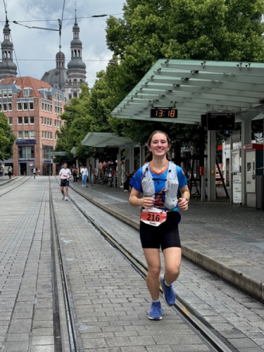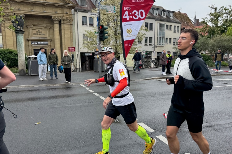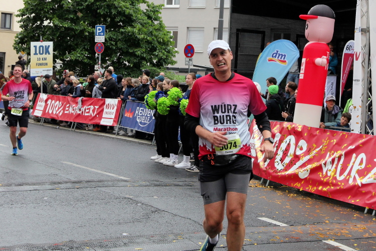 Noch ein paar Schlenker durch die Innenstadt, ein Abstecher zum Main, ein kurzer Anstieg und mit letzter Aufmunterung durch „Marathon-Maskottchen“ Michel aus Frankreich ist das Ziel erreicht.