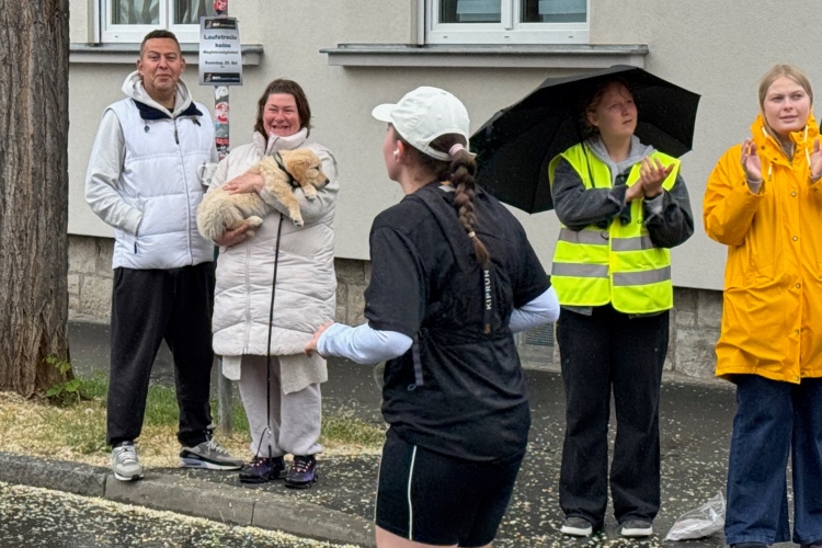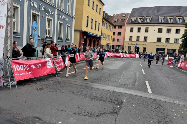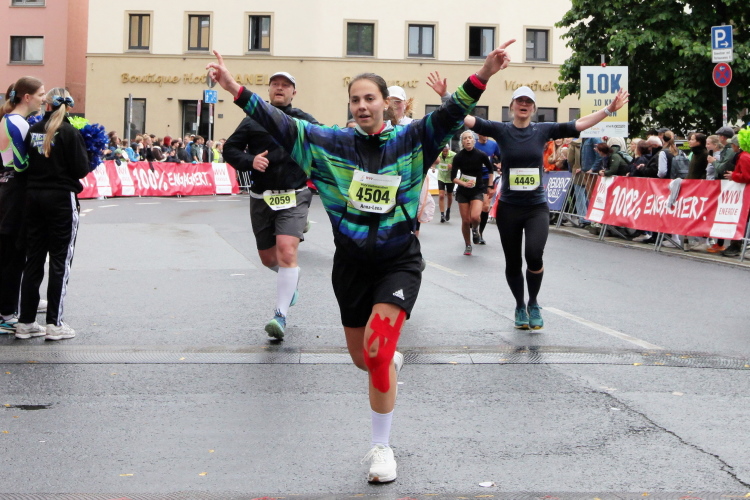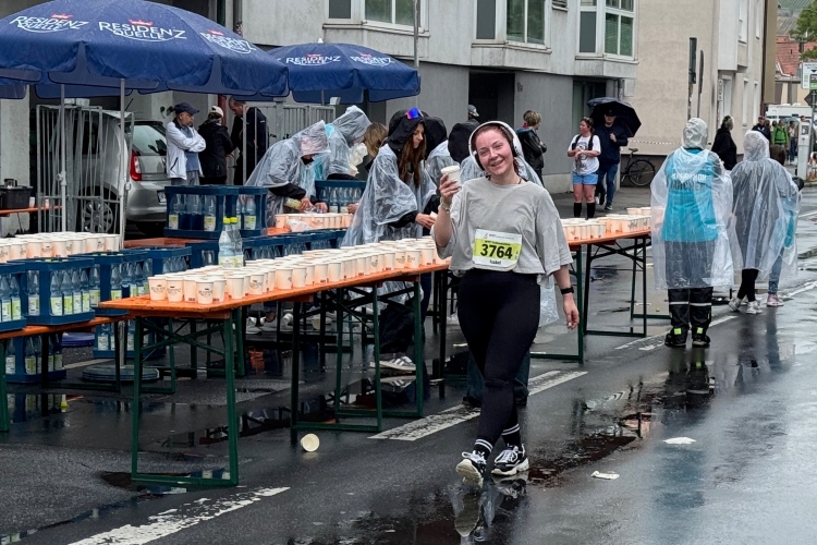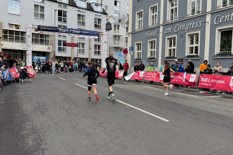 Judith wird als Siegerin der AK angekündigt. Ein paar Meter hinter der Startlinie geht es links in das Congress Centrum. Dort warten alkoholfreies Bier, Getränke, Obst, Laugengebäck und Kuchen auf die Finisher. Alles ist noch ausreichend vorhanden. Massagen gibt es auch, die Kleiderbeutelabholung dahinter. Ein Duschcontainer wartet auf der anderen Straßenseite.