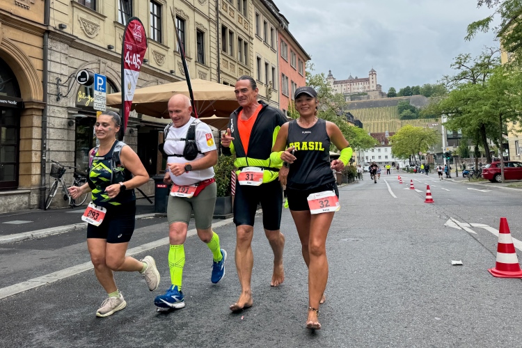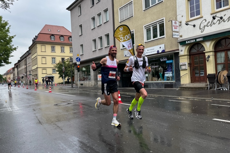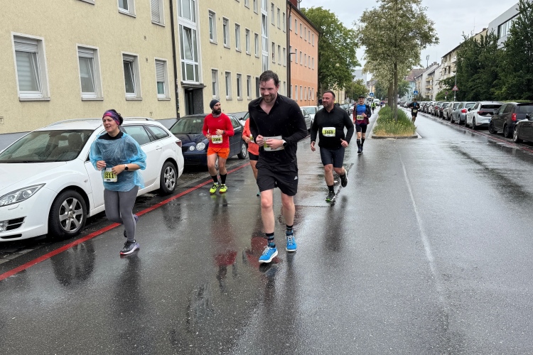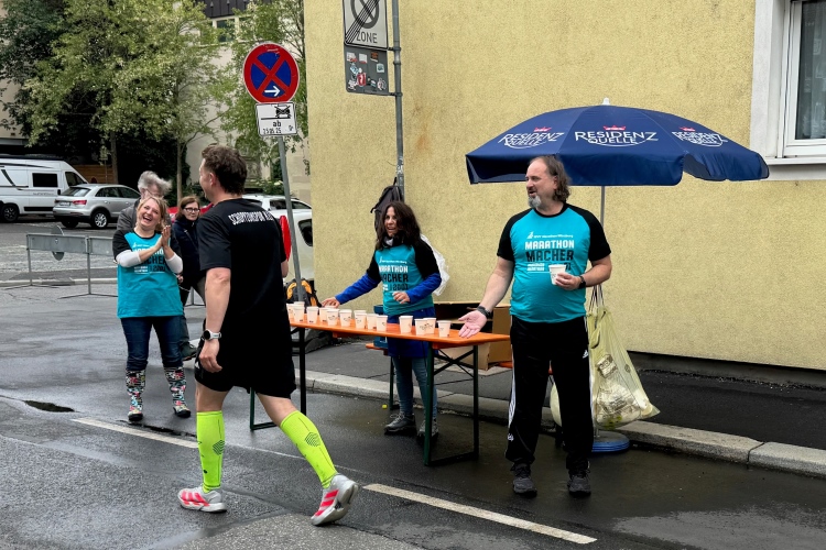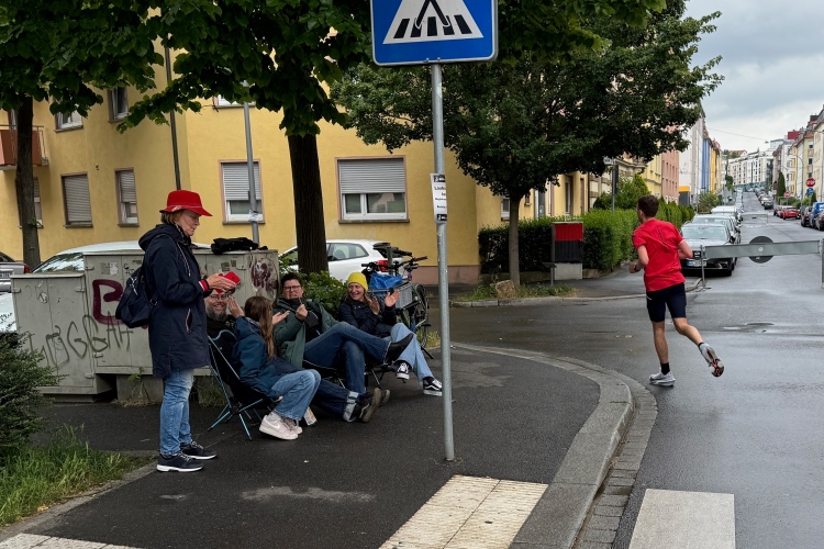 Während sich ab km 30 die Trommelteams langsam auf den Feierabend vorbereiten, sind die Senioren und die Schlager-Combo in Sanderau noch voll bei der Sache. Auch Richtung Altstadt noch einige Stimmungsnester und eine private Grillrunde mit kleinem Gastro-Zelt. 4:45-Pacer Thomas, der mit seiner italienischen Kollegin ordentlich auf die Tube gedrückt hat, fragt, ob man ihm eine Wurst übriggelassen hätte. Aber für einen ausgiebigen Imbiss fehlt jetzt eigentlich die Zeit.