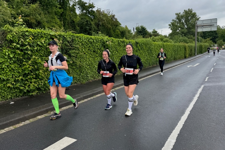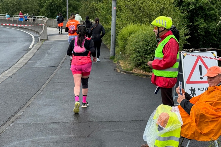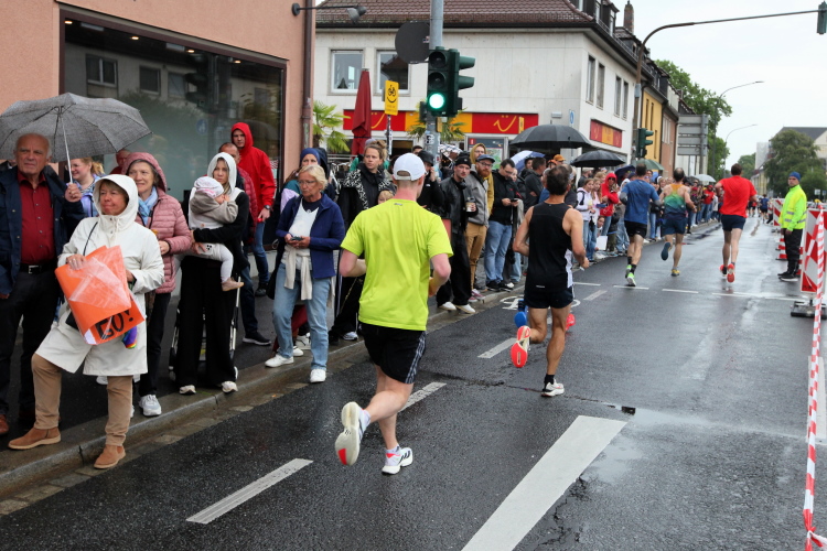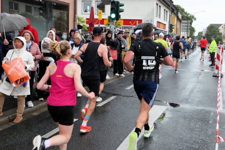 Jetzt ist reichlich Platz für alle, Verpflegung und Trommelgruppe sind auch noch aktiv. Bei der Begegnungsstelle nach km 24 entsteht mit Blick auf die 4:30-Pacer und ihr „Gefolge“ kurzzeitig noch mal der Eindruck von Fülle. Dann geht alles den schon von der ersten Runde her bekannten Gang, mit weniger Publikum, aber mit immer noch sehr engagiertem VP-Personal.