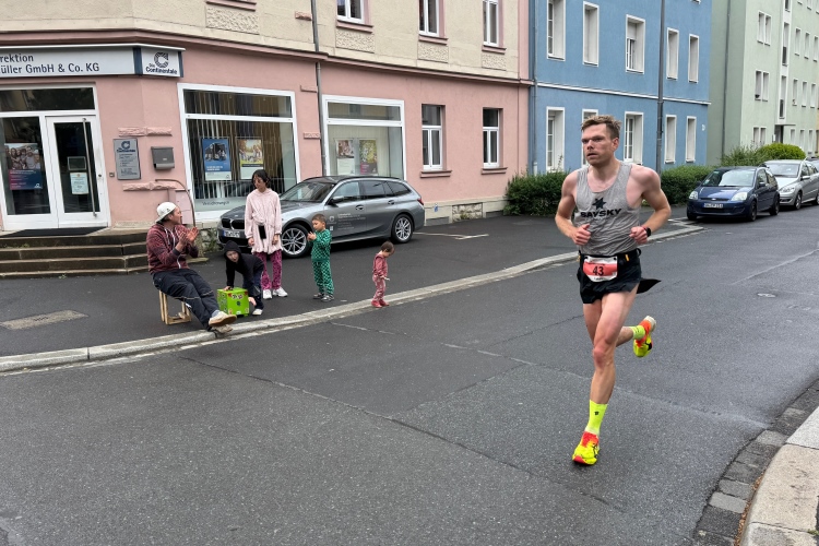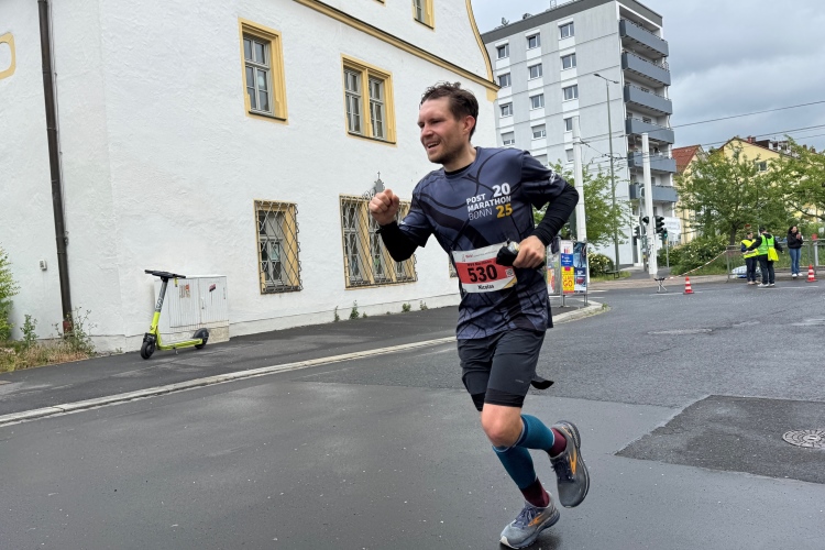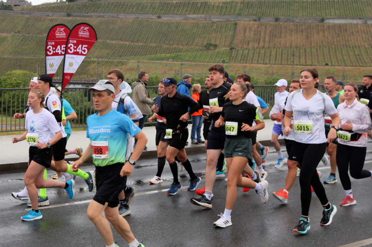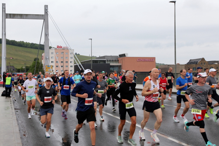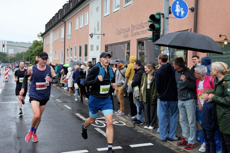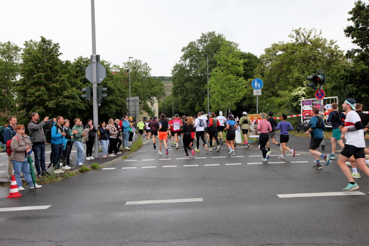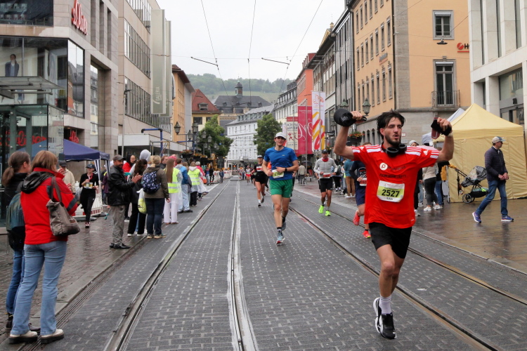 Für die Marathonis wird es ohne die „Halben“ nun sehr viel einsamer. Das Feld hat sich deutlich auseinandergezogen. Bei Kilometer 21,1 Zeitmessung. Davor das Heizkraftwerk, links auf der Terrasse zwei chinesische Löwen. Dann zurück auf die bekannte Straße und bald danach zur Brücke der Deutschen Einheit. Nach der Biegung Richtung Zellerau stehen einige Streckenposten und feuern an, ebenso wie beim Übergang zu den Grünanlagen am Main, wo der Moderator zum Sound von Nenas „99 Luftballons“ jeden einzelnen der noch im Rennen Verbliebenen abklatscht.