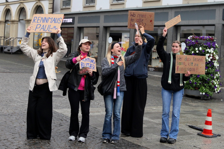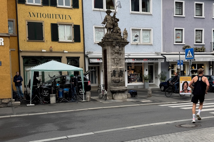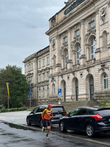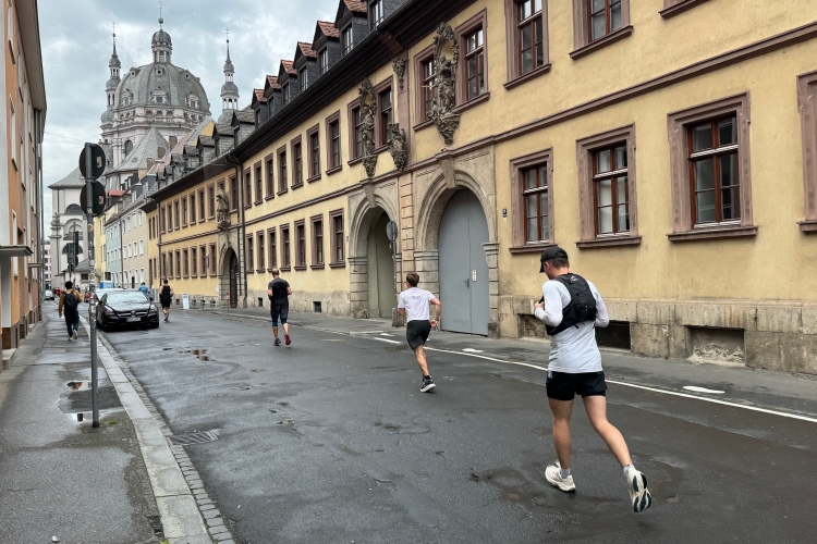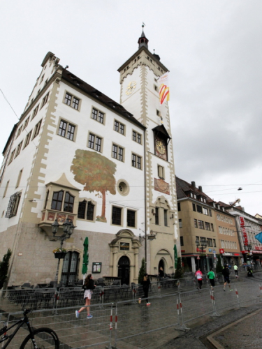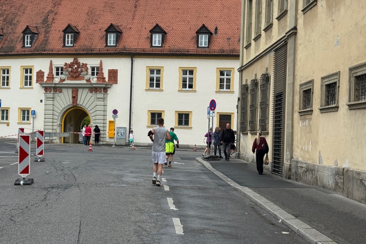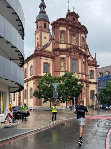 Bei km 15,5 drehen wir rechts auf die Alt-/Innenstadtrunde. In vier Kilometern kommen wir hierher zurück. Am Unicafé hat eine Band Stellung bezogen und unterhält sowohl Laufende als auch Frühstücksgäste. Die Neubaukirche aus dem Jahr 1591 mit dem markanten 91 m hohen Turm wird zu den bedeutendsten Renaissancekirchen nördlich der Alpen gerechnet. Die ehemalige Universitätskirche, inzwischen profaniert, dient heute als Aula. Rechtskurve. Früher war hier mehr los. Wo ist der fetzige Alleinunterhalter? Dafür als Highlight ein junger Ordner, der wirklich Stimmung macht und sich dabei wahrscheinlich die Stimme ruiniert.
