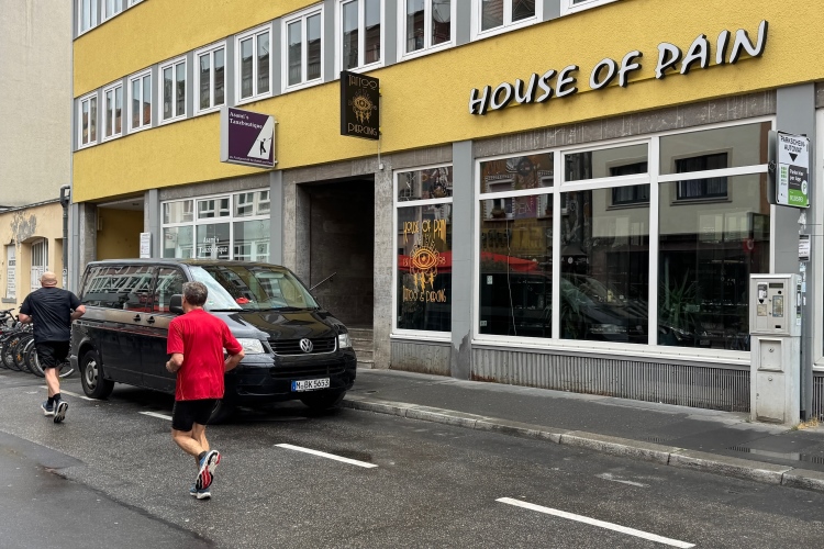 Zurück und dann rechts abbiegen. Neu ist der Blick auf das Bürgerbräu. In Zellerau gilt es noch einige Straßen abzulaufen, auch am Alpenvereinsgebäude mit großer Kletterwand vorbei. Zuschauende gibt es einige. Ich freue mich immer auf das Eck mit dem Graffiti-verzierten Kiosk. Da ist immer viel los. Kurz danach klärt mich eine Frau auf, dass der stattliche Hund, der auf ihrem Arm vor sich hindöst, erst acht Wochen alt ist. Das wird wohl später ein riesiges Tier.