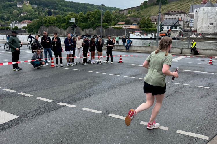 Wieder leicht nach oben steht bald das nächste Highlight an: An der Alten Mainbrücke sieht man wieder viele Zuschauer, da hier eine Staffelwechselstelle ist und Touristen auf dem Weg zur Festung vorbeikommen. An einem Haus eine Wandmalerei mit unterschiedlichen Arbeitern, darunter ein Mann mit einem Schwein unter dem Arm. Hier rechts führt der Weg hinauf zur Festung. Davor die Kirche Sankt Burkhard, dann vor einer Überführung die Jugendherberge mit sehenswerter Fassade. Leicht rechts am Hang thront die Wallfahrtskirche Käppele aus dem 18. Jahrhundert mit Rokokoarchitektur, leicht verdeckt durch Bäume.