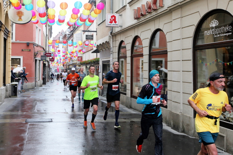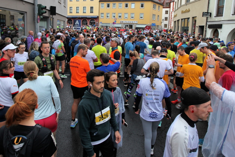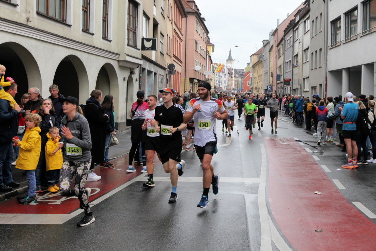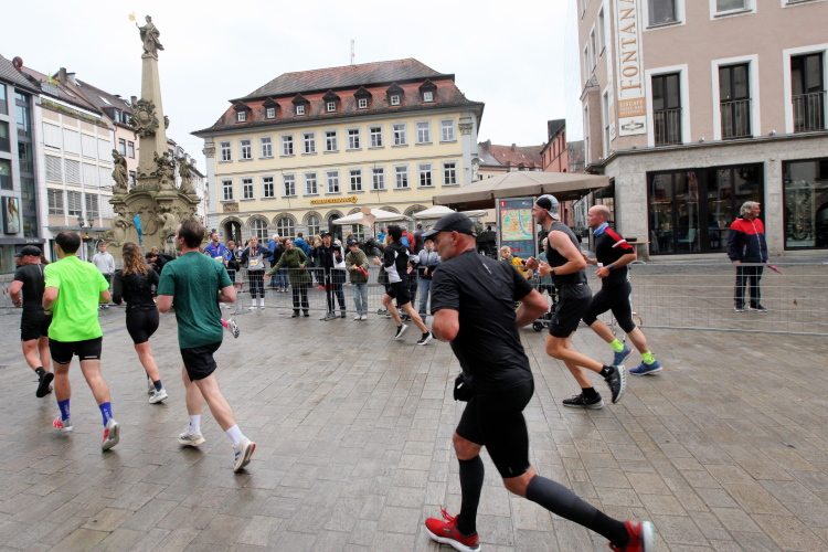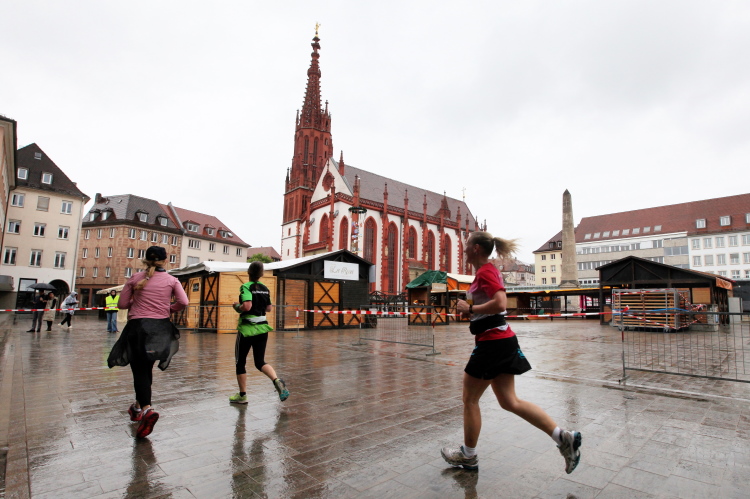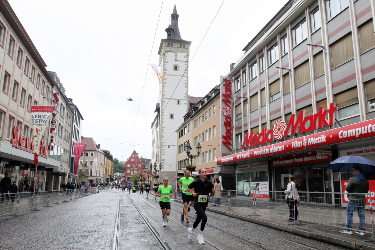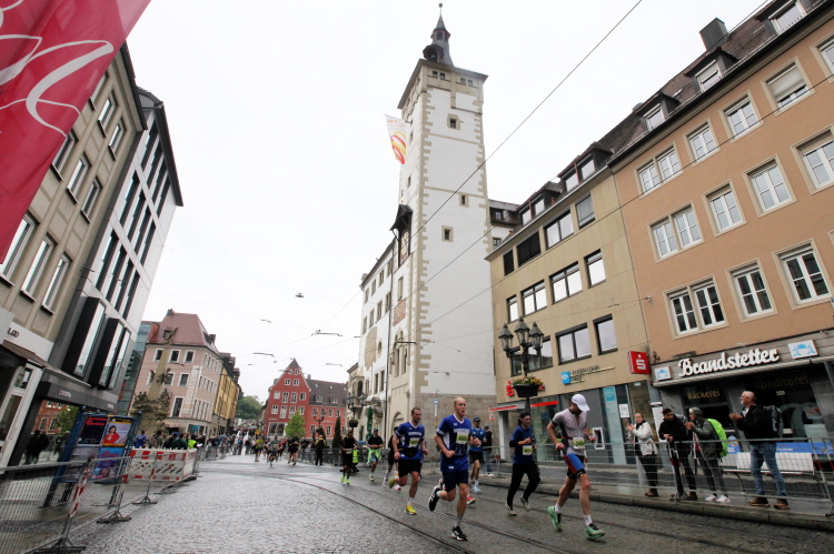 Kilometer 20/41 ist erreicht. Wir halten uns links zum Markt. Die Marienkapelle ist eine farbenfrohe Kirche mit hohem Turm. Über die Karmelitenstraße Richtung Weiche. Eine Band erwartet das Läuferfeld. Die Halbmarathonis laufen geradeaus ins Ziel. Für den Marathon Gemeldete, die aufhören wollen und nach 21,1 km die Zielmarke überqueren, kommen in die HM-Wertung.