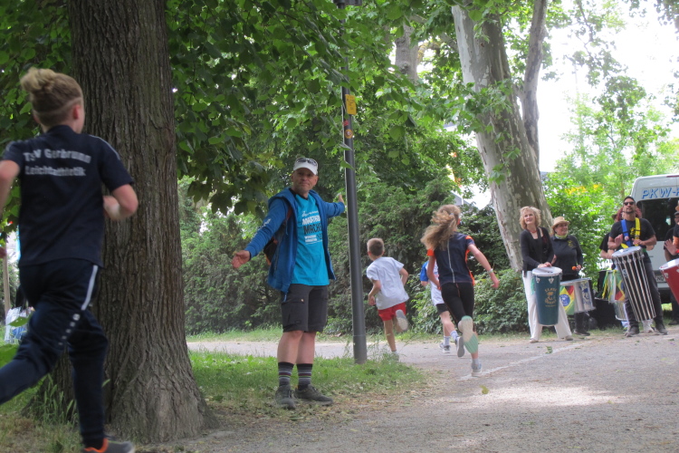 Unter der Ludwigsbrücke hindurch mit Sambaband, die sich schon auf die Pause vor der zweiten Runde freut. Über uns auf der Brücke ein großer Steinlöwe, daher wohl auch der Name Löwenbrücke. Die Läufer werden auf einen Weg neben der Straße geleitet. Man kann über den Kiesweg laufen oder den geteerten Radweg daneben benutzen. Rechts von uns die Straßenbahntrasse. Einige schöne Anwesen am Hang. Links zum Main viele Sportvereine, beispielsweise der Akademische Ruderclub. Der VP kommt wie gerufen.