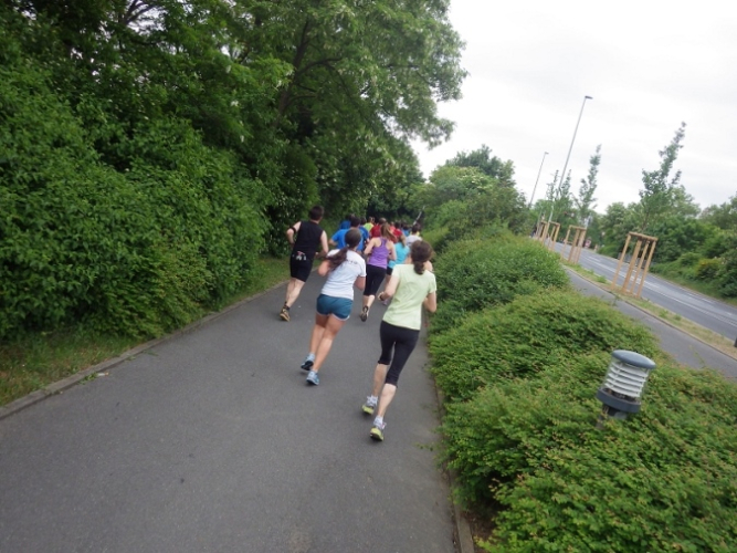 Bei KM 3 erreiche ich die erste Verpflegungsstelle. Noch ist es recht frisch, trotzdem vergesse ich nicht das erste kühlende Nass zu genießen. Vor mir erhebt sich das Kloster Himmelspforten. Die hier angebotenen Exerzitien sollen zu Abstand vom Alltag verhelfen. Das schaffe ich auch mit Laufen. Kurz vor KM 4 erreiche ich den weslichsten Punkt der heutigen Strecke und das erste Begegnungsstück. Der Blick zurück verrät mir, daß Block B schon fast zu mir aufgeschlossen hat. Eine große Gruppe Läufer kommt mir entgegen. Ich komme an der Kletterhalle des Deutschen Alpenvereins vorbei. Auch eine schöne Freizeitbeschäftigung, aber ich bleibe doch lieber wie der Schuster bei seinem Leisten.