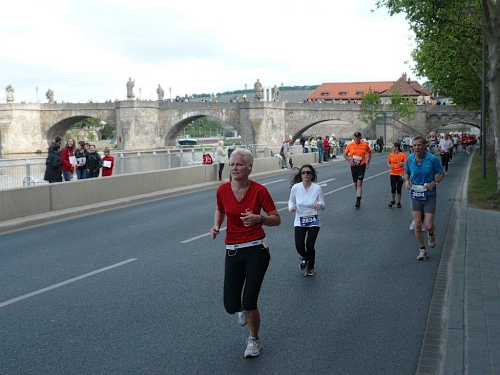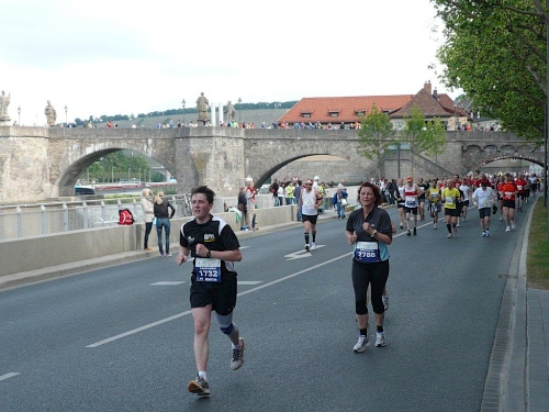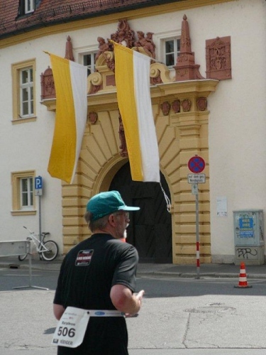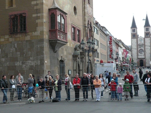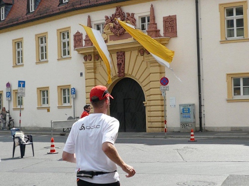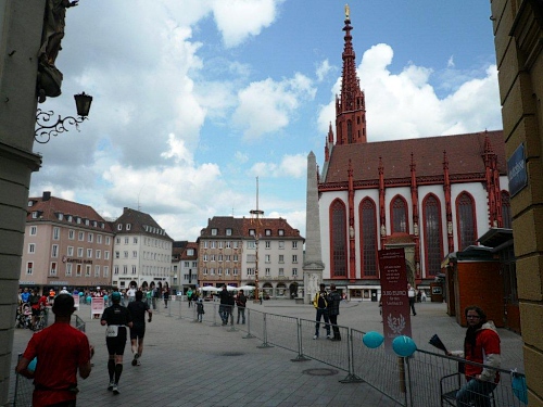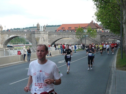 Den Biergarten überlasse ich anderen, auf mich wartet ein Abschnitt entlang des Mains, unter der Friedensbrücke hindurch, an einer Erfrischungsstelle vorbei, hin zu einem Wahrzeichen der Stadt, der Alten Mainbrücke, Würzburgs einzigem Flussübergang bis vor 125 Jahren. Ich weiß nicht, ob ich die Würzburger schmeichle oder erzürne, wenn ich ihnen verrate, welches gespeicherte Bild sich beim Einbiegen auf die Brücke im Kopf öffnet: Das von der Karlsbrücke in Prag. Mir gefällt’s, und entlang des Gefälles zum rechten Mainufer, in dessen Flucht der Dom liegt – auch das ein eindrückliches Bild - stehen viele Zuschauer.