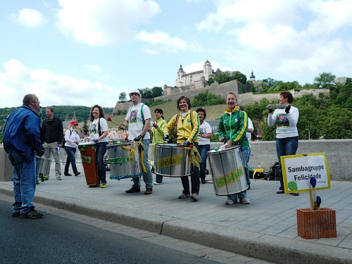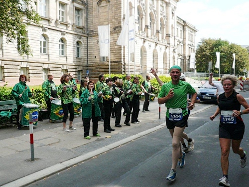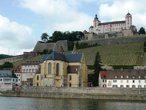 Vor dem Rathaus gibt es eine spitze Kehre. Diese führt uns unter der Alten Mainbrücke durch auf den Mainkai. Auf diesem neunten Kilometer kommen wir in den Genuss von Samba-Klängen und einer unbehinderten Aussicht auf die von Weinreben umsäumte Festung Marienberg einem weiteren, dazu von Weitem sichtbaren Wahrzeichen der Stadt. Unterhalb, am Mainufer, steht Würzburgs älteste Kirche, die nach den ersten Bischof Würzburgs St. Burkard benannt ist.