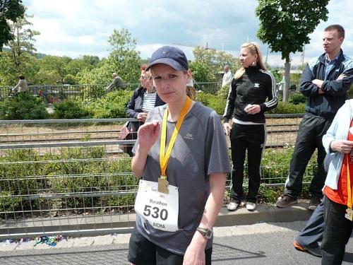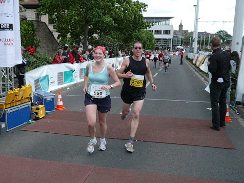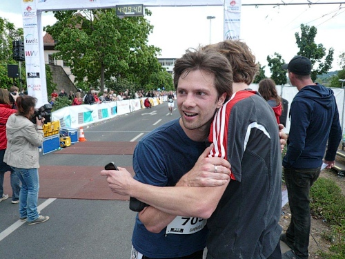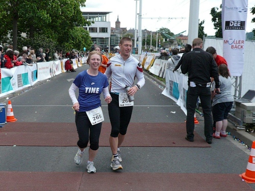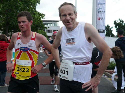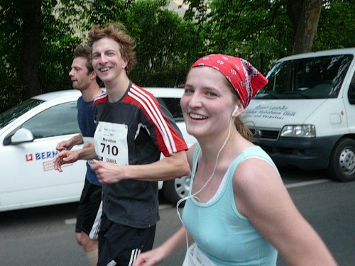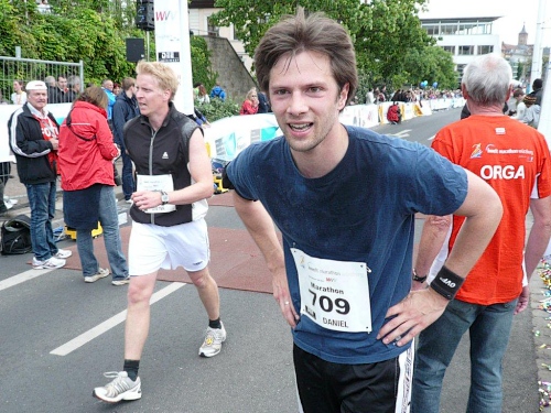 Mirjam trifft immer wieder Bekannte am Straßenrand und lässt abreißen, doch die beiden Daniel sind auch fünf Kilometer vor dem Ziel in guter Form. Von der anvisierten Zielzeit sind sie eine knappe Viertelstunde entfernt – zu ihren Gunsten! Das nenne ich gute Vorbereitung und gute Einteilung. Mit einem von ihnen ziehe ich die letzten eineinhalb Kilometer durch und gemeinsam kommen wir auf eine Zeit von 4:00 und einigen Sekunden. Der andere Daniel folgt uns mit nur einer Minute Abstand. Was ihre Leistung zusätzlich auszeichnet: Sie haben diese Zeit mit einem „negative split“ erreicht. Alle Achtung!