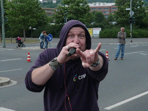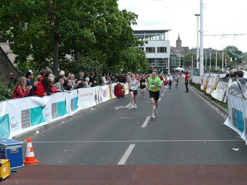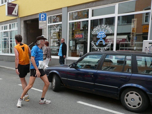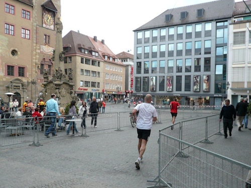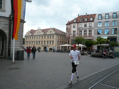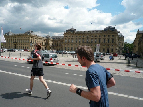 Bei der Neubaukirche werde ich aus meinen Gedanken gerissen, denn an der Begegnungsecke kommt das Spitzenfahrzeug gefahren, gefolgt von einem dunkelhäutigen Läufer. Noch ist es über ein Kilometer bis zur Halbzeit und der Führende ist mir bis auf drei Kilometer aufgerückt. Entweder bin ich sehr langsam oder er sehr schnell.