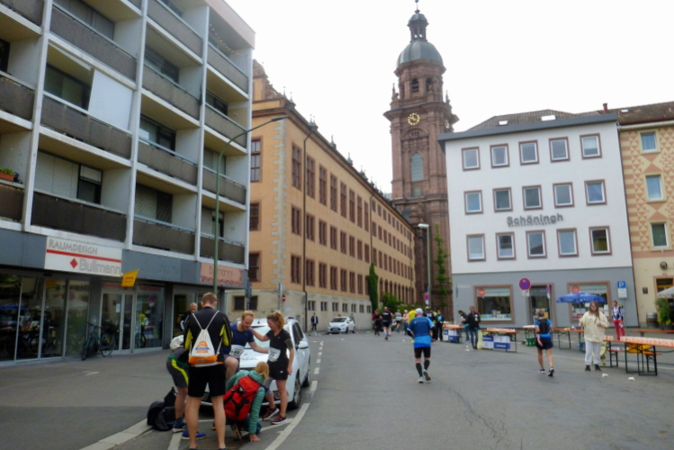 Kreuz und quer geht es durch Zellerau durch Wohn- und Industriegebiete, Zuschauer sind weniger zu sehen, es ist ja noch früh am Morgen. Bei Kilometer drei steht schon die erste Erfrischungsstelle mit Wasser, die ich auslasse. Ich habe noch keinen Durst. Alle fünf Kilometer gibt es dann Verpflegungsstellen mit vollem Programm (Wasser, Apfelschorle, Cola, Isogetränke, Bananen).