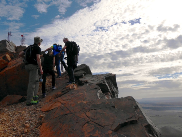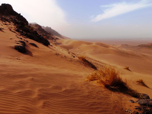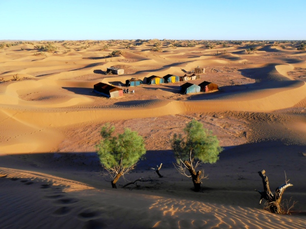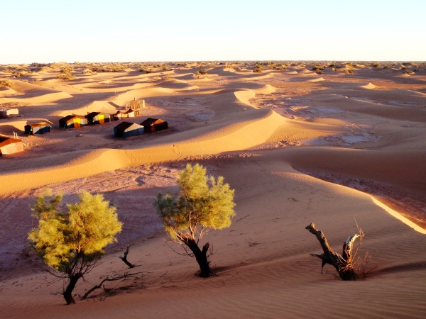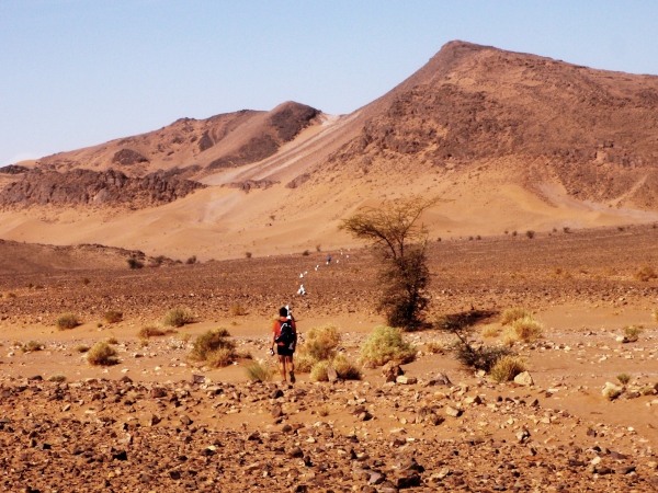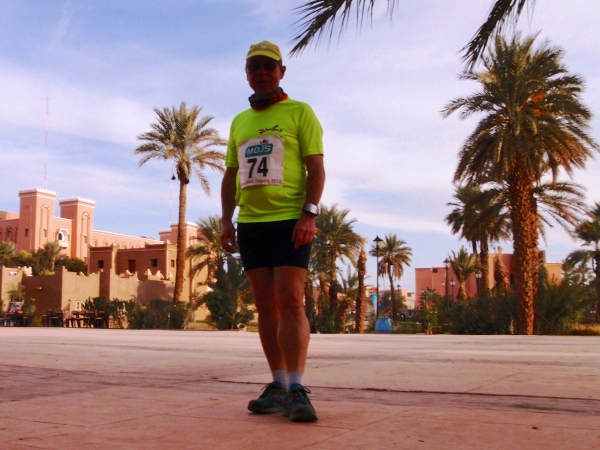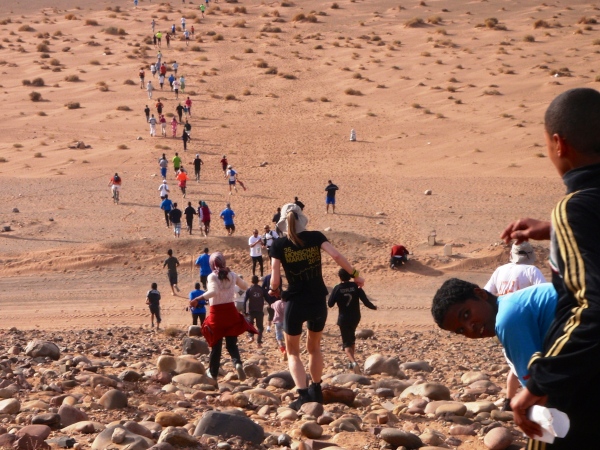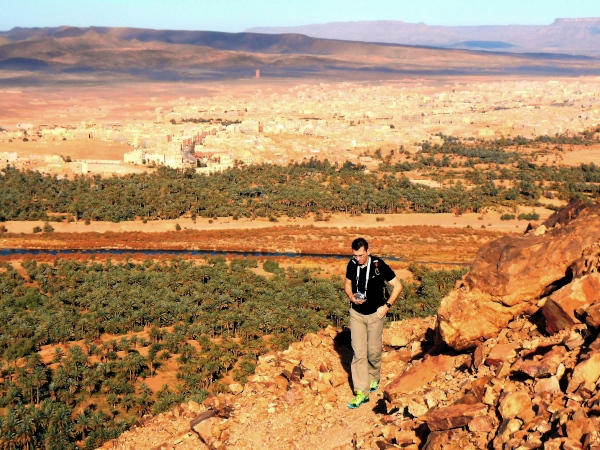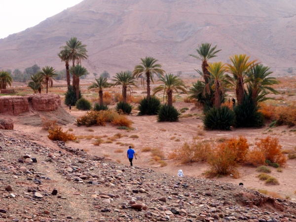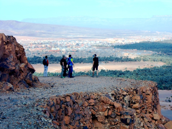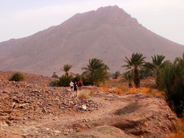 Der folgende Tag bietet Gelegenheit, sich in den immerhin 730 Metern Höhe von Zagora zu akklimatisieren – und mit einer Besteigung des 974 m hohen Zagoraberges einen Überblick über einen Großteil der Marathonstrecke zu verschaffen. Der Berg überragt das Draa-Tal zwar gerade einmal um 250 Höhenmeter, bietet aber gleichwohl einen fast „alpinen“ Auf- und Abstieg in nahezu vegetationsloser Fels- und Gerölllandschaft. Die Aussicht prägen die weiten, relativ flachen Geröllhänge rings um Zagora und südlich des Berges, unterbrochen von wenigen Sandflächen und den Palmenhainen in der Flussoase des Draa. Beim Abstieg gibt es – weniger schön – die Bauruine eines Hotels, interessanter dann Befestigungsanlagen aus der Almoravidenfestung-Zeit zu sehen, ehe es unterhalb der Straße zunächst abenteuerlich längs eines großen Bewässerungskanals, dann gemächlich durch Palmenhaine nach Zagora zurückgeht.