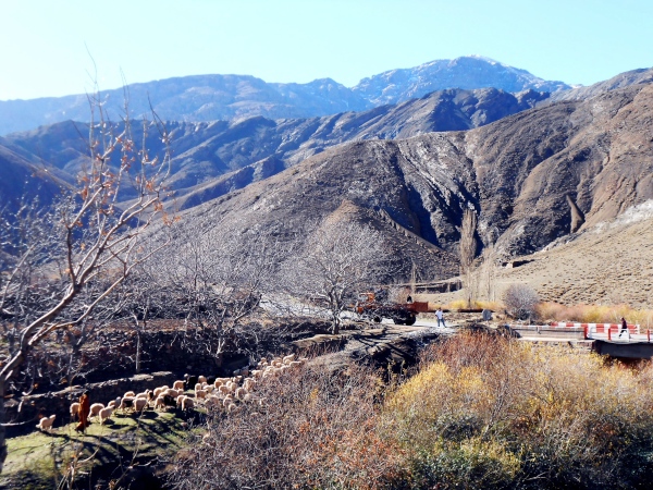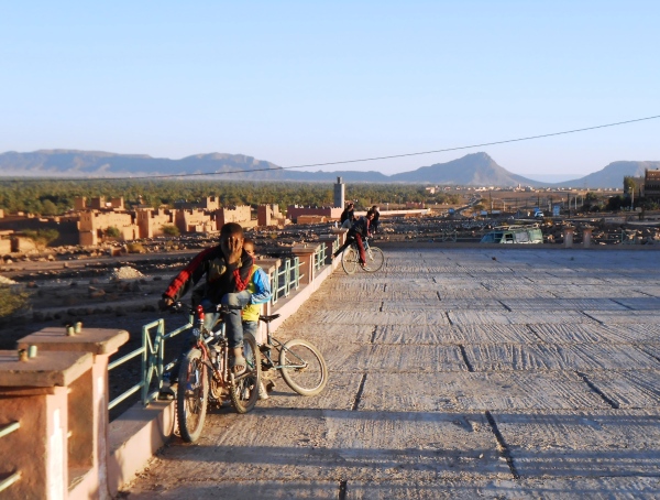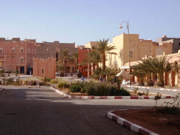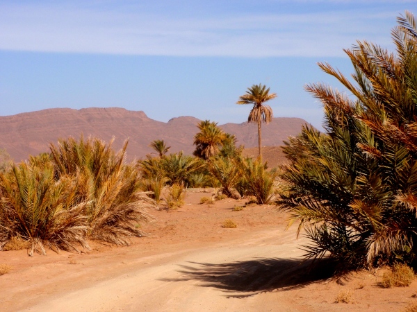 Südlich von Agdz, wo wir für einen Kaffee anhalten, ändert sich das Landschaftsbild wiederum, denn wir haben die Flussoase des Draa, der durch einen Stausee oberhalb Quarzazate meist trocken liegt, erreicht: Links säumen durchgehend Palmenhaine und Dörfer die Straße, hinter denen sich durchgehend eine beeindruckende Bergkette erhebt, rechts liegen wüstenhafte, landwirtschaftlich ungenutzte Hänge, die nur gelegentlich steiler sind. Kurz vor Zagora weitet sich das Becken des Draa-Flusses, gibt aber schon den Blick frei auf den Zagoraberg (974 m) mit seinen Sendeanlagen und die östlich anschließenden, max. 1027 m hohen Berge des Jbel Adafane: Diese werden wir während des Marathons zum Teil umlaufen.