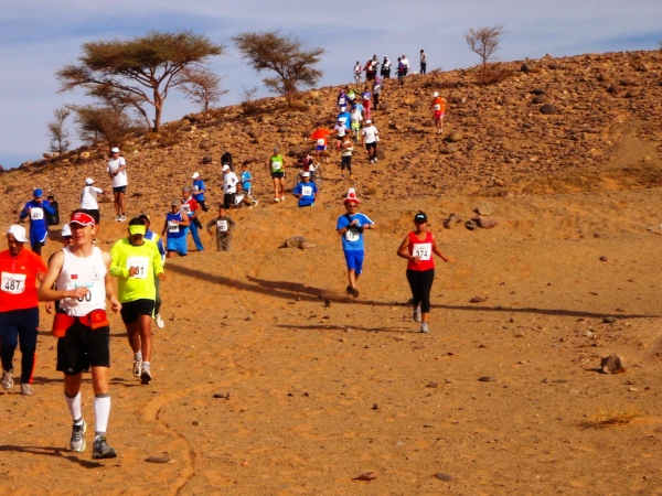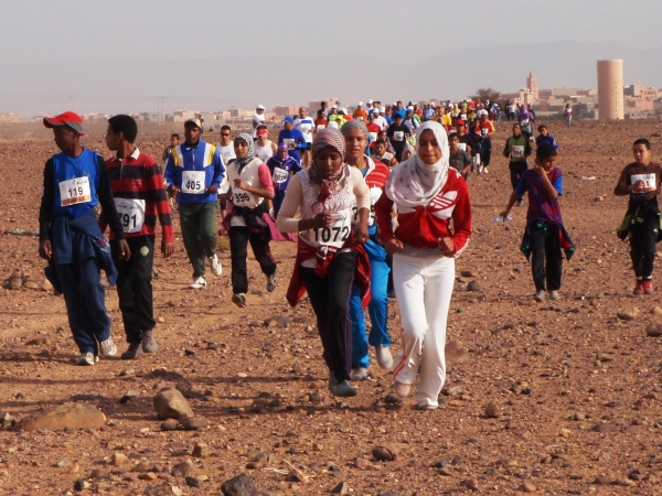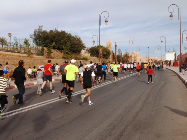 Abwechslungsreicher Rundkurs durch alle Landschaftstypen im Raum Zagora: Die Stadt wird schon nach gut 1 km verlassen, anschließend überwiegend Geröllwüste mit kurzen sandigen Abschnitten und einem Steilabstieg bis km 10; Querung des Draa-Flusses (2013 völlig ausgetrocknet). Dann auf sandigen, gut belaufbaren Wegen durch eine Oase, bei km 12,7 Abzweig der Halbmarathon-Strecke und ab km 16,8 (Straßenüberquerung, bis dahin gute Wege) in eine teilweise schlecht laufbare Geröllwüste.