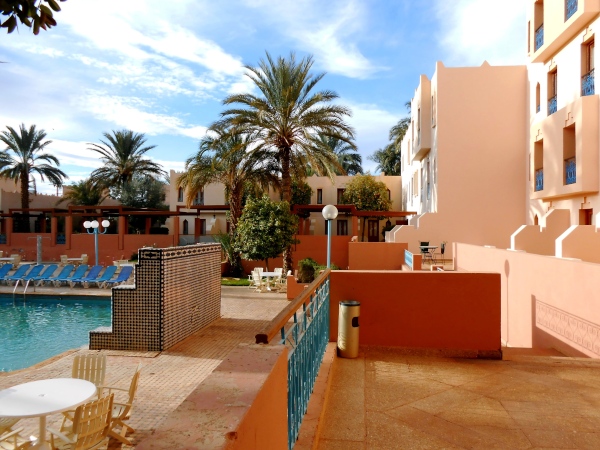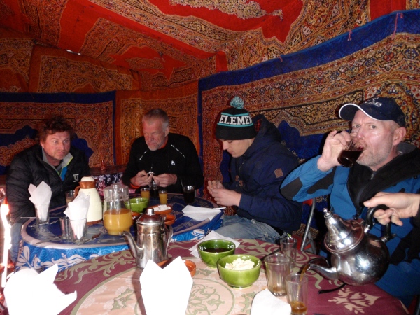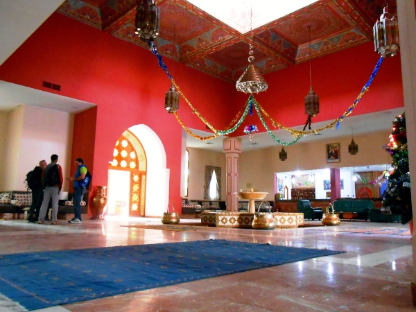 Schon am Anreisetag halten wir in Zagora beim Marathonzelt: Hier gibt es unsere Startnummern und sonst zwar nicht viel zu sehen, aber als Zeichen der Gastfreundschaft sogleich Tee für alle und eine erste Begegnung mit einem der beiden Ahansal-Brüder, die den Marathon organisieren. Schade, ich versäume, mir für 50 Dirham (5 Euro) gleich eine Medaille zu kaufen, weil ich mir diese erst „verdienen“ möchte: Dass die Medaillen nach dem Marathon ausgerechnet für die Marathonis ausgegangen sein werden, konnte ich nicht wissen! Schließlich checken wir im architektonisch gelungenen Hotel „Reda“ nahe dem Sitz der Provinzverwaltung und des Startplatzes ein. Das Hotel ist sauber, die Zimmer sind großzügig – nur das Essen eher „französisch-aufgewärmt“ als marokkanisch und quantitativ, gerade auch beim Frühstück, für Marathonläufer etwas spartanisch.