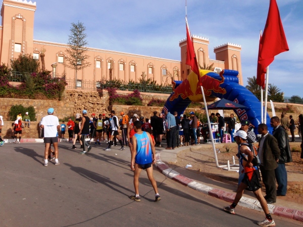 Der Sonntag ist Marathontag: Eigentlich ist der Start für 9:00 Uhr Ortszeit angesetzt. Hunderte von Läufern tummeln sich am Startplatz, während der angrenzende, neu angelegte Park fast menschenleer ist. Während die Sonne immer kräftiger „einheizt“, verschiebt sich der Start um eine halbe Stunde. Überwiegend dominieren Kinder und Jugendliche das Bild: Sie alle sorgen für einen „Massenstart“, auch wenn viele von ihnen nach zwei, drei Kilometern aufgeben und noch nicht einmal nach fünf Kilometern auf die neu angebotene 10-km-Runde abzweigen: Aber offenkundig ist der Zagora-Marathon für alle Beteiligten das wichtigste Sportereignis vor Ort und dabei sein wichtiger als konsequent ein Rennen zu laufen. Nur einen einzigen Vater sehe ich seinen etwa 10-jährigen Sohn auf das Rennen vorbereiten – die anderen Kinder und Jugendlichen sind offensichtlich ohne ihre Eltern am Start.