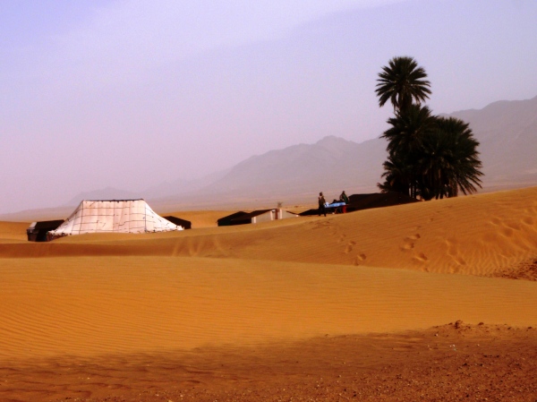Ein weiterer Dünenkamm ist schnell erklommen, und der Blick nach links auf die jetzt hinter uns liegenden Berge, aber auch voraus in die Ebene von Zagora zeigt, wie sehr heute Sand aufgewirbelt wird und den Blick auf die in die Ferne liegenden Berge verschleiert. Durch Geröll geht es weiter, bis ich plötzlich hängen bleibe, nach vorne den Halt verliere, mich schon in die spitzen Gerölle stürzen wähne ... bis ich gerade noch den Sturz abwenden kann, das aber um den Preis einer gewaltigen Überdehnung vom Knie des rechten Beins über den rechten Oberschenkel bis in die linke Schulter – ein übler Schmerz! Und laufen geht danach erst einmal gar nicht mehr, die Kraft ist weg, und das bei Kilometer 27! Aber aufgeben gilt nicht, zumal mich der Läufer, den ich zuvor überholt habe, auffordert, weiter zu laufen. Nur mühsam, fast nur gehend, erreiche ich die nächste Wasserstelle (km 29), die mitten auf einer niedrigen Sanddüne liegt, ein Beduinenlager neben zwei, drei Palmen, malerisch anzuschauen, wenn ich dafür jetzt nur die entsprechenden Empfindungen aufbringen könnte.
