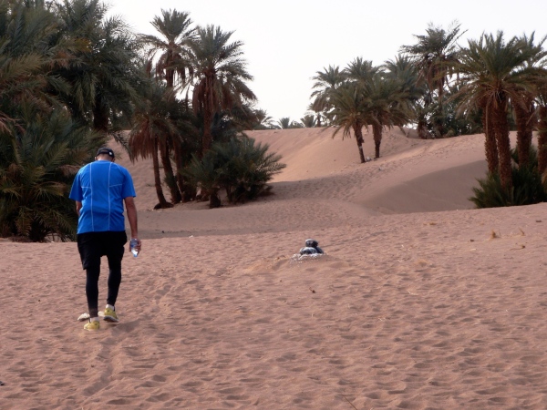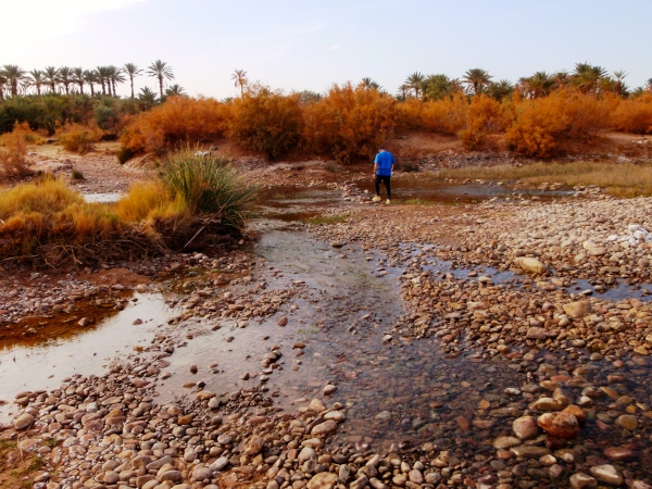 Überraschenderweise kann ich ihnen und zwei anderen Läufern dann trotz Gehpausen fast folgen, bis der gute Weg durch einen schmalen Geröllsteig am Hochufer der Draa abgelöst wird. Zwar ist das Geröll hier rund, nicht scharfkantig, aber das rechte, kraftlose Bein verhindert, dass ich zum Laufen komme. Dann geht es hinunter zum Bachbett, das hier sogar auf gut fünf Meter Breite fast 30 Zentimeter tief Wasser führt. Das Balancieren auf den Steinen der Furt klappt natürlich prompt nicht, doch das Wasser in den Schuhen stört nicht. Denn kurz darauf weisen die sonst zwar meist sehr guten, hier aber eher kargen Markierungen wieder in den haltlosen Sand einer langgestreckten Düne mitten in den Palmenhainen, und während Erika und Bernd längst außer Sichtweite vor mir sind, muss witzigerweise ich einem Marokkaner aus Casablanca den Weg weisen.