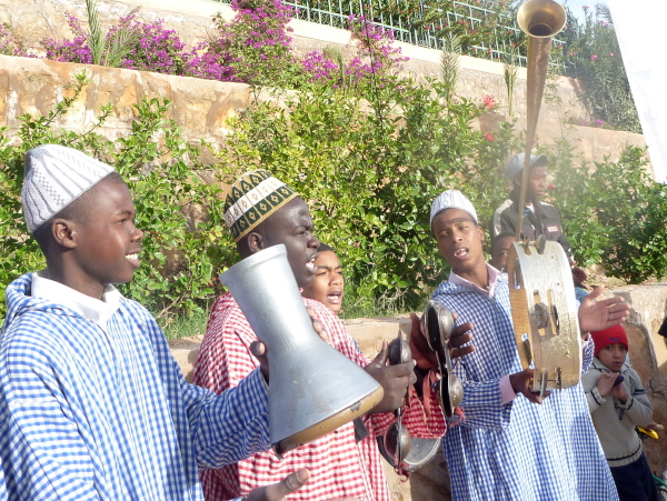 Zum ersten Mal wird ein 10 km-Lauf angeboten, zusammen mit dem HM und dem Marathon (ca 80 Läufer) versammeln sich etwa 1500 Läufer vor dem Startbogen. Nur die Marathonläufer und die schnellsten HM-Läufer erhalten einen Chip (in der Startnummer). Die zahlreiche Jugend braucht kein Startgeld zu zahlen, schliesslich will man hier auch Nachwuchsläufer entdecken. Auch mein Freund, der bärtige Mahtaj Ismail, zahlt kein Startgeld. Er hat die 400 km Reise aus Casa in mehreren Tagen bewältigt. Die Sponsoren- und Startgelder werden für den Bau einer Schule in der Region Boutyous verwendet.