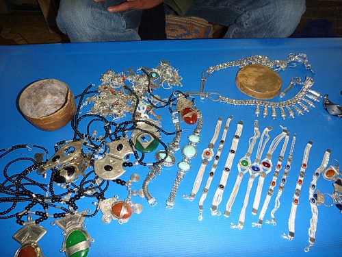 Den Tag verbringt man mit Einkaufen und Teetrinken. Der extrem starke Pfefferminztee wird mit sehr viel Zucker versetzt, bis er zähflüssig ist.Nach einem Tag weiss der ganze Ort, dass ich wenig Zucker möchte. Wenn ich in den Geschäften sitze und mit den Einheimischen quatsche, kommen verschämt „ les gents du desert“. Wüstenleute, wollen den Händlern Edelsteine oder Schmuck verkaufen, trauen sich nicht herein, weil ich dort sitze und Tee trinke. Ich frage dann, was die Berber oder Tuareg gesagt haben, frage woher das Silber kommt, die riesigen Wüstenrosen, wie es sich lebt da draußen und höre unglaubliche Geschichten über die Natur, die Sterne, das Überleben.