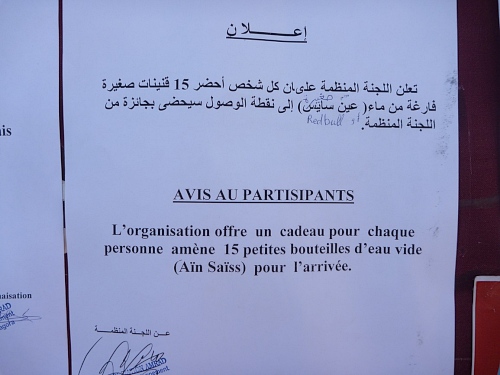 Der Marathon entspricht einer Etappe des Marathon Des Sables. Duschen manchmal warm, im Hotel, Jugendherberge (neben Hotel Riad), oder den zahlreichen anderen einfachen Unterkünften. Maximale Entfernung zum Start/Zielgelände 700 Meter. Petite Taxies im Gegensatz zu Grande Taxies (Busse) kosten 5 DH im Ortsbereich.