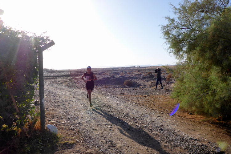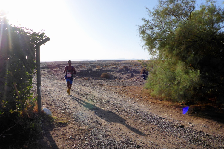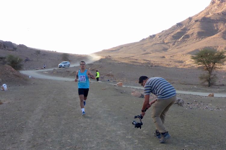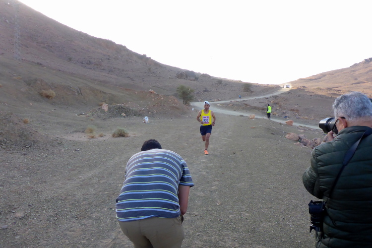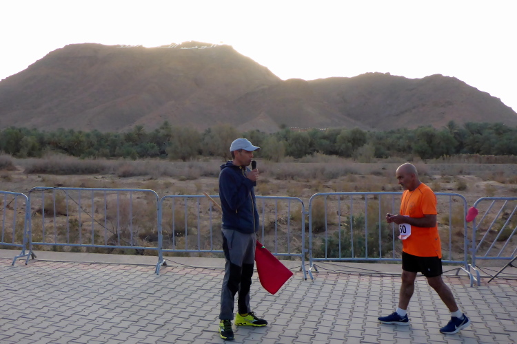 Wir wechseln auf die Strecke der 26 Kilometer-Läufer. Auffallend ist Aziz Yachou, der gewinnen wird. Im anschließenden Interview wird er von seinem MdS Traum erzählen. Sein Bruder Hamid ( heute Platz zwei bei den 52 km) war der Besenläufer beim Trans Atlas 2018, für ihn haben wir Laufschuhe mitgebracht, die sind aber verschwunden. Hinter Hamid wird Frank den dritten Platz bei den 52 km einnehmen, doch nach einer Woche auf Platz 4 abgerutscht sein.