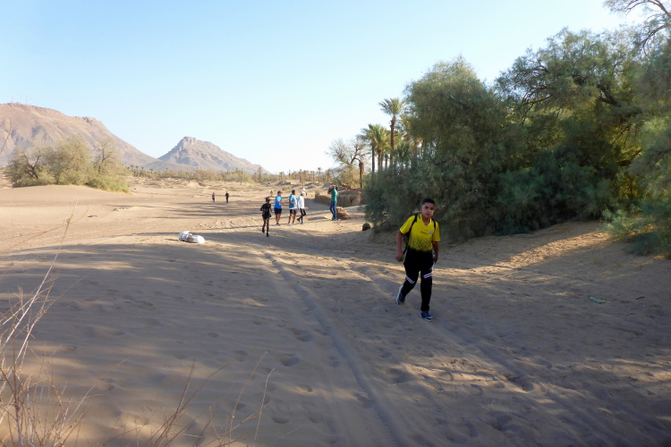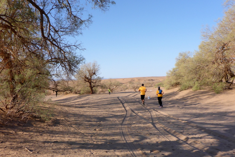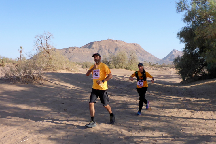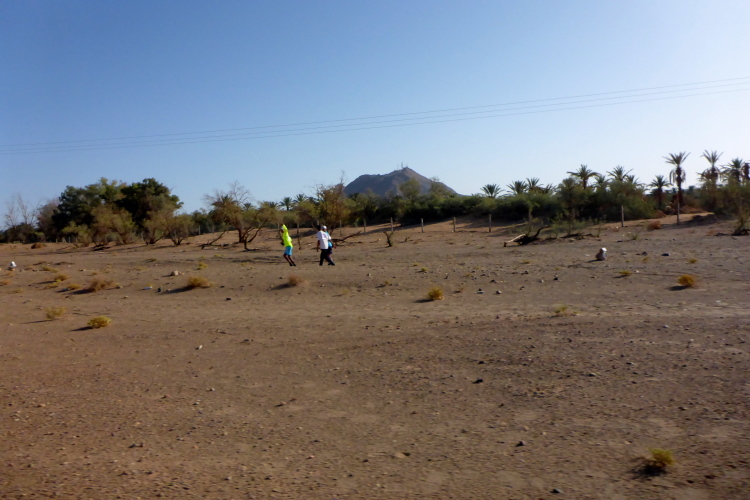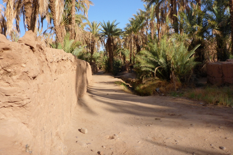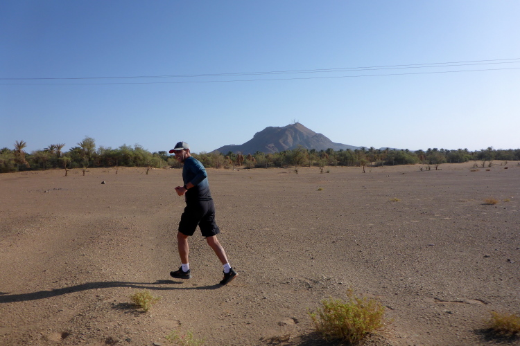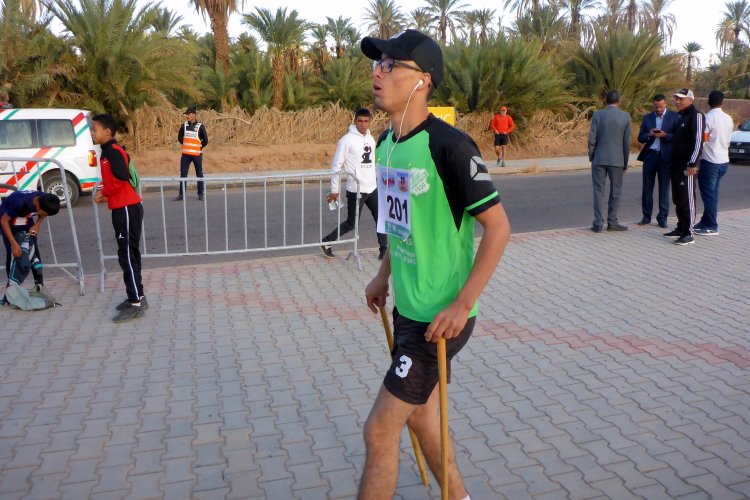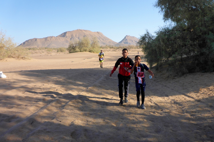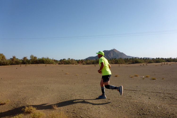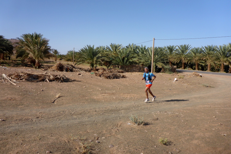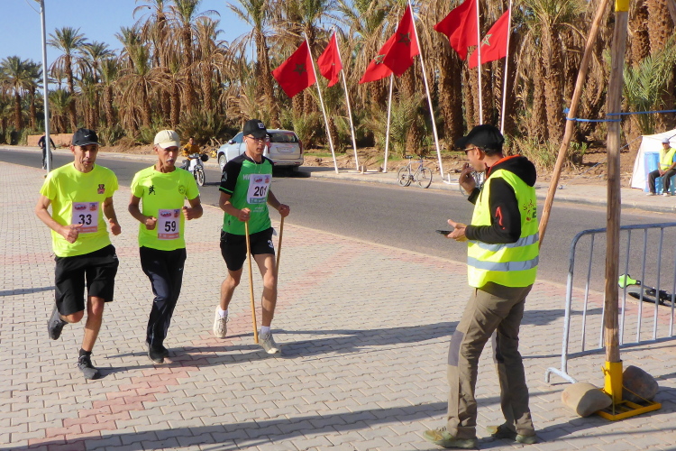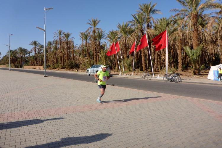 Folgende Strecken gibt es 52 km (neu 2 x 26), 26 Kilometer und 10, die 14 sind. Verpflegung: Wasser ( 1,5 Liter am Start, dann 0,25), Orangen, Datteln, Zucker. Bei den 52 km sollte man auch mal auf 20 Kilometern ohne alles auskommen, dies ist Afrika. Streckenplan, Website oder gar Track gibt es hier in der Sahara nicht. Jedoch sind genügend 4x4 Autos auf der Strecke, die Streckenmarkierung für Vollblinde geeignet. Zeitlimit: Sonnenuntergang, also ca. 19 Uhr. Es geht durch Dattelhaine, zwischen kühlenden Lehmmauern, entlang Wassergräben, durch Steinwüste.