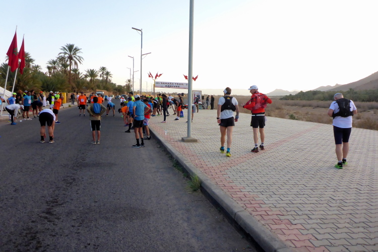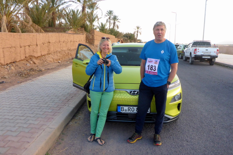 Mohamed bringt uns mit Hochgeschwindigkeit per Auto zum Start, die zahlreichen Polizisten springen zur Seite, Mohamed darf schnell sei. Ein Paar mit Berliner Kennzeichen am E Auto muss völlig verrückt sein, leider keine Zeit für ein längeres Gespräch. Zwei überdrehte Portugiesen gibt es noch, sonst kann ich nur Marokkaner erkennen. Lahcen wollte eigentlich, dass wir die Startgebühr ( 60, 25, 10 Euro) vor dem Start zahlen, aber dafür ist keine Zeit.