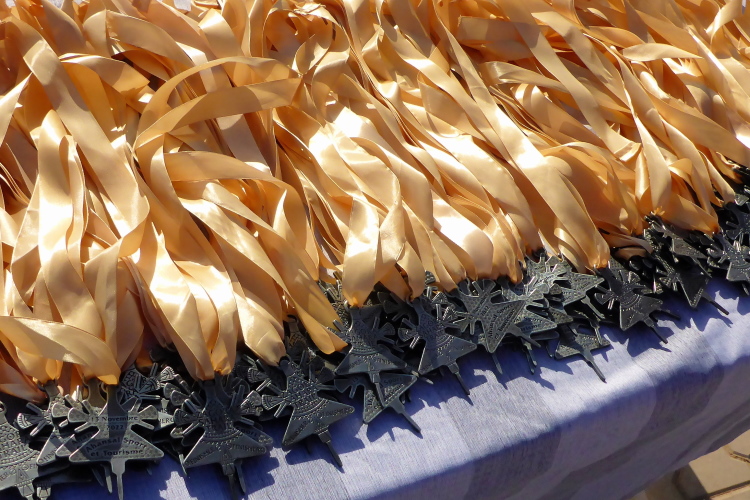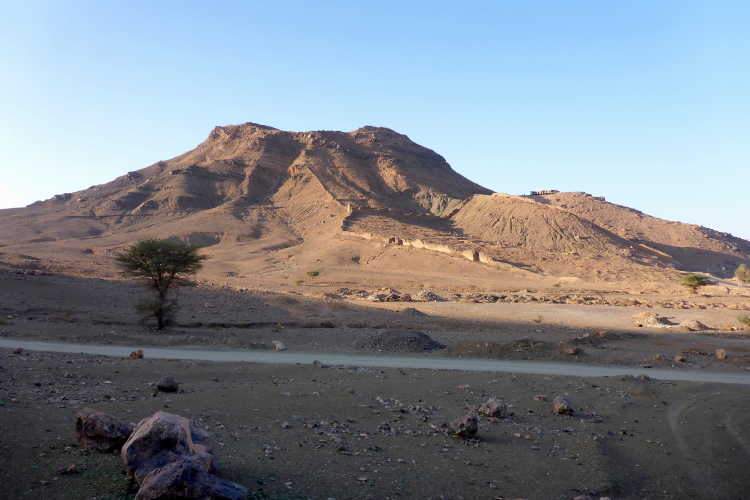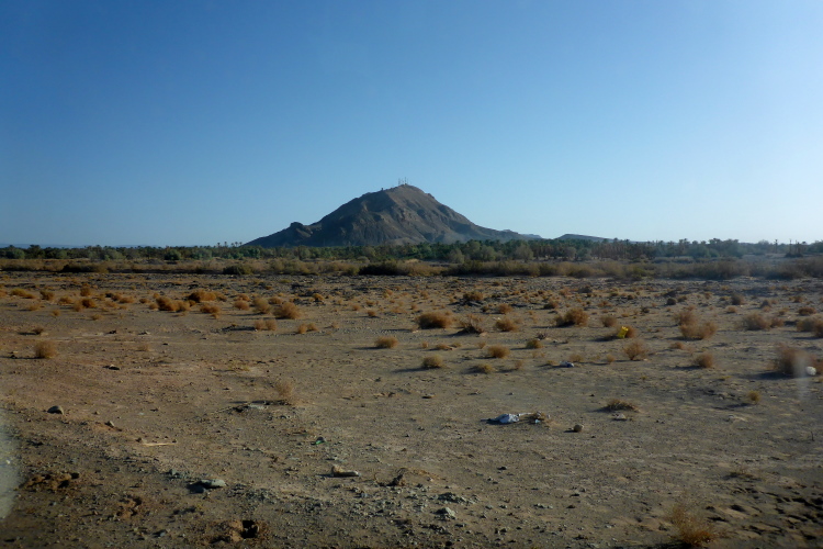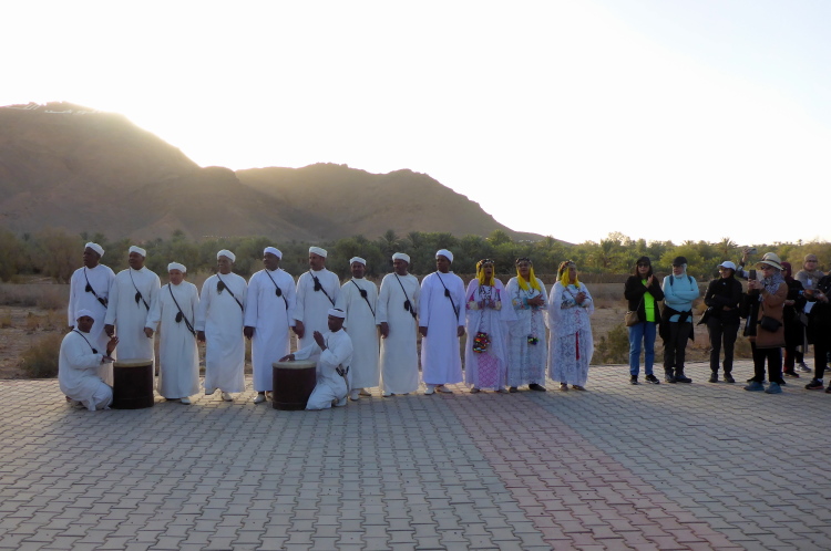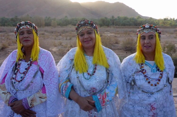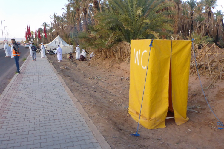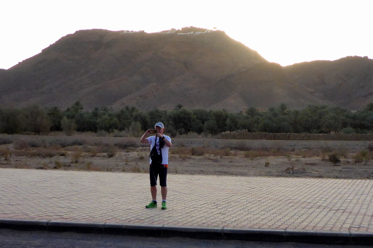 Vom schattenlosen Startplatz am Dráa Fluss, haben wir freien Blick den Jbel (Berg) Zagora. Zwar sind nur 200-300 hm zu überwinden, aber der Pfad ist steil. Zagora liegt in einer Höhe von ca. 700 Metern, da haben die zwei Damen aus der Schweiz, die auch für das Team Kelbel starten, klaren Vorteil. Es sind viele wichtige Leute versammelt, es dauert 15 Minuten, bis alle genug Fotos haben.