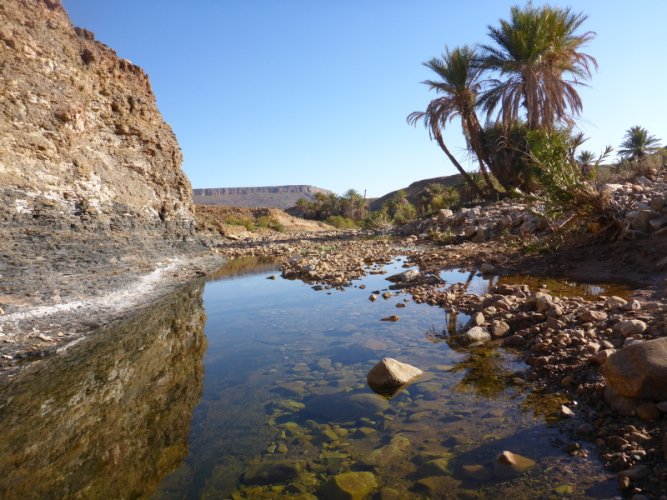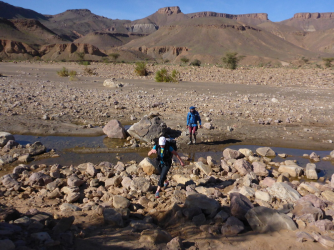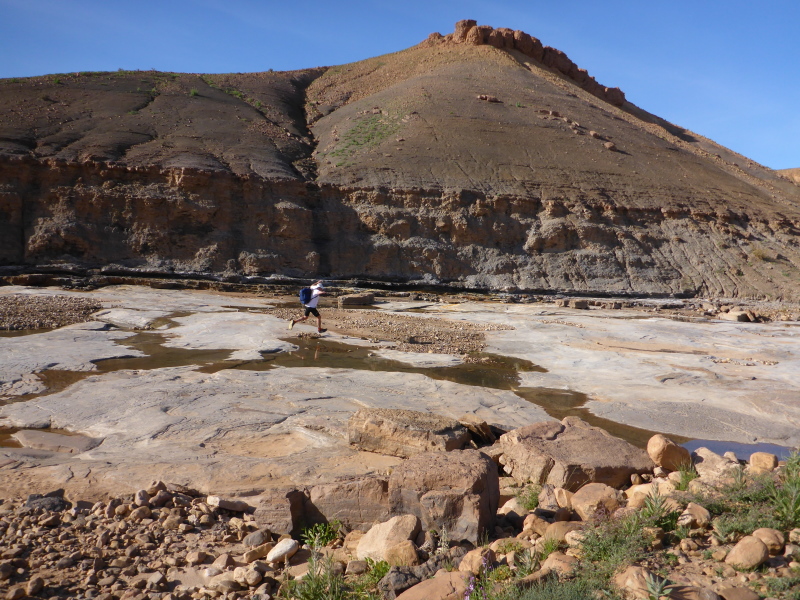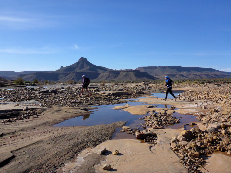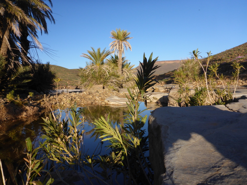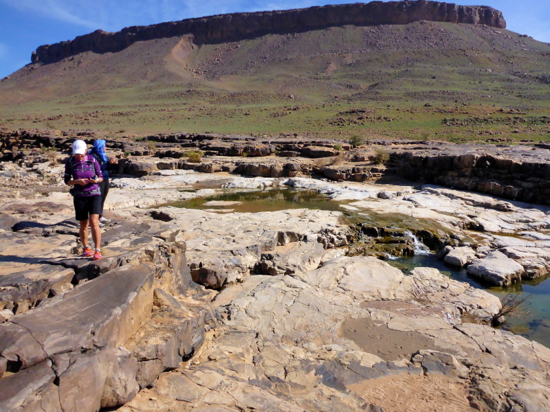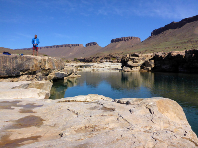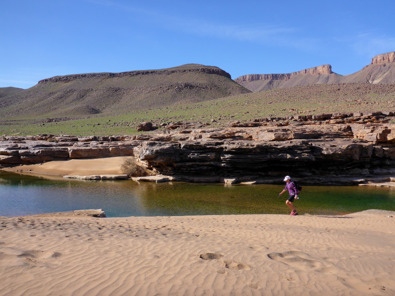 Heute ist eine längere Strecke vorgesehen, aber ohne nennenswerte Höhenmeter. Wir laufen zumeist flach durch oder entlang des Flusses oued Lmhasser, ein Tag inmitten wunderschöner Schluchten, gesäumt von bizarren Tafelbergen. Schließlich erreichen wir den See Amda n´oumssafi, wirklich einladend zum Baden, auch wenn das Wasser eiskalt ist. Lahcen nutzt die Gelegenheit sofort und springt ins kalte Nass.