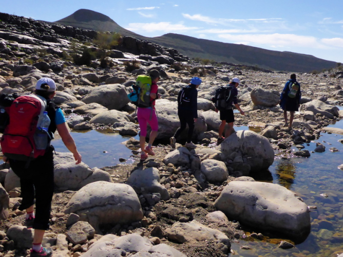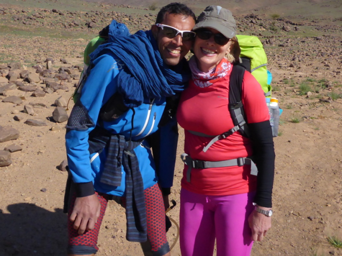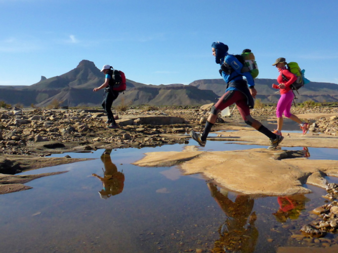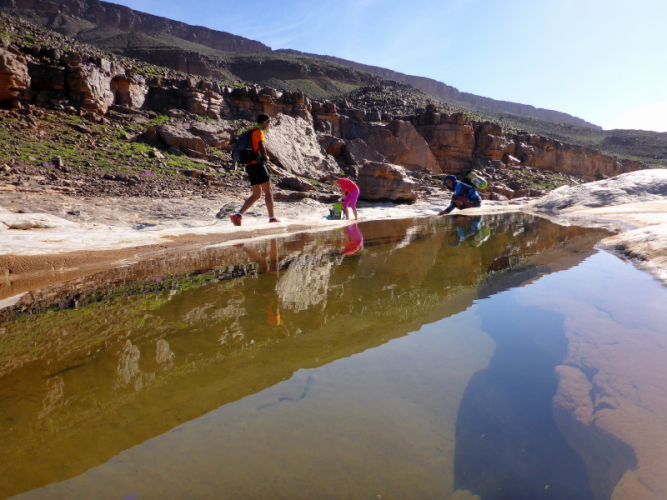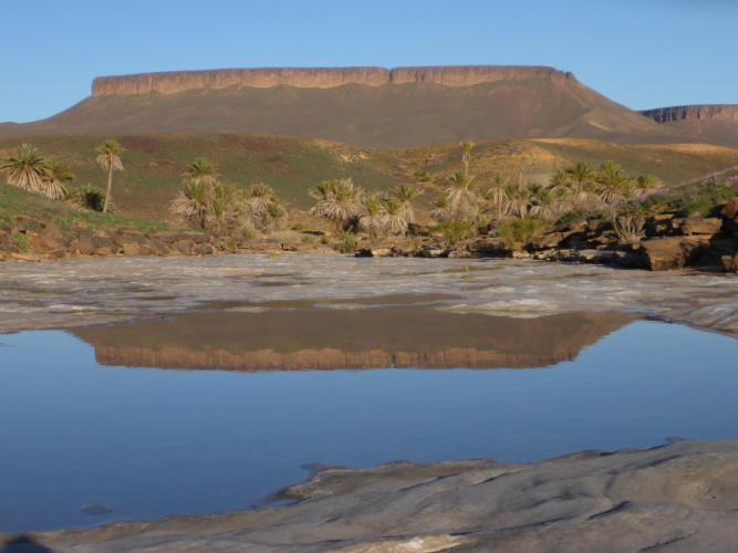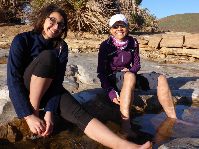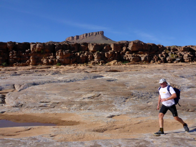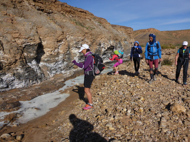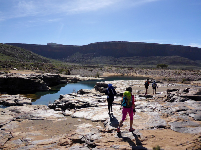 Heute ist eine längere Strecke vorgesehen, aber ohne nennenswerte Höhenmeter. Wir laufen zumeist flach durch oder entlang des Flusses oued Lmhasser, ein Tag inmitten wunderschöner Schluchten, gesäumt von bizarren Tafelbergen. Schließlich erreichen wir den See Amda n´oumssafi, wirklich einladend zum Baden, auch wenn das Wasser eiskalt ist. Lahcen nutzt die Gelegenheit sofort und springt ins kalte Nass.