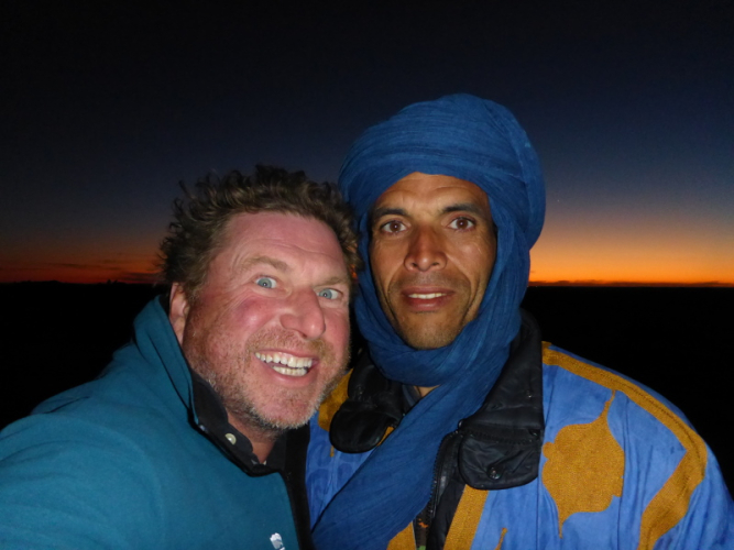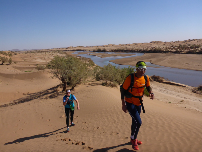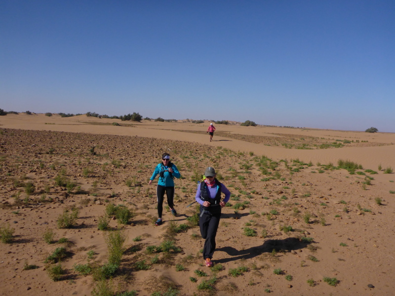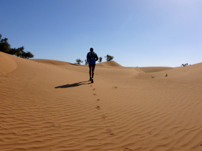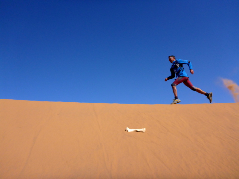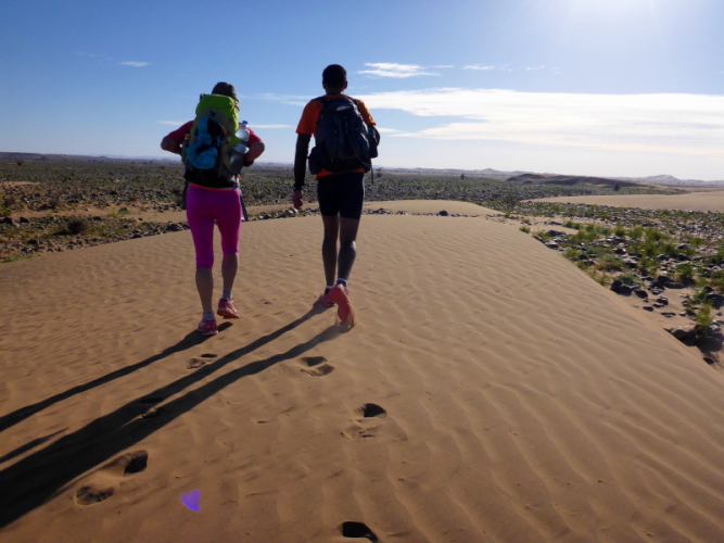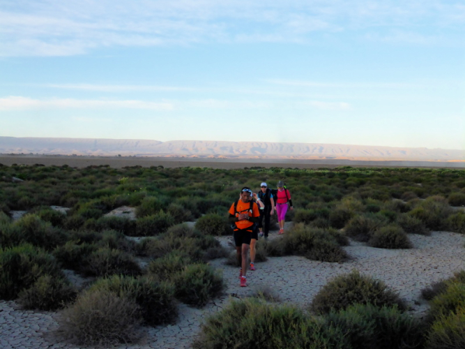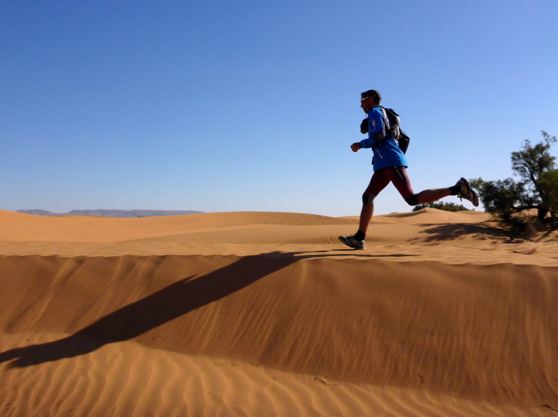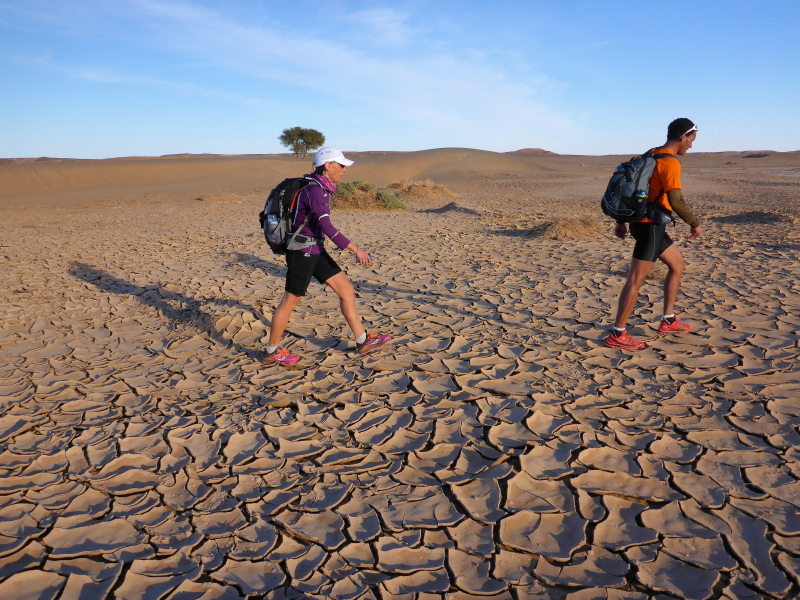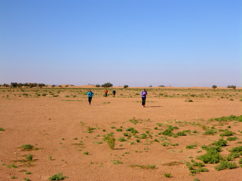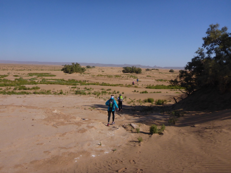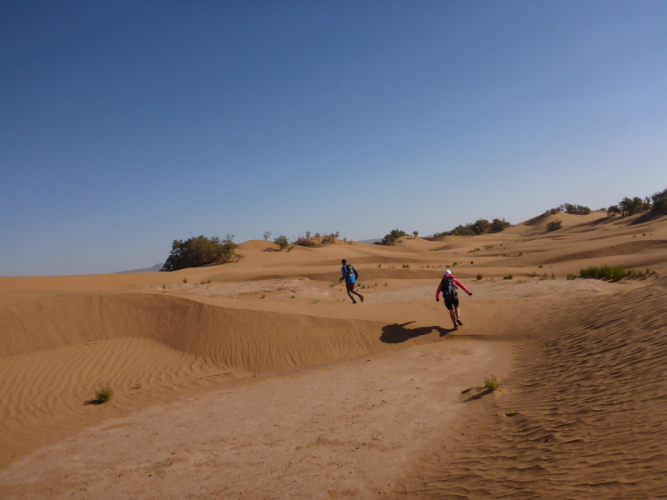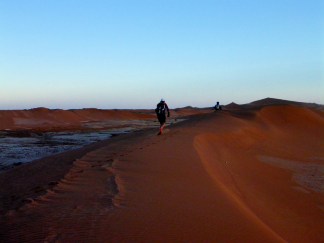Sonnenaufgang am Neujahrstag. Ich laufe mit Lhoucine noch mal auf die Dünen, um die aufgehende Sonne mit ihren warmen Strahlen genießen. Nach dem Frühstück brechen wir dann mit dem Geländewagen auf. Heute ist kein Lauf geplant. Die Strecke wäre mit etwa 60 Kilometern auch viel zu weit. Nur Samir will laufen, Training für den MdS. Er macht sich zeitgleich mit uns auf den Weg.
