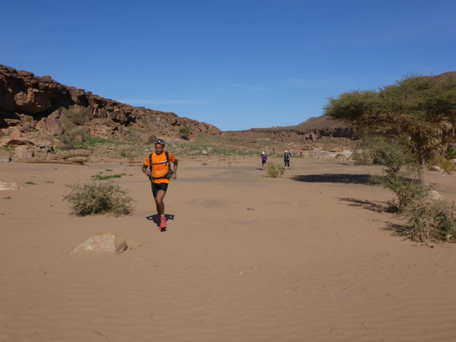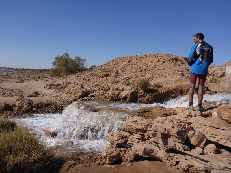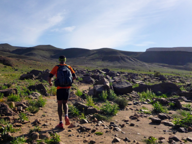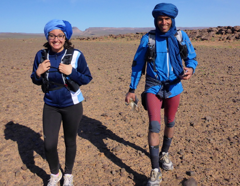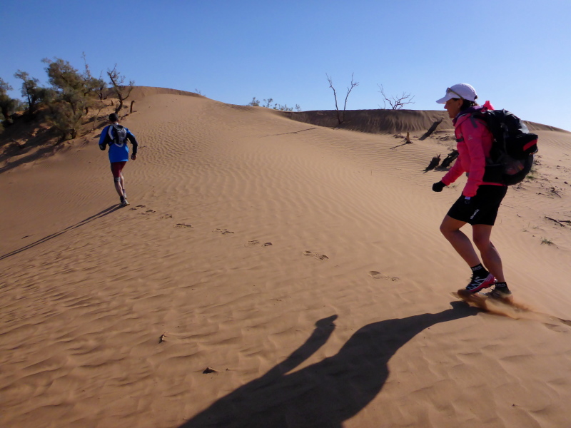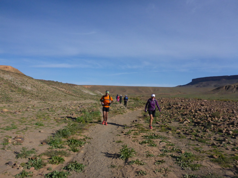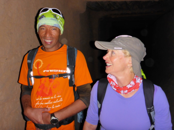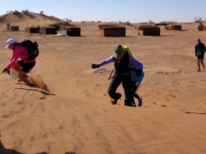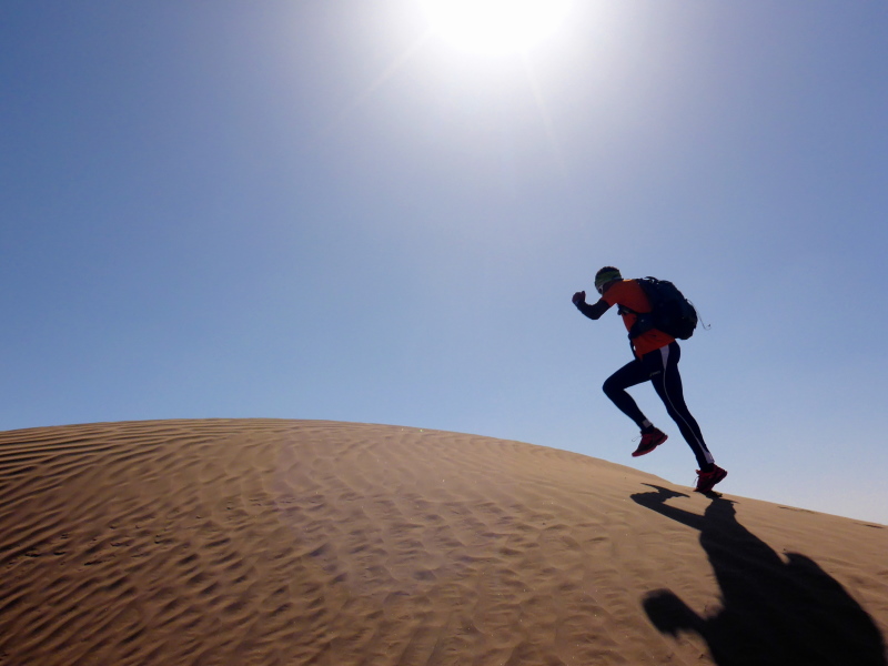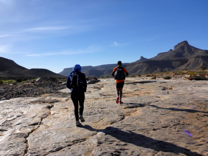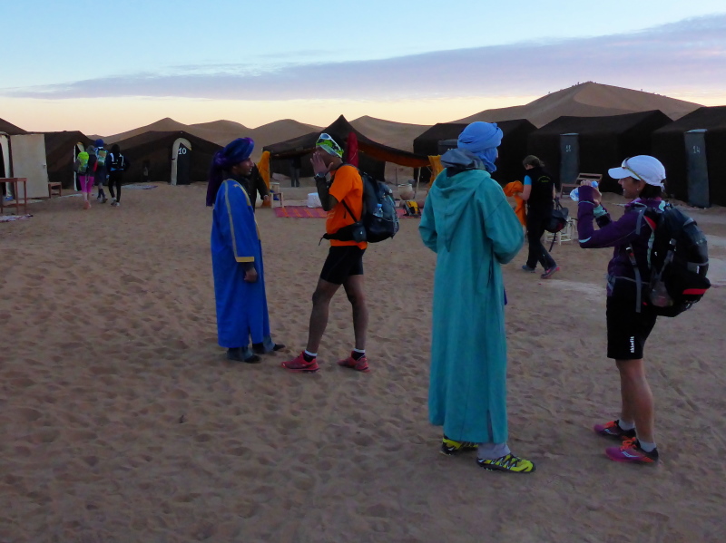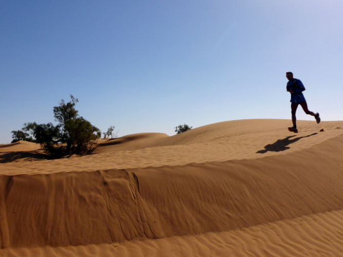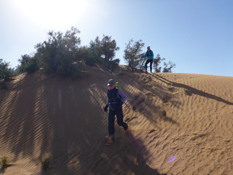 Sonnenaufgang am Neujahrstag. Ich laufe mit Lhoucine noch mal auf die Dünen, um die aufgehende Sonne mit ihren warmen Strahlen genießen. Nach dem Frühstück brechen wir dann mit dem Geländewagen auf. Heute ist kein Lauf geplant. Die Strecke wäre mit etwa 60 Kilometern auch viel zu weit. Nur Samir will laufen, Training für den MdS. Er macht sich zeitgleich mit uns auf den Weg.