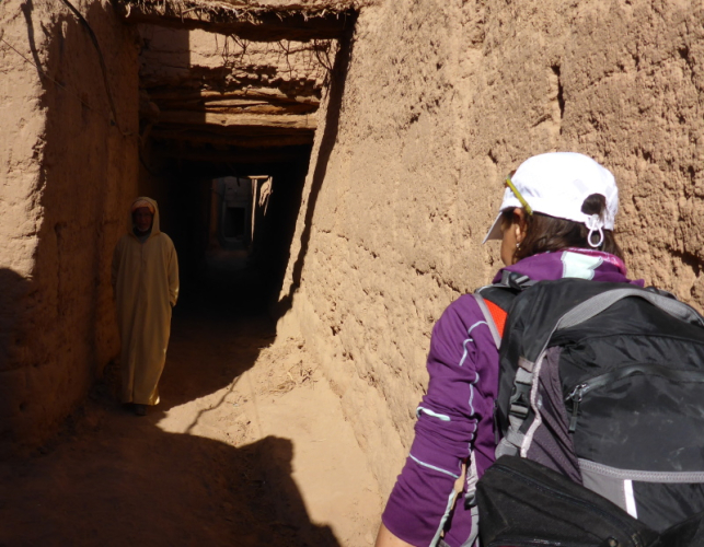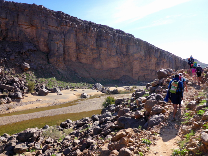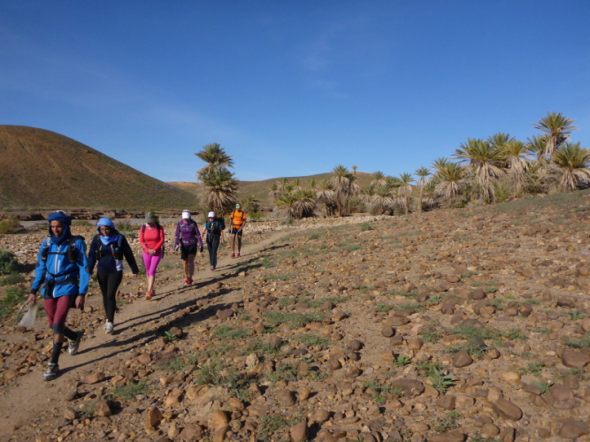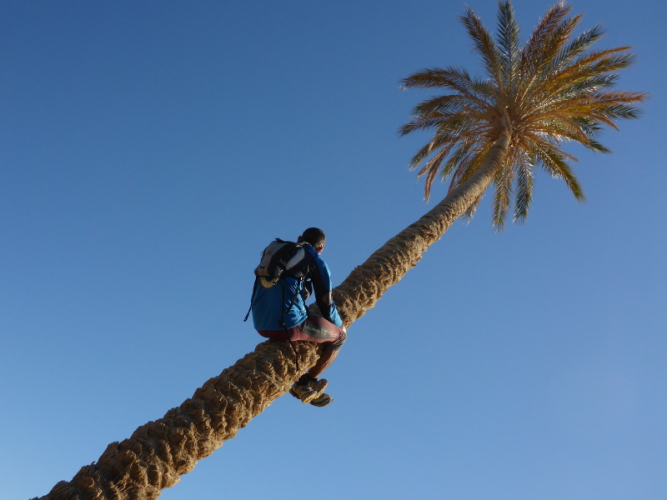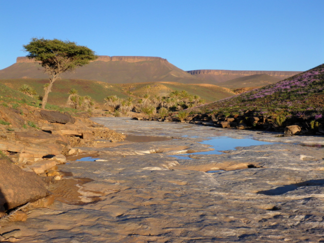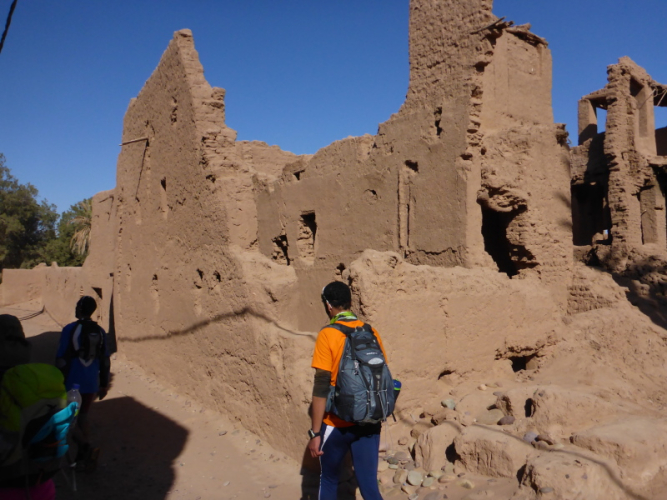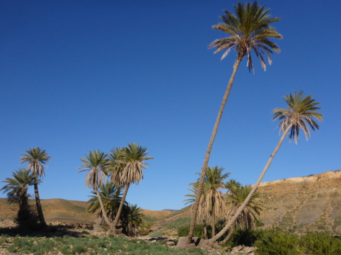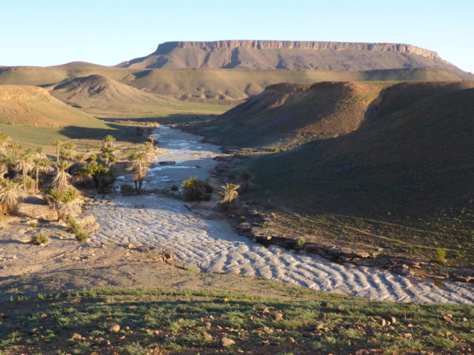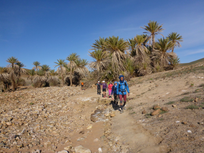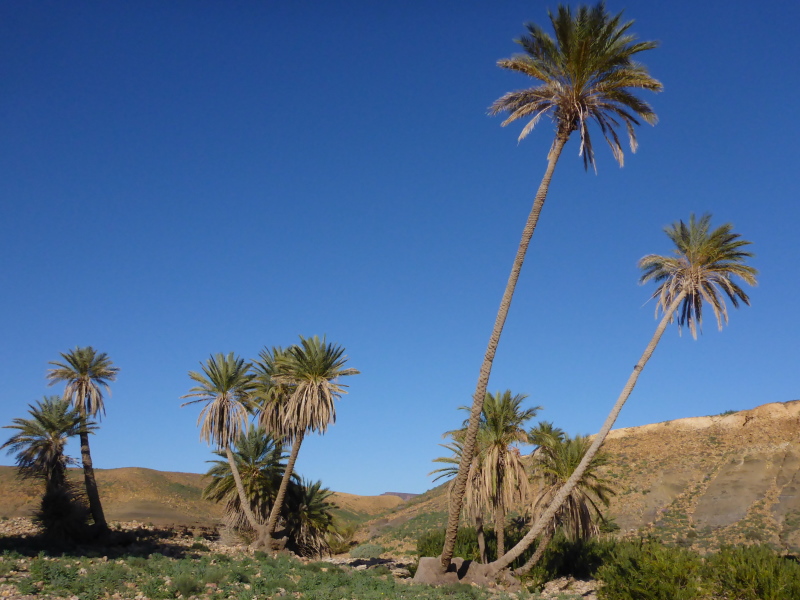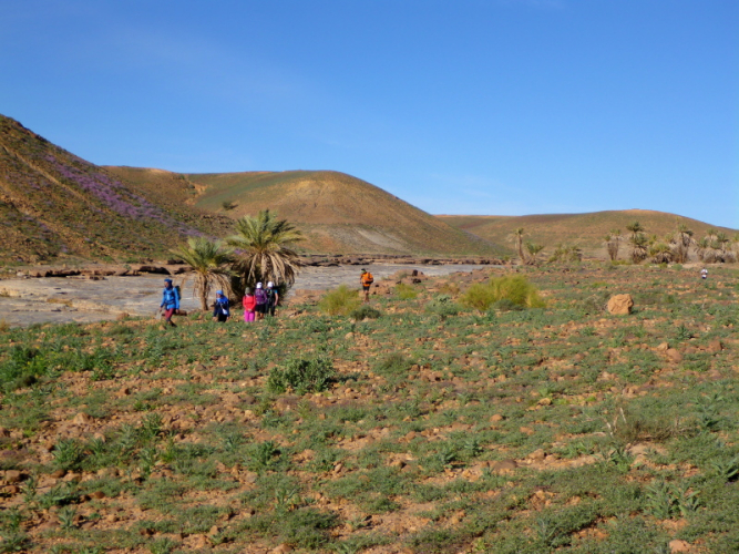 Zurück in Zagora beziehen wir das Hotel La Palmeraie an der Hauptstraße, wo wir auch gemeinsam zu Abend essen. Für Joe geht am nächsten Morgen um 6 Uhr der Bus nach Marrakech - ein großer Abschied! Unser letzter Tag in Zagora gehört dem Zagora-Berg. Lhoucine begleitet uns dorthin und wandert mit uns durch die Oasen und am Fluss Draa entlang.